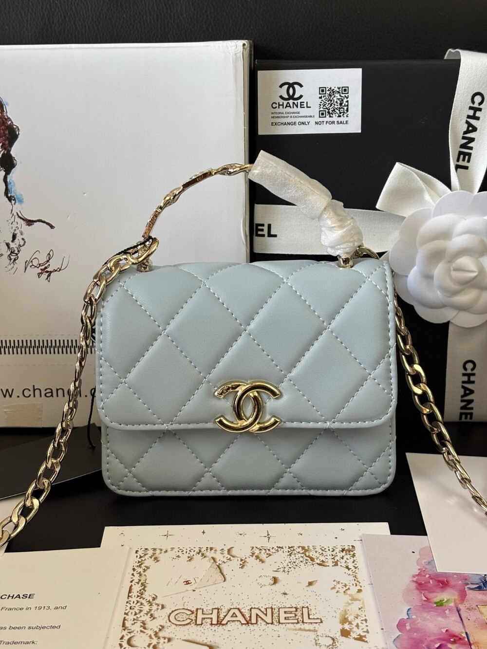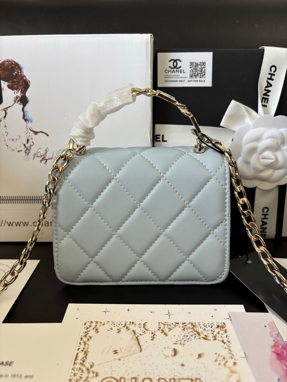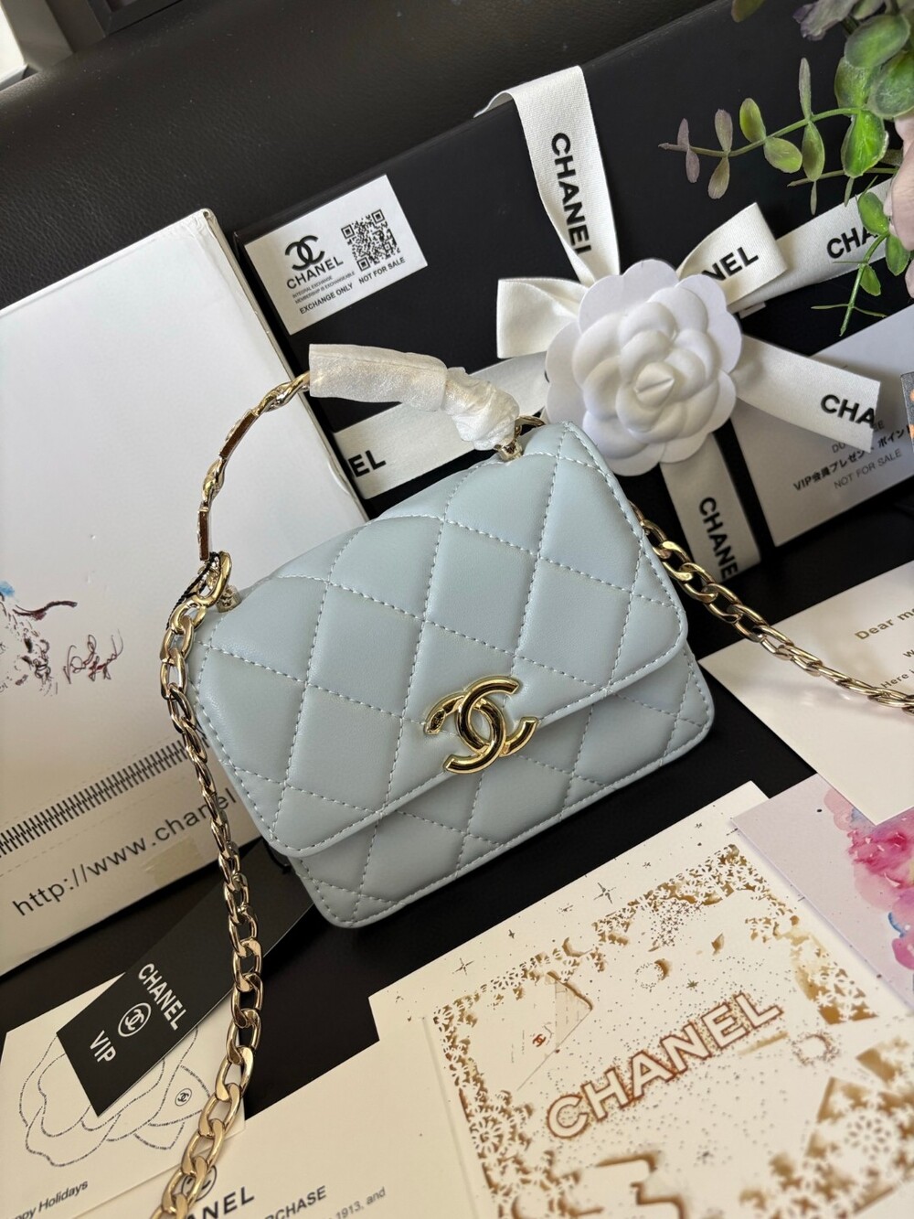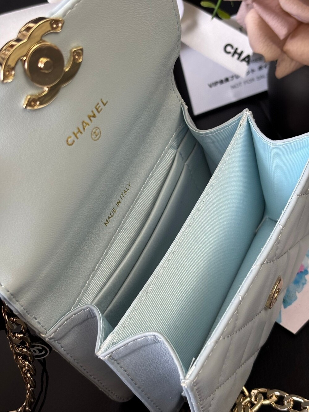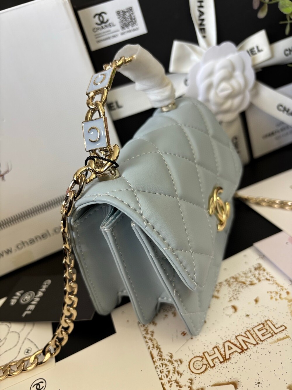 This Chanel 22S Mini Vanity Bag in a soft baby blue tone is the perfect seasonal accessory.Designed with a glossy enamel handle, soft matte texture, and detachable chain strap,this VIP gift-exclusive item combines charm with practicality.
