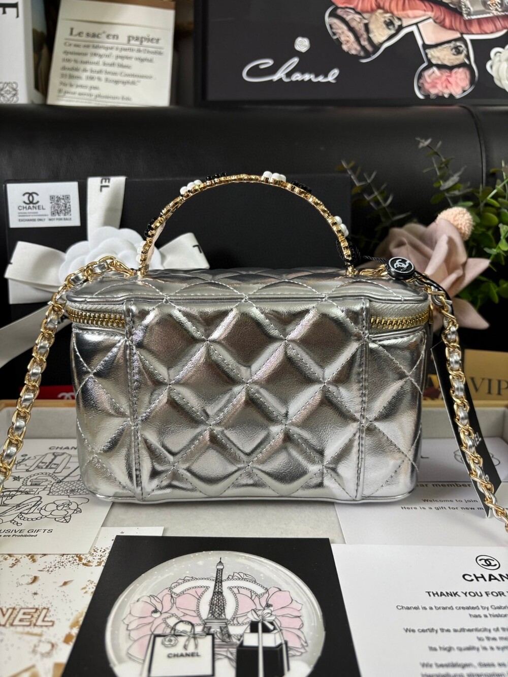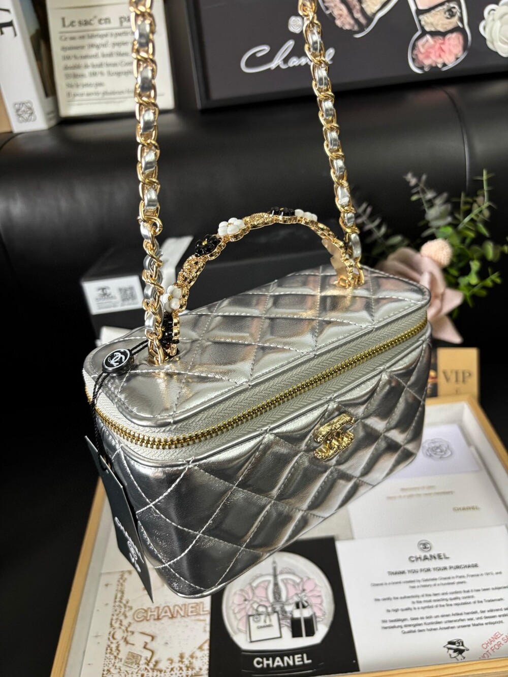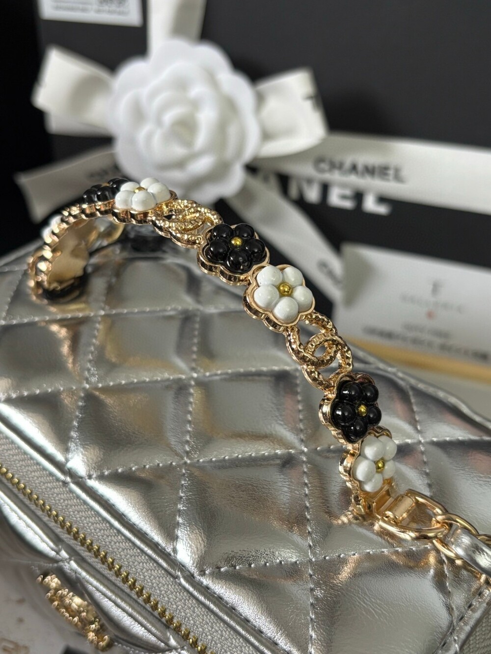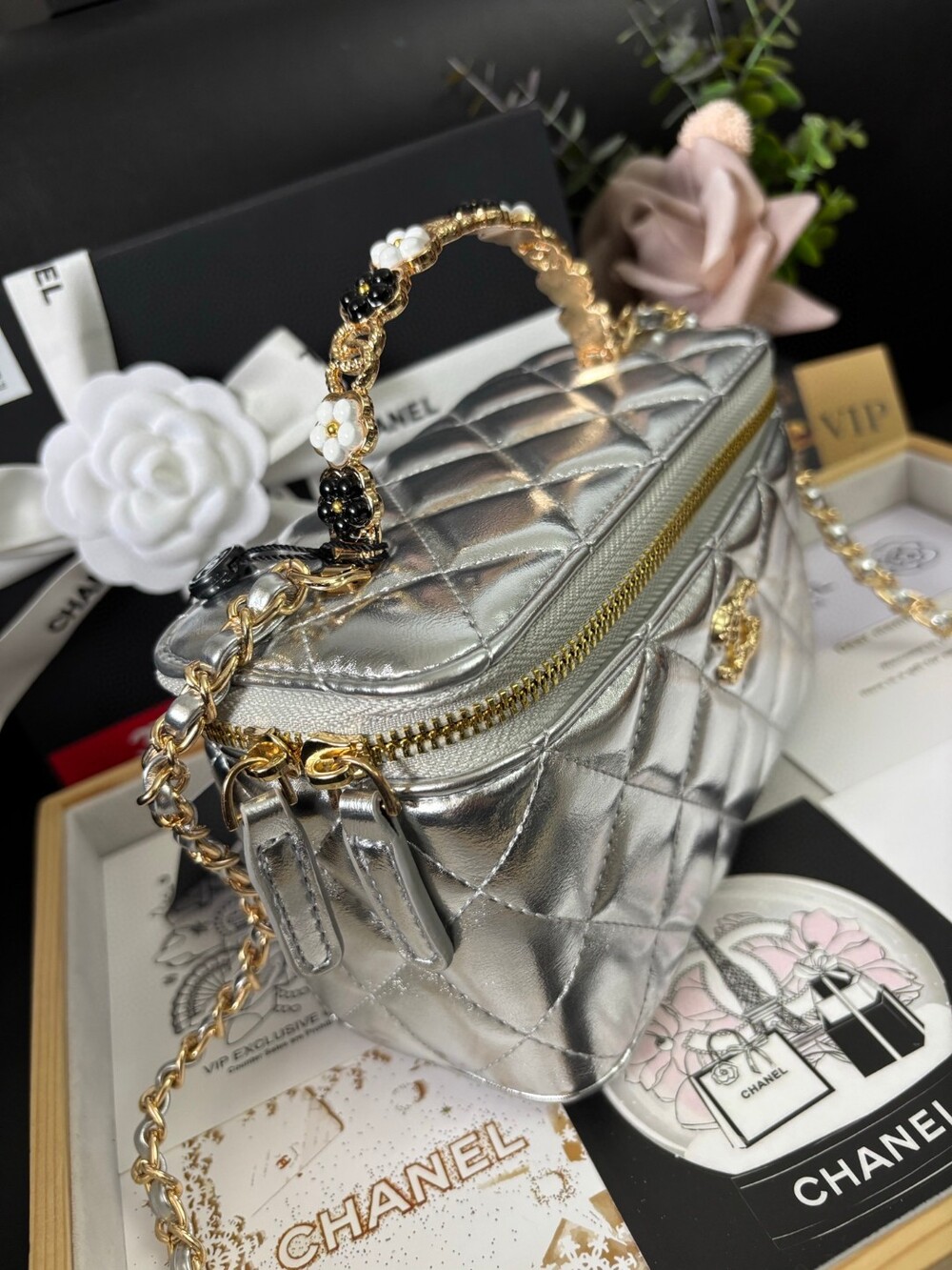This Chanel 23K Camellia Handle Mini Box Bag is a standout piece from the 2023 Fall/Winter collection.Designed with a structured glossy body, delicate enameled camellia flower handle, and a brushed gold-tone logo clasp,it’s both playful and elegant — perfect for day-to-night styling.Ideal as a mini vanity case or statement mini bag, and can be worn by hand, over the shoulder, or crossbody.Size: 18 × 9 × 11cmIncludes: Full VIP packaging + exclusive "Not for Sale" inner tag