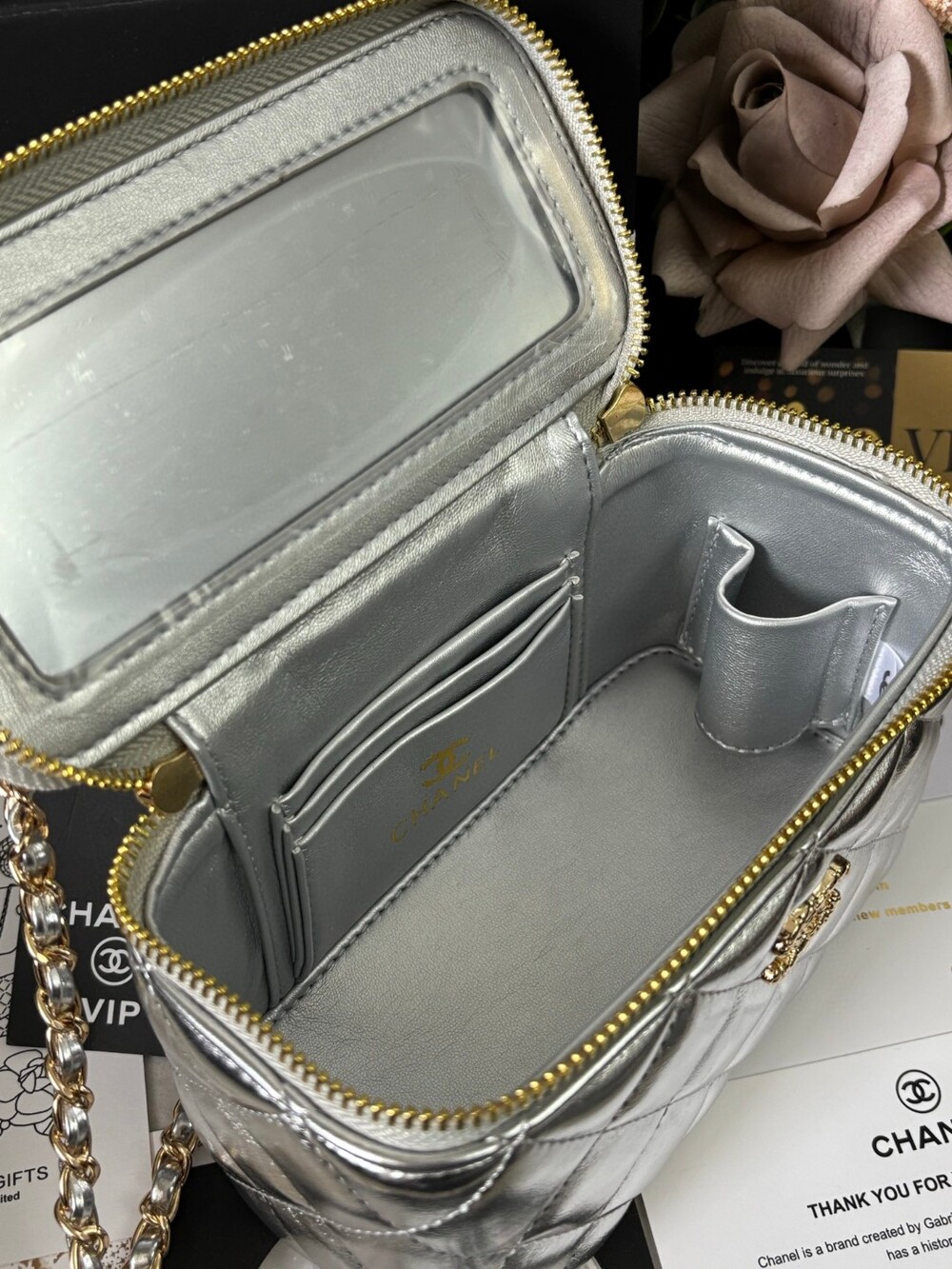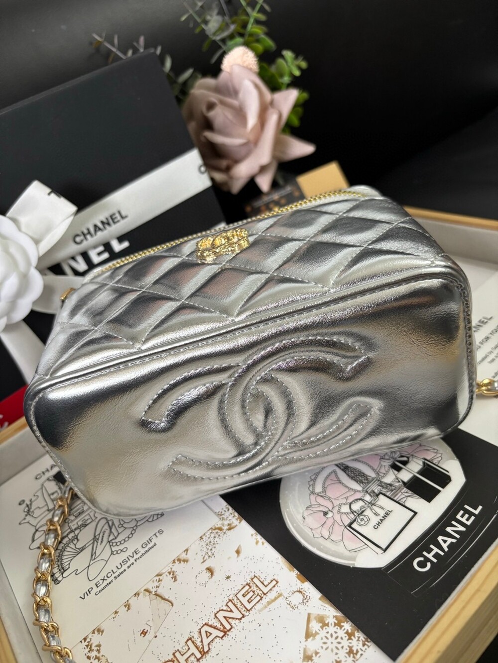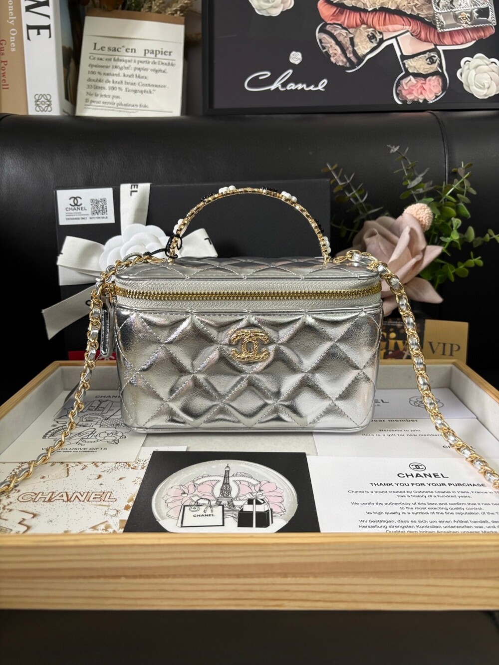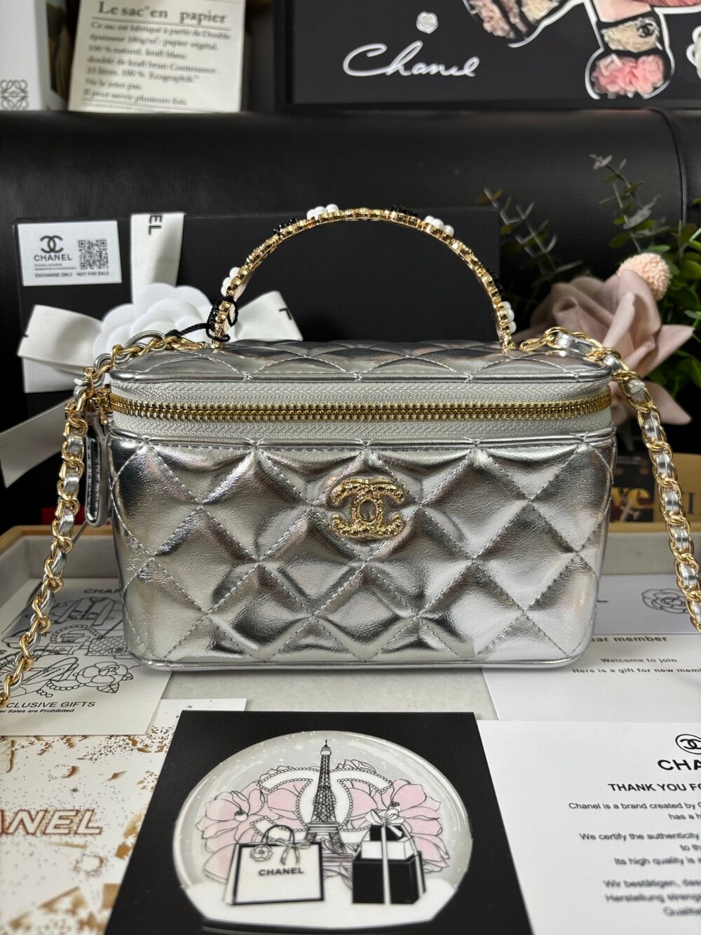 This Chanel 23K Camellia Handle Mini Box Bag is a standout piece from the 2023 Fall/Winter collection.Designed with a structured glossy body, delicate enameled camellia flower handle, and a brushed gold-tone logo clasp,it’s both playful and elegant — perfect for day-to-night styling.Ideal as a mini vanity case or statement mini bag, and can be worn by hand, over the shoulder, or crossbody.Size: 18 × 9 × 11cmIncludes: Full VIP packaging + exclusive "Not for Sale" inner tag