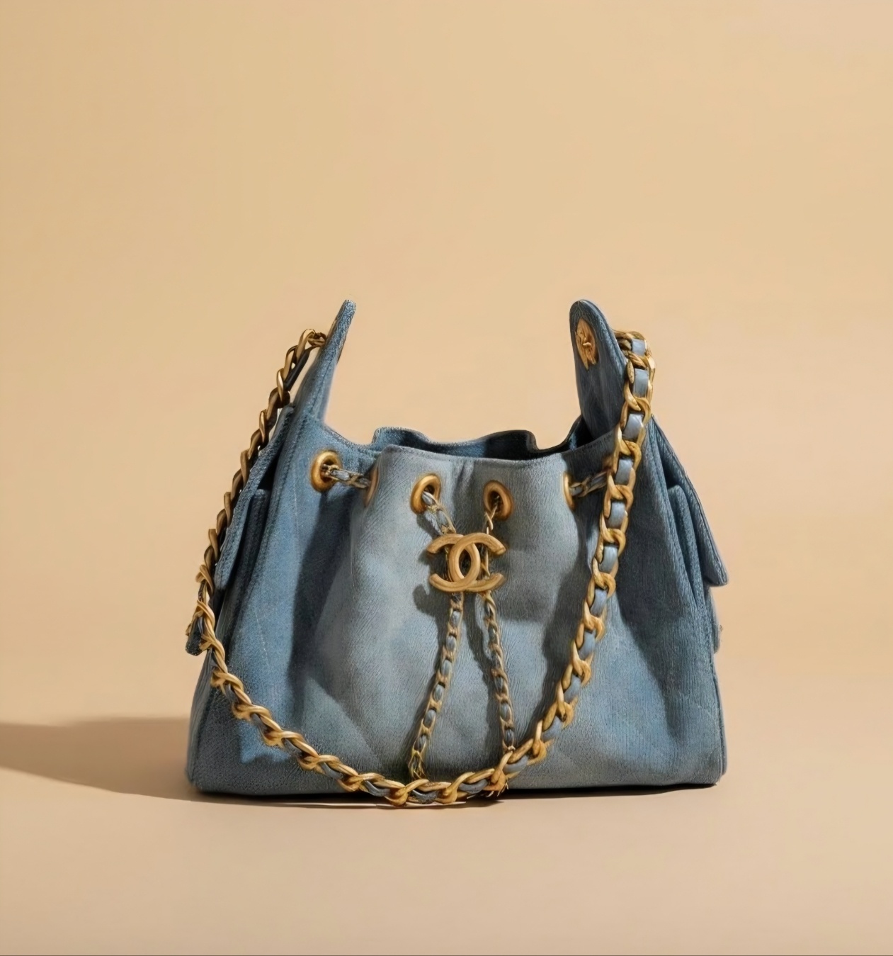 부드러운 데님 텍스처와 골드 체인 디테일이 조화를 이루며
