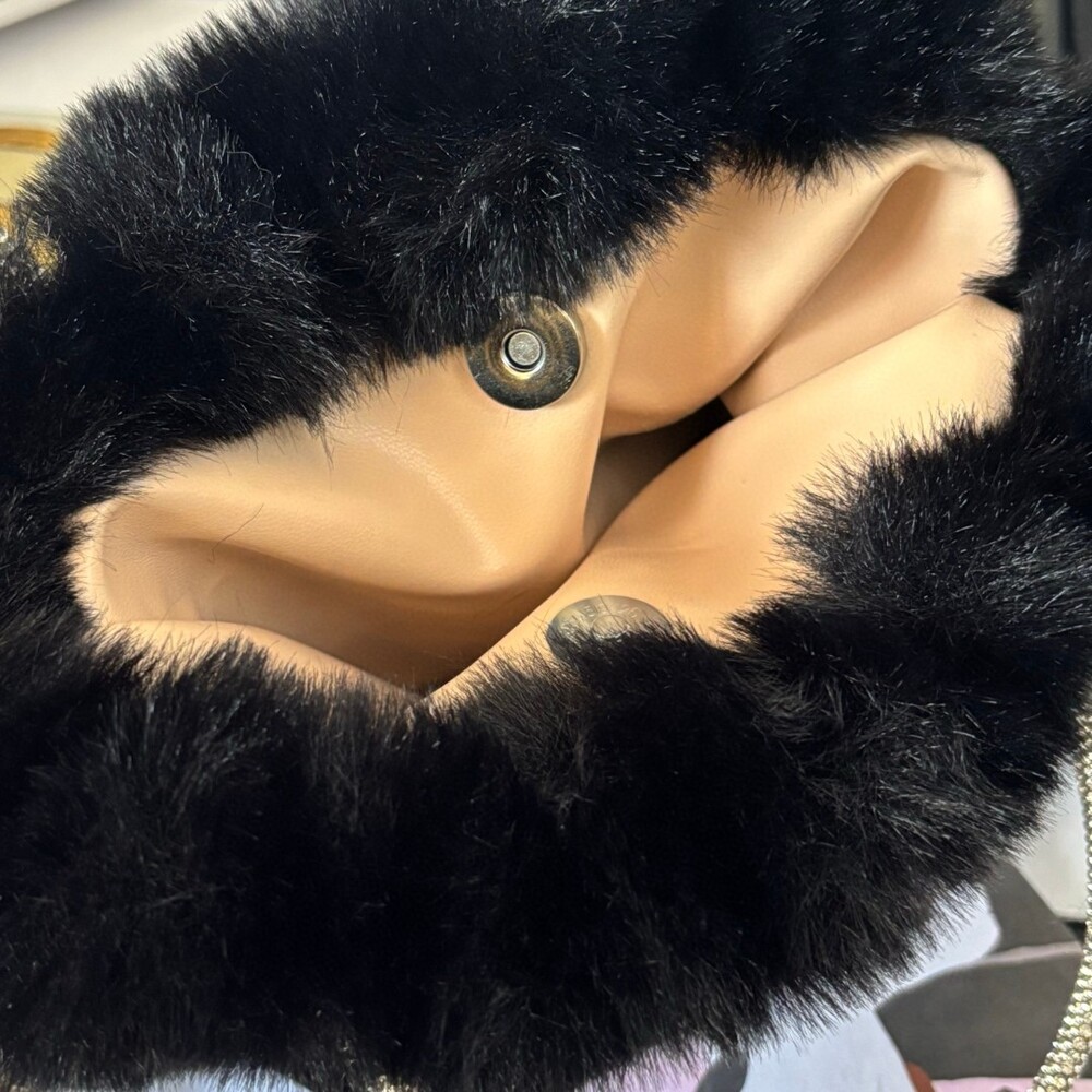 Crafted from ultra-soft faux fur with a gleaming metal chain strap,