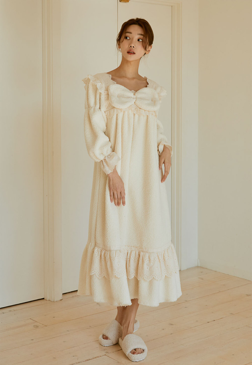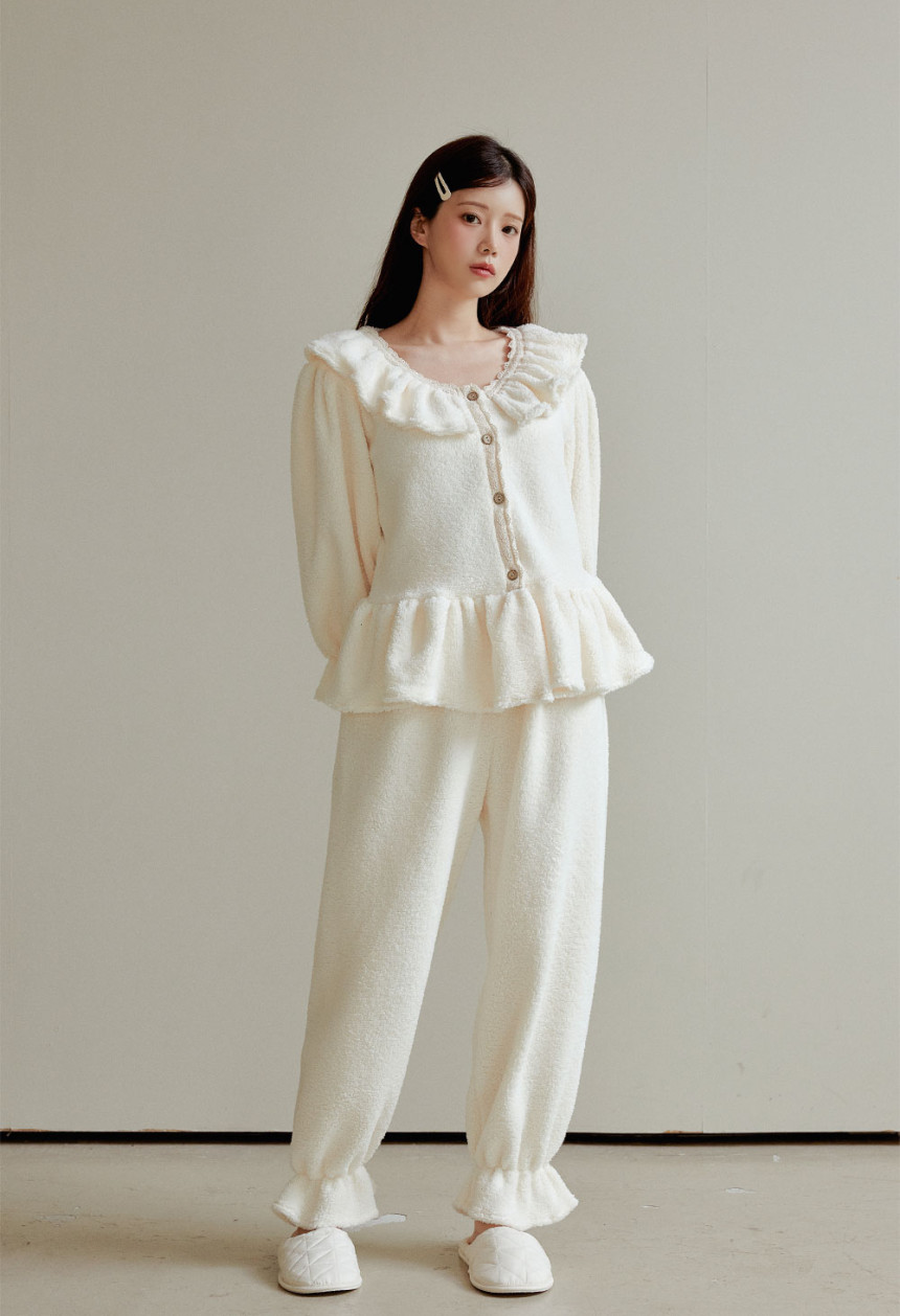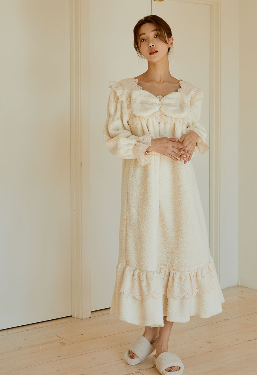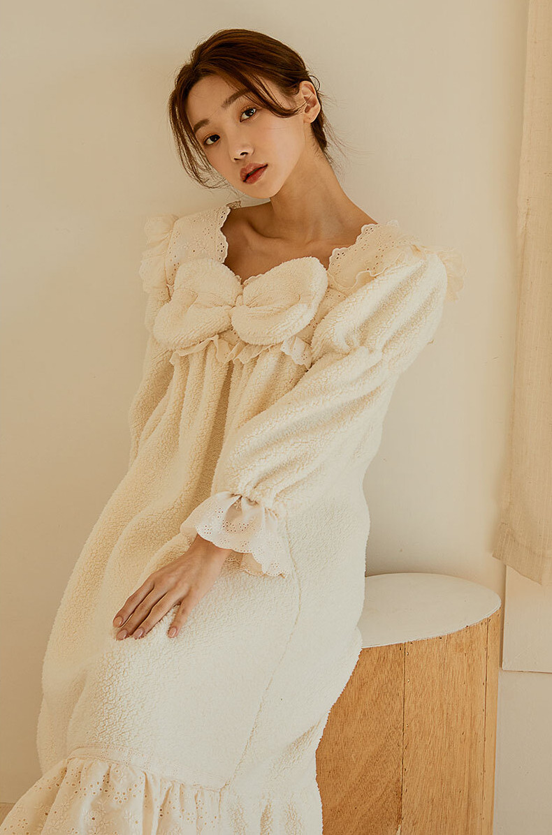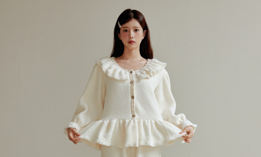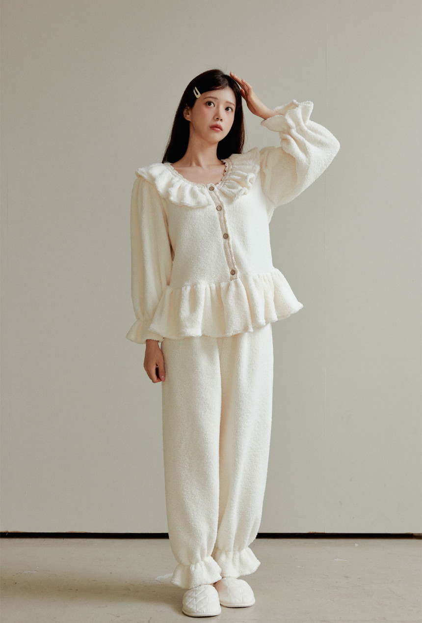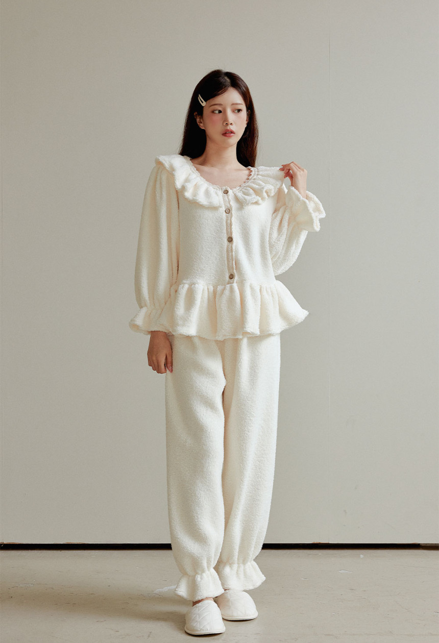 여성 플랫치노 리본 러플 양털 투피스 수면 잠옷
