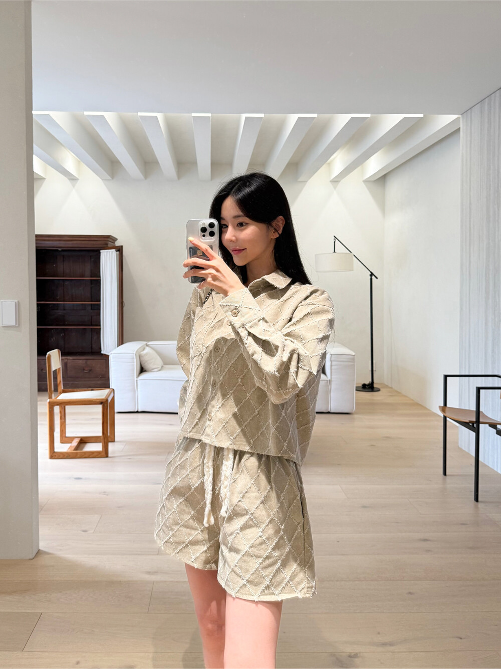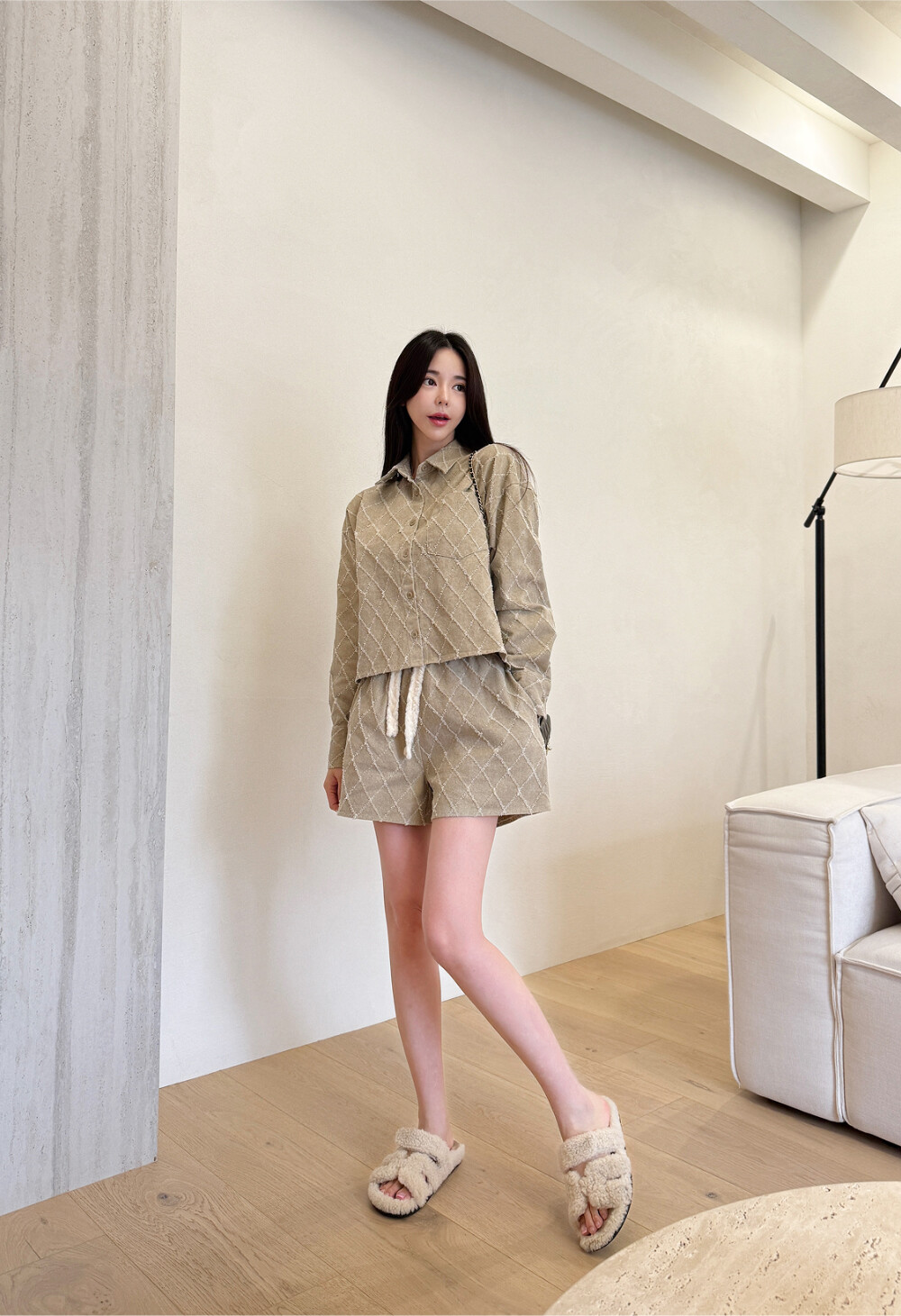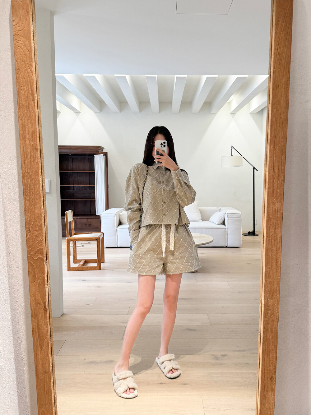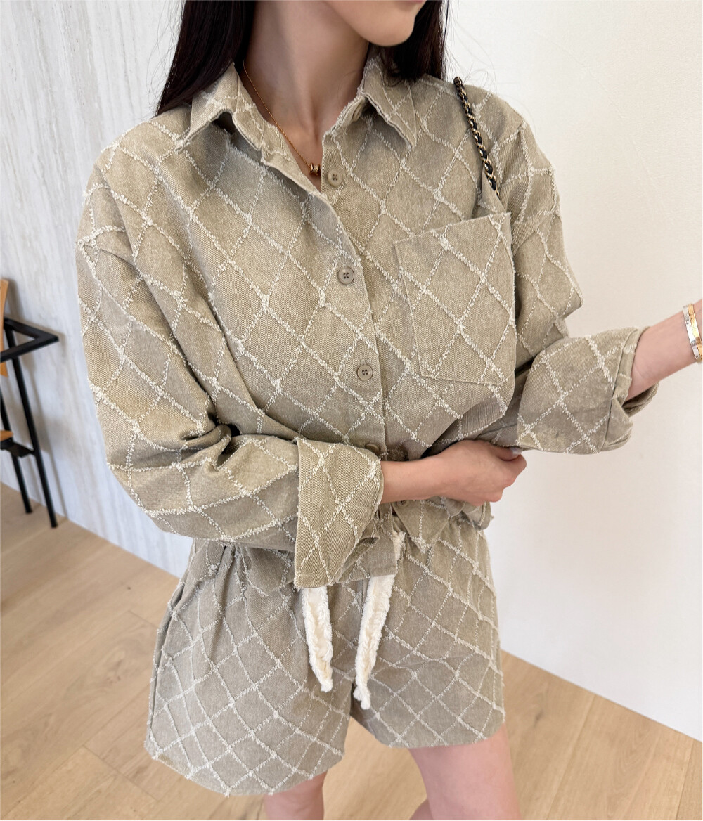 루즈한 셔츠와 와이드 쇼츠가 여유로운 실루엣을 완성합니다.