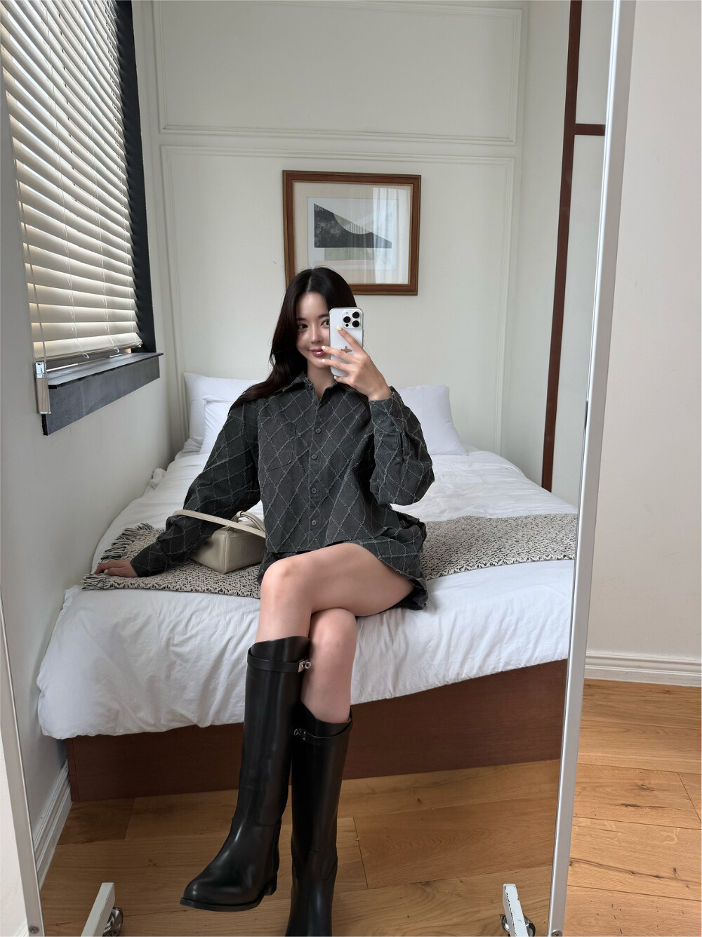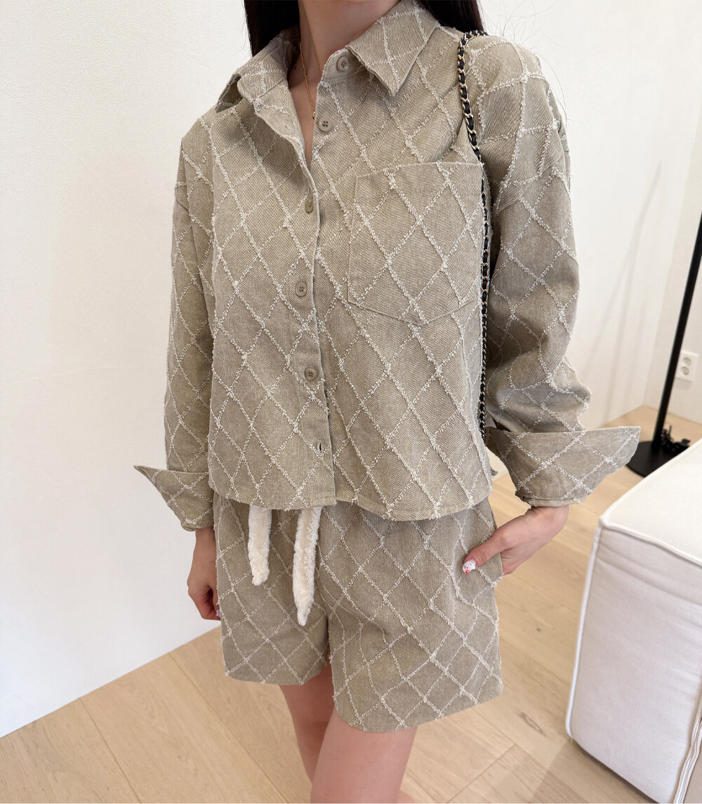 고급 브랜드 퀼팅을 연상시키는 입체적인 다이아몬드 체크 패턴이