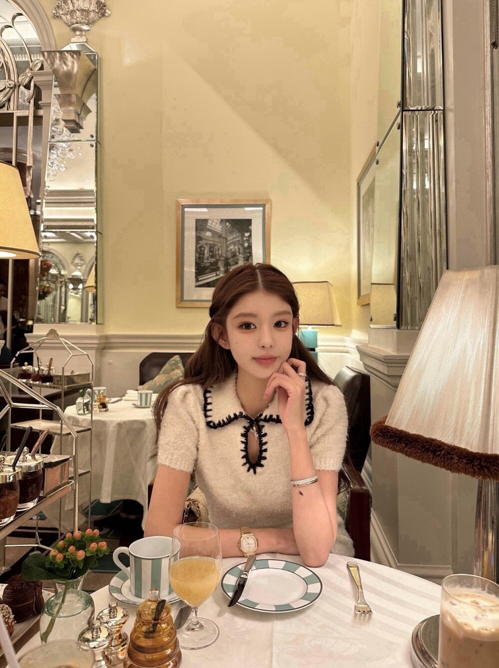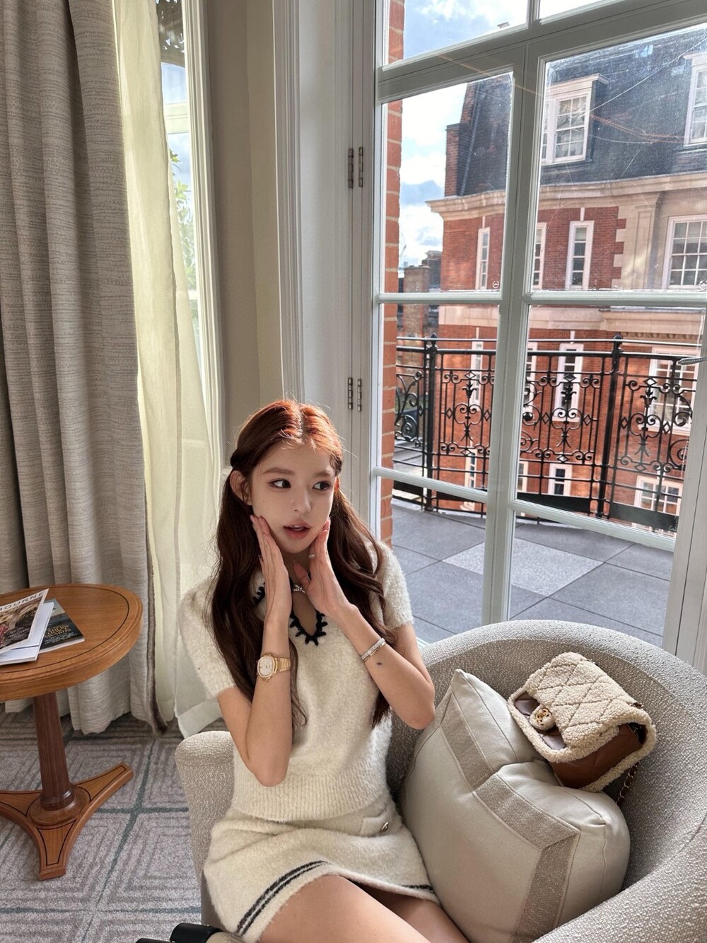 네크라인의 리본 브로치와 슬릿 디테일이 우아함을 더하고,