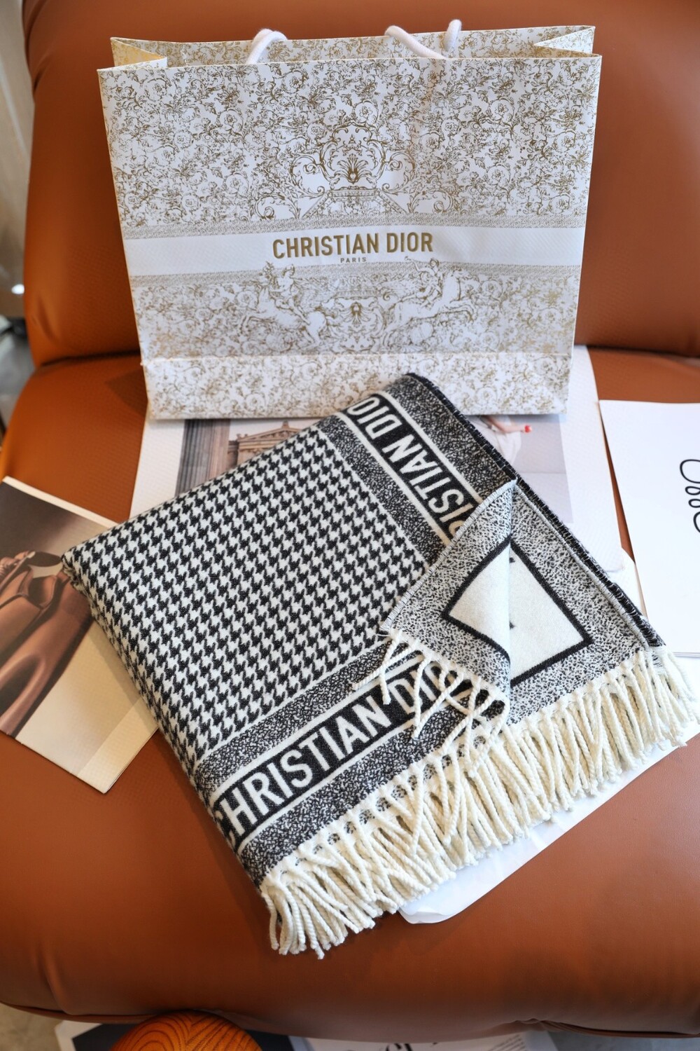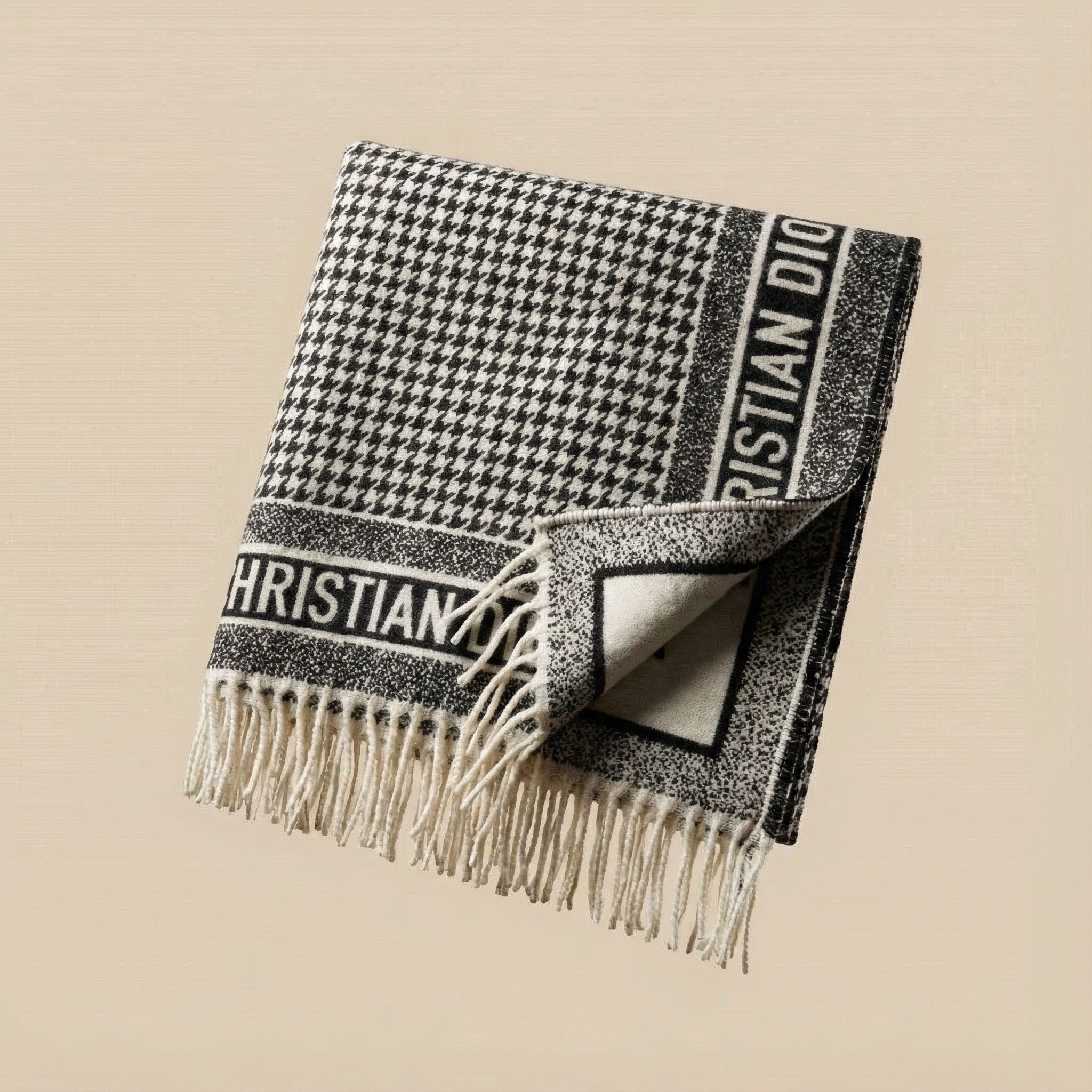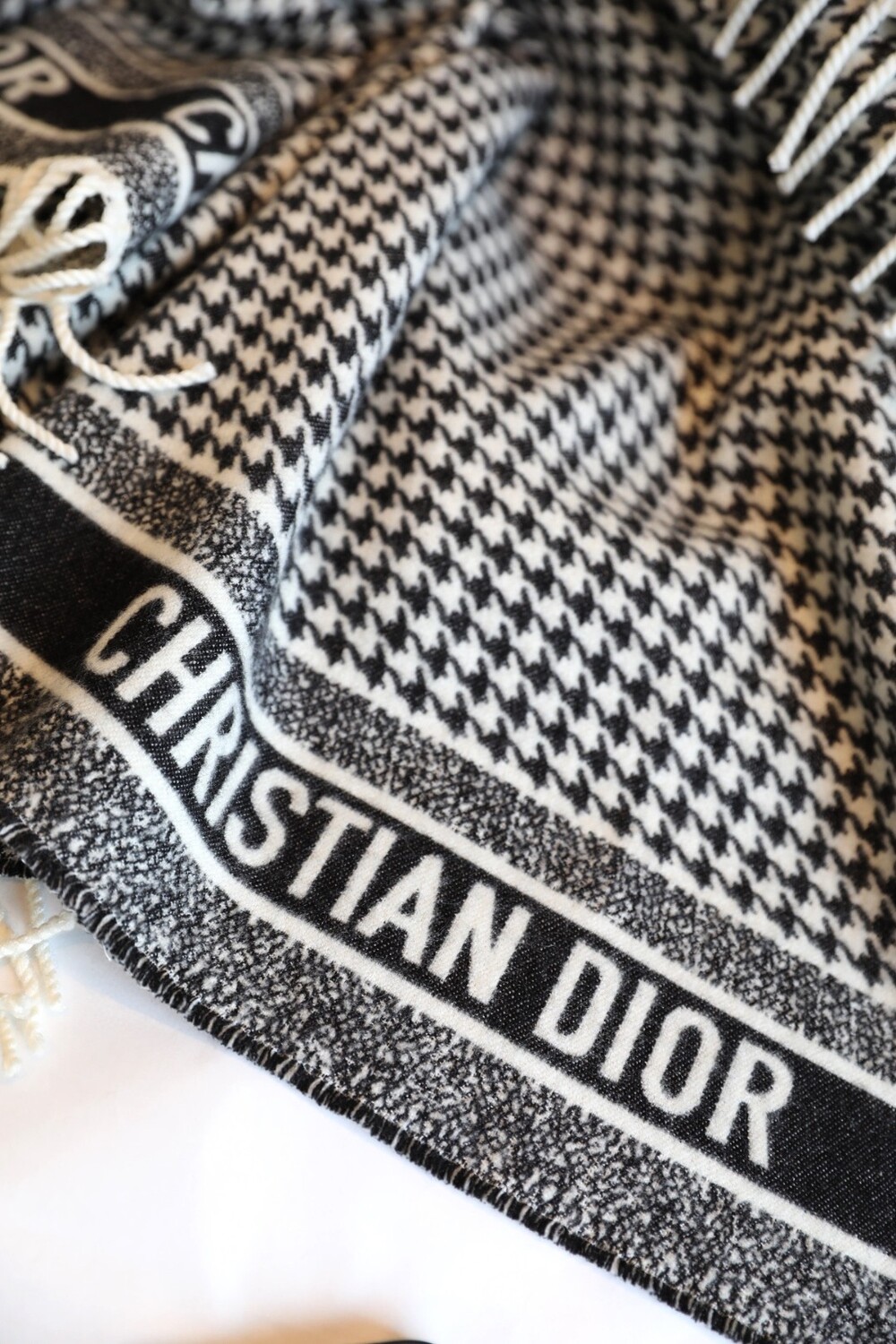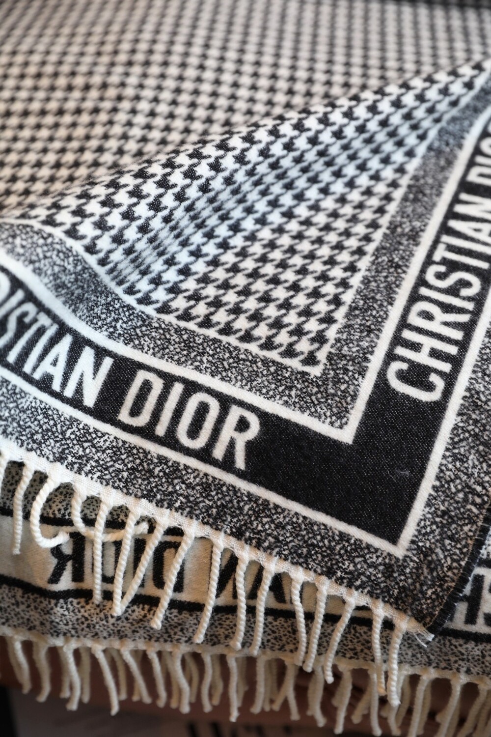 The iconic black-and-white houndstooth pattern is elevated with fringe detailing and the signature CHRISTIAN DIOR logo, adding a luxurious statement to any outfit.