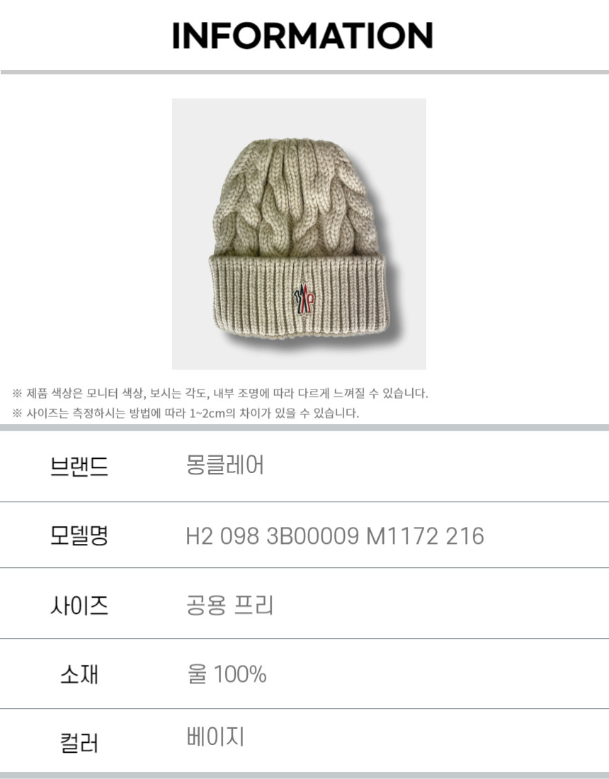 몽클레어 꽈배기 비니 베이지 H2 098 3B00009 M1172 216