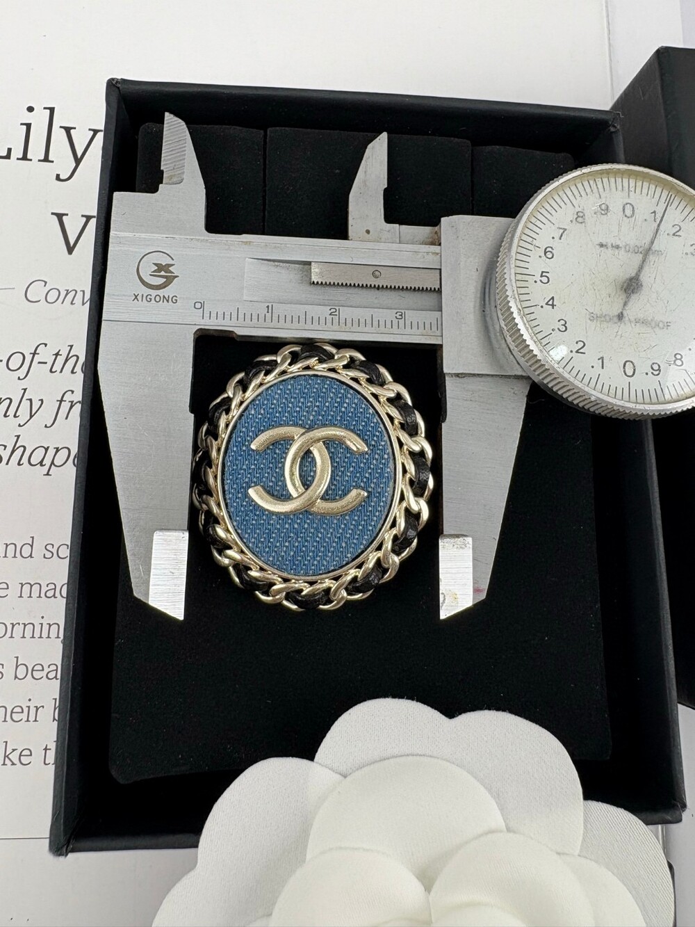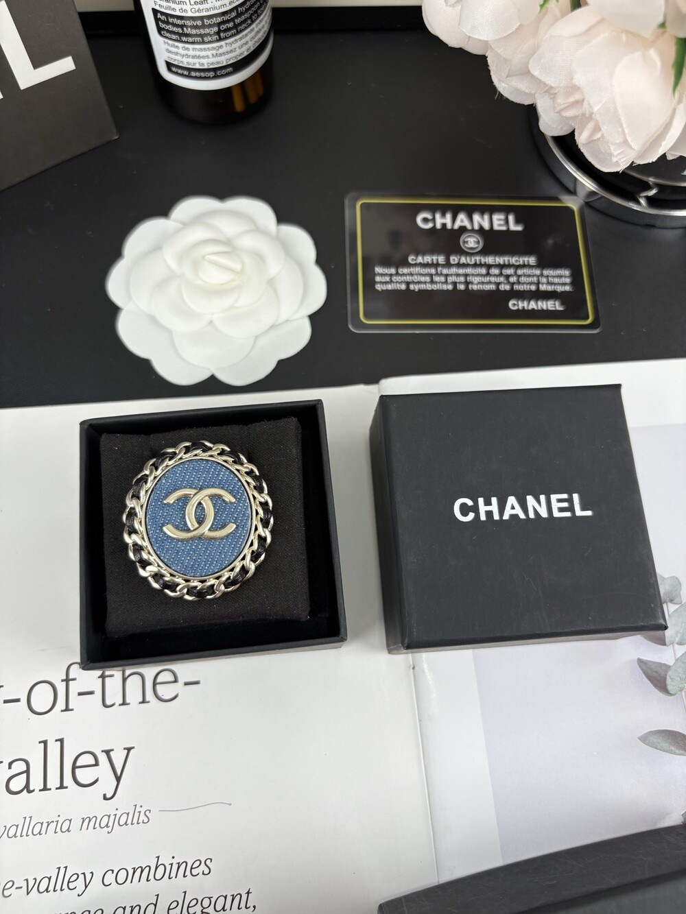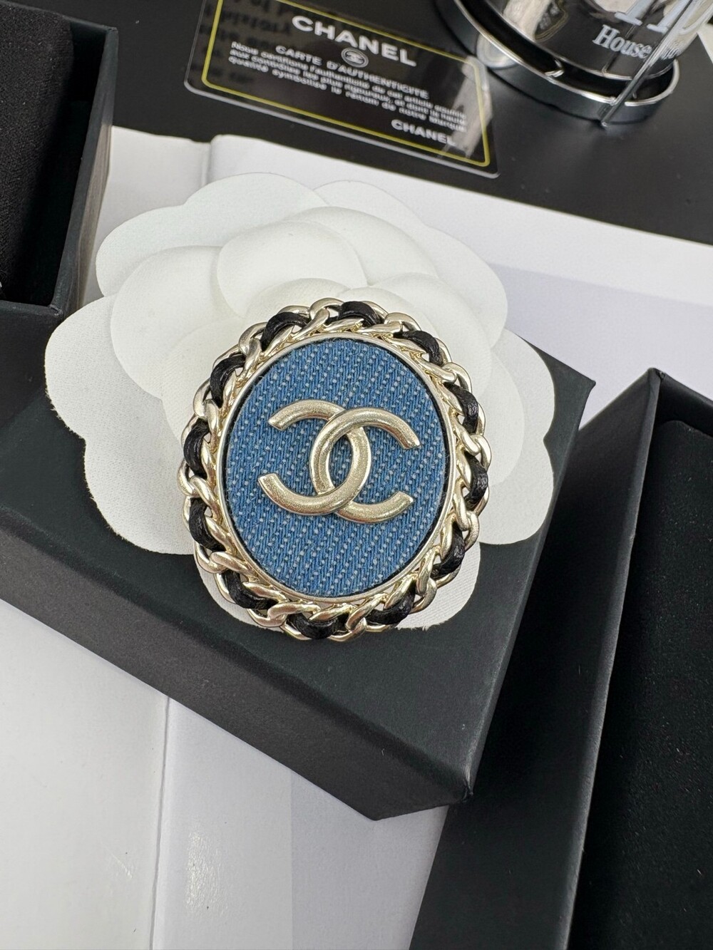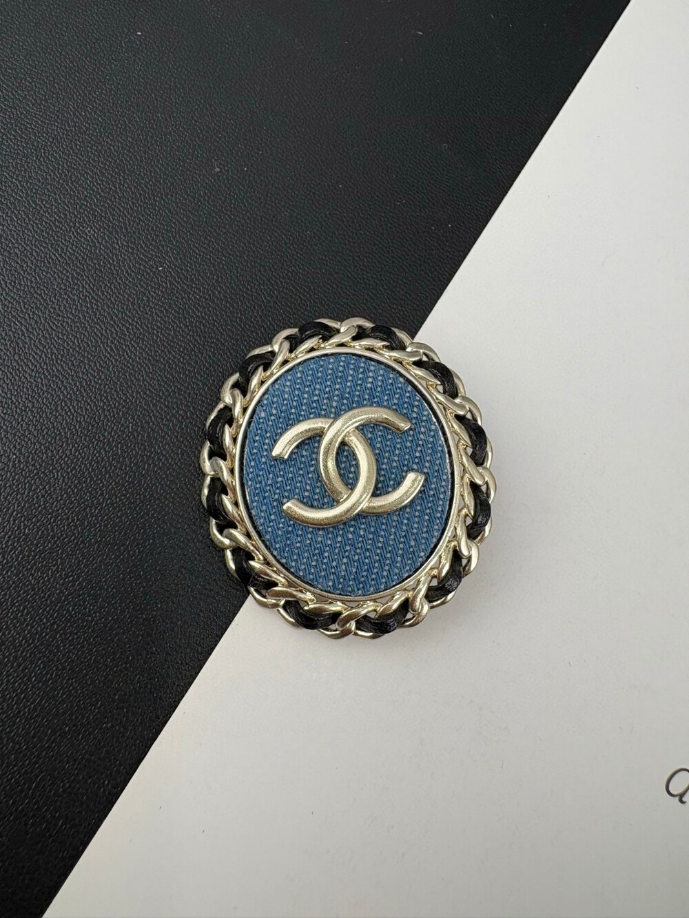 샤넬만의 감성을 데님 원단으로 담아낸 빈티지 무드의 브로치.