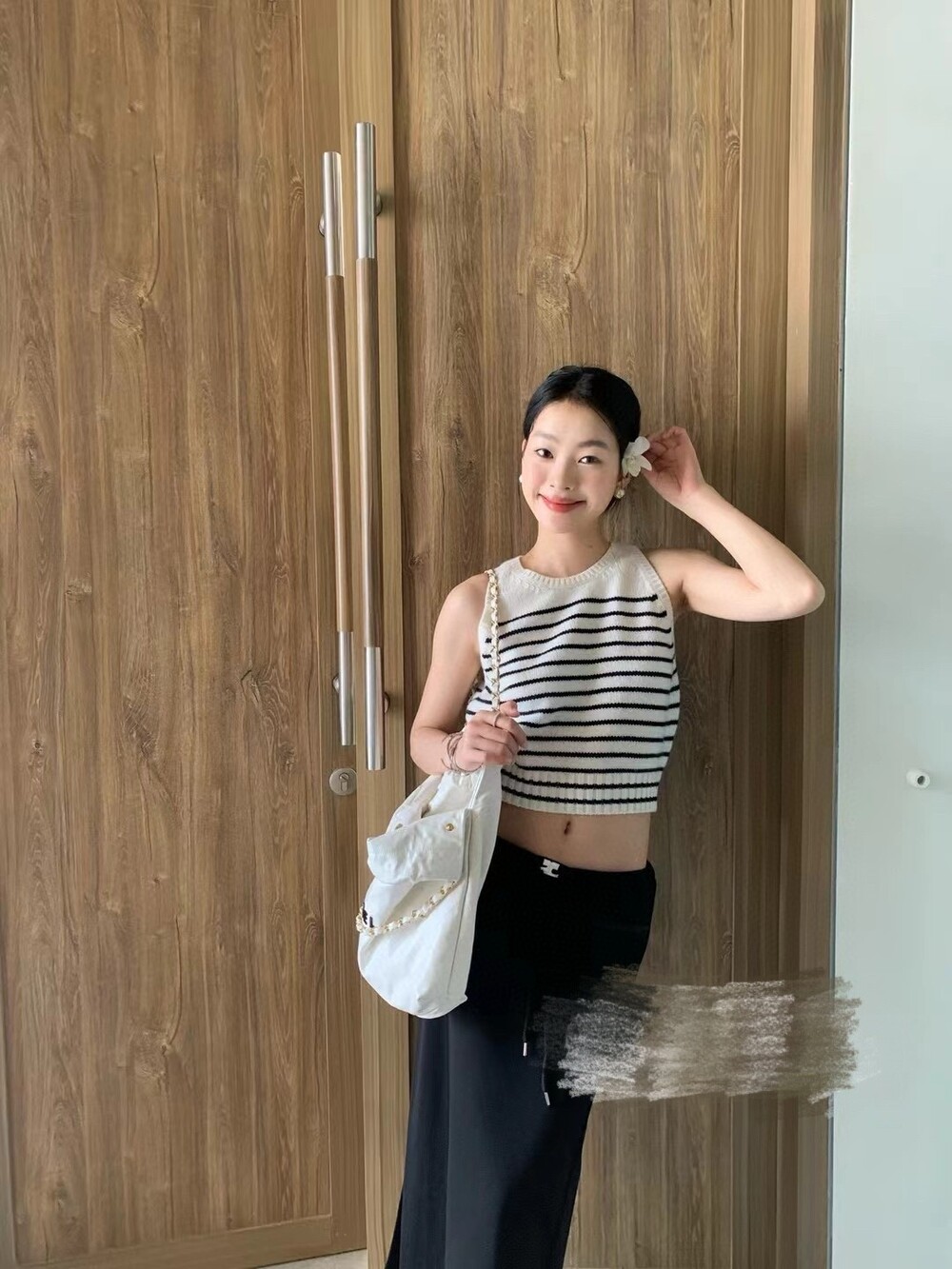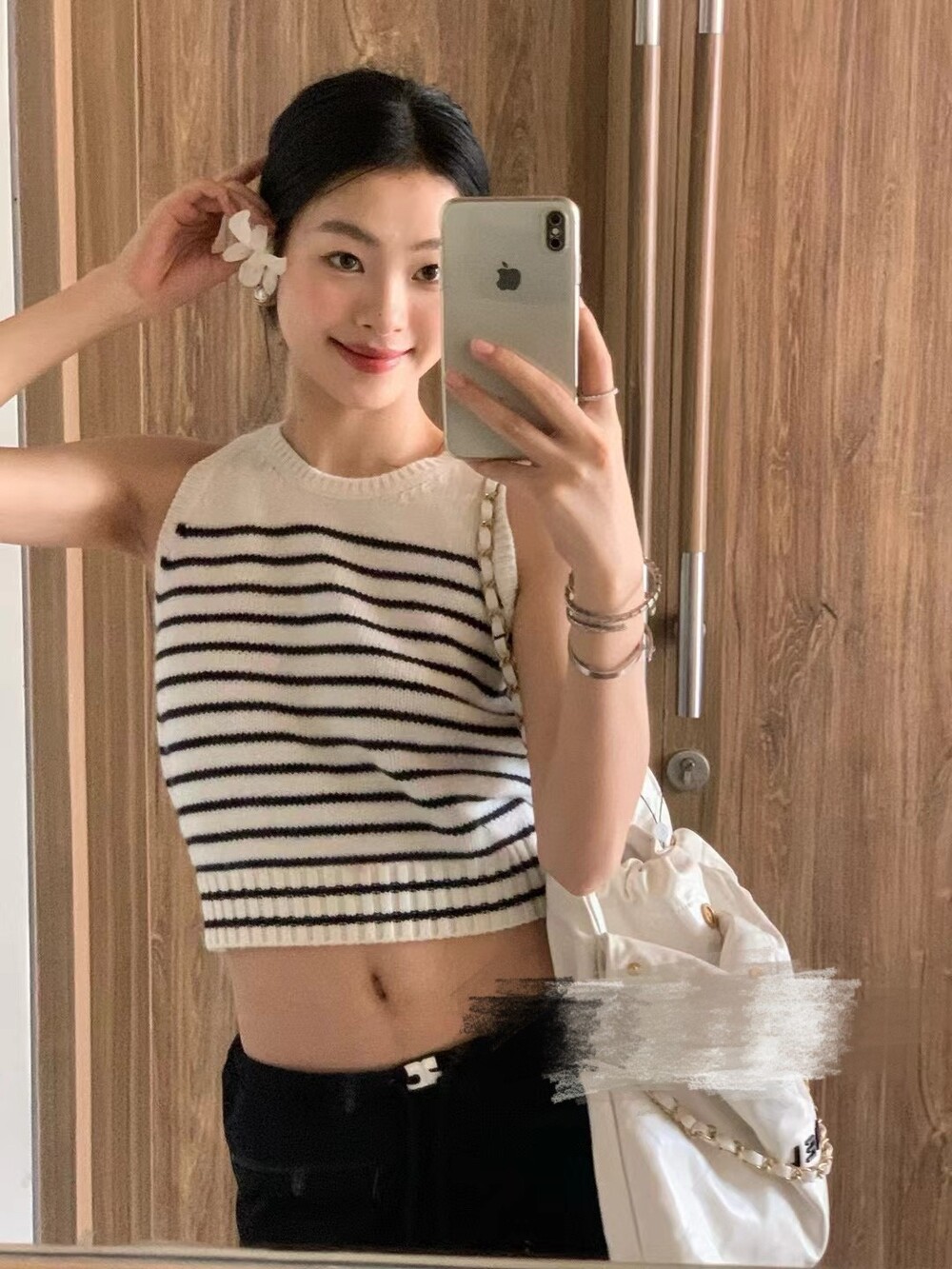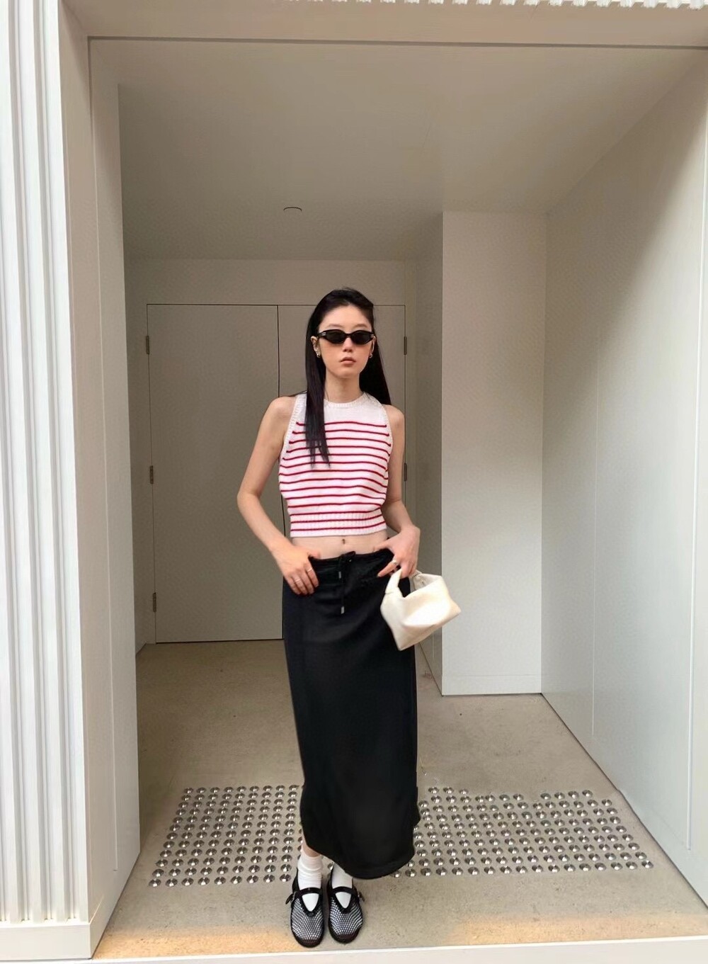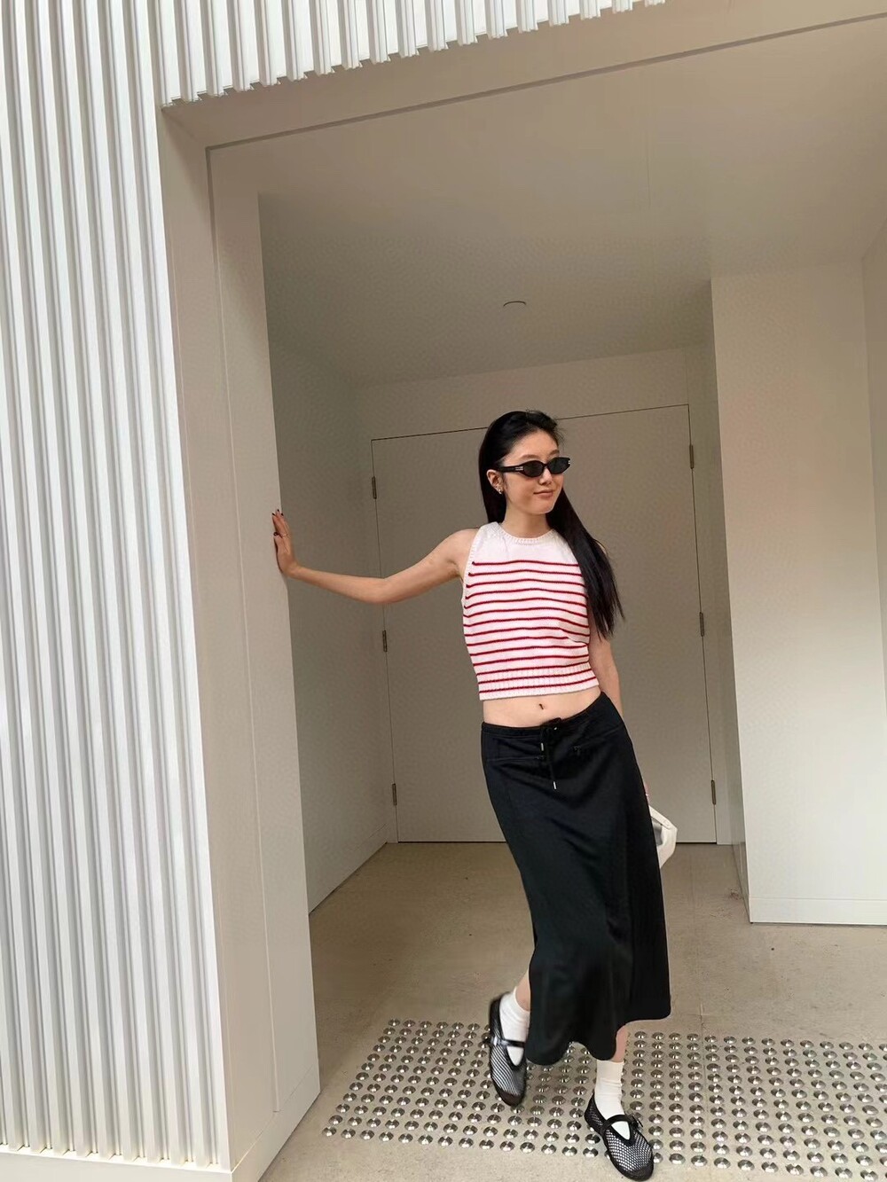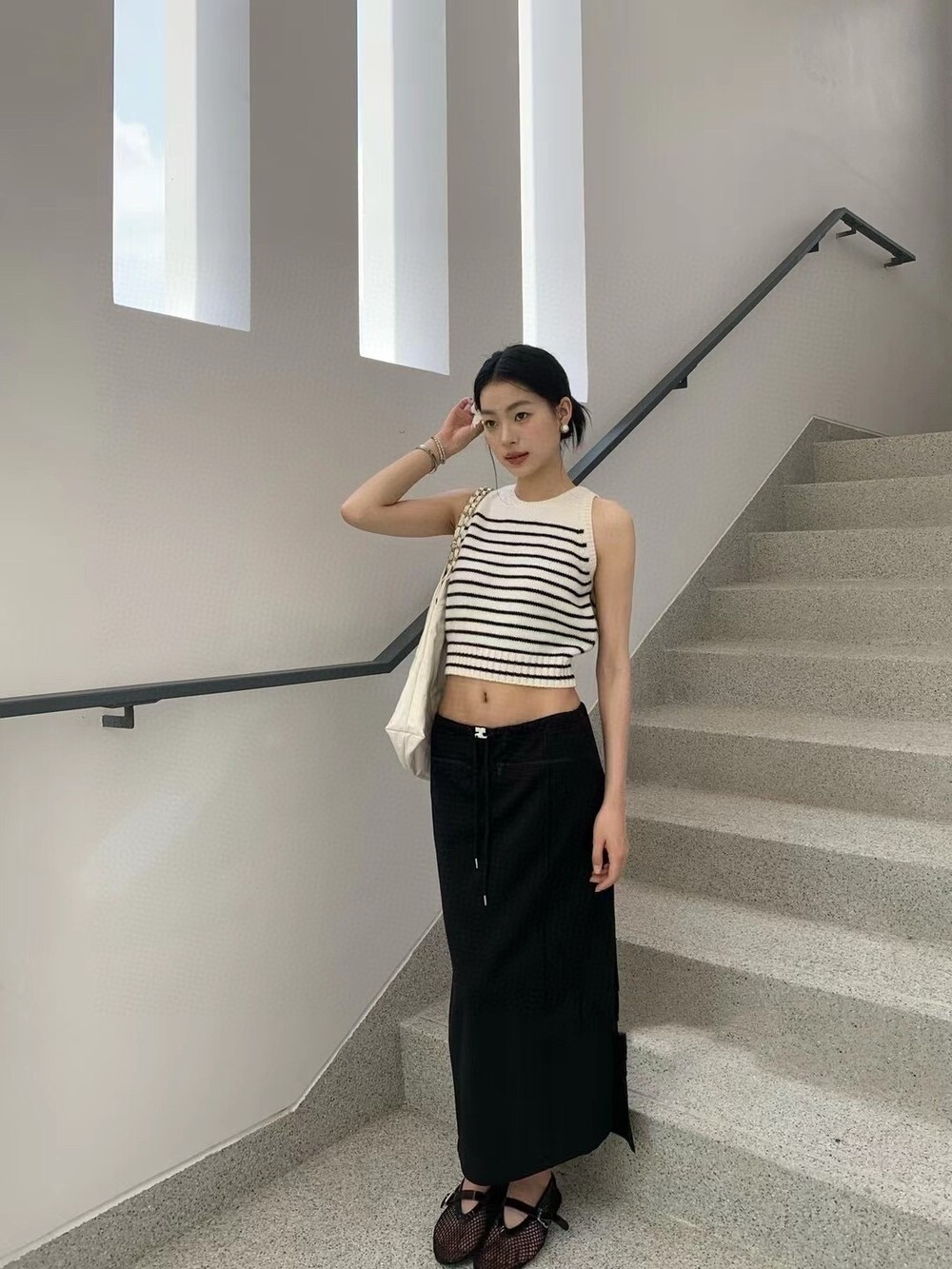숏한 기장으로 허리까지 오는 스커트나, 하이웨스트 진, 츄리닝 모두 잘 어울려요