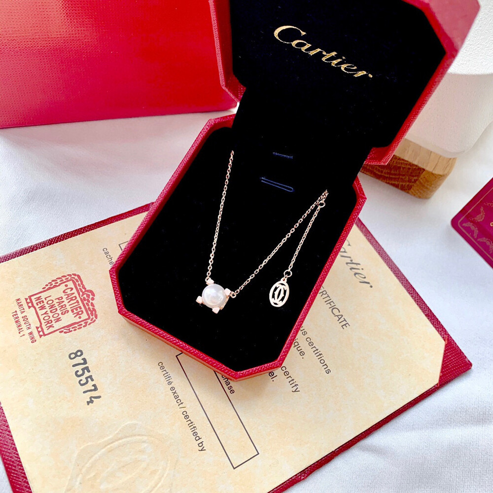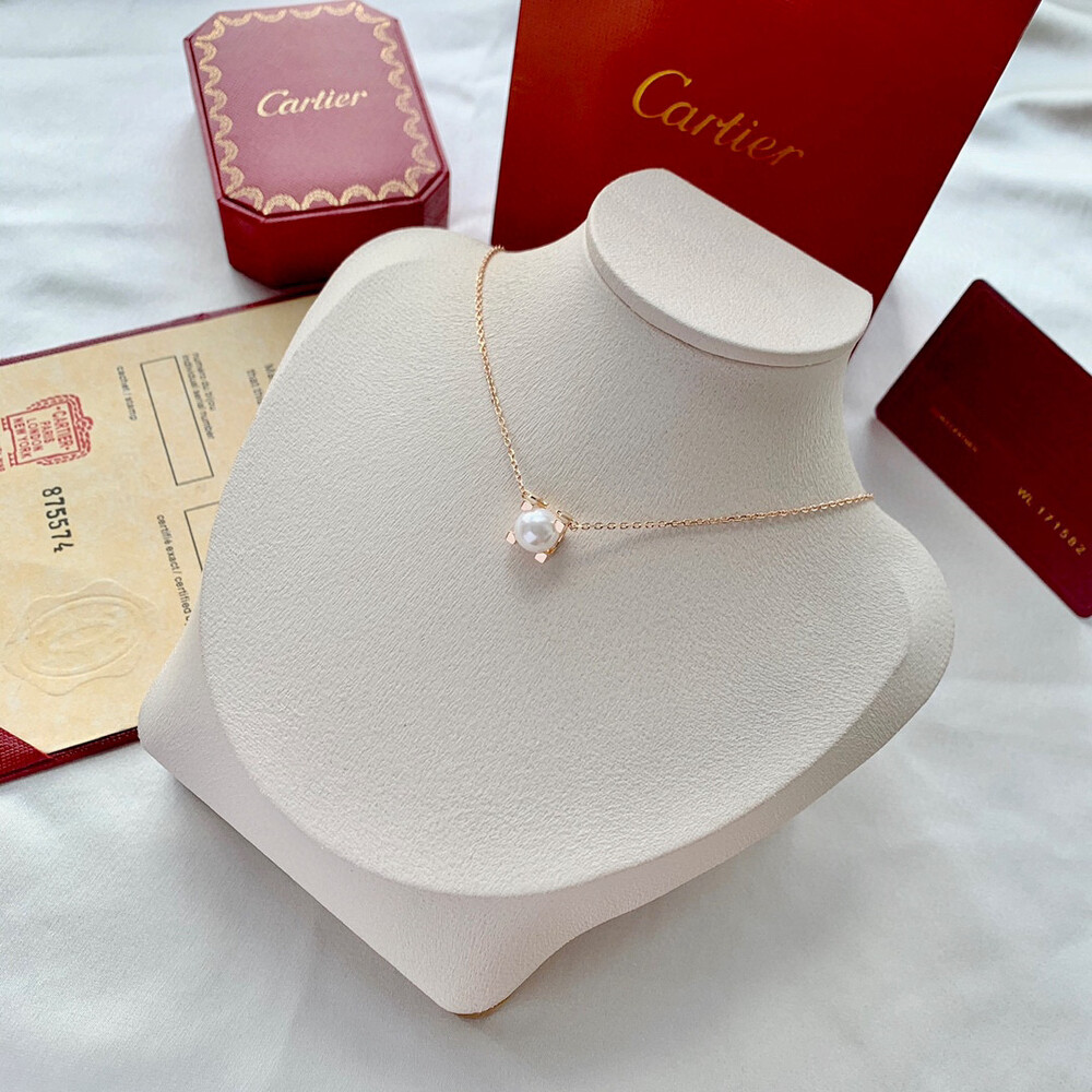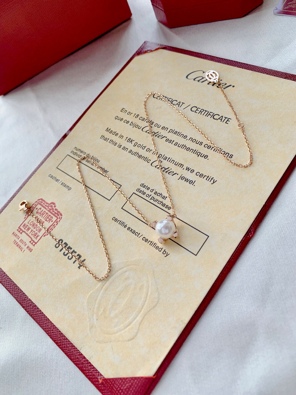[overseas counter welfare] Cartier / C DE CARTIER / bull head pearl necklace is definitely a must-have item, super recommended. Without too much decoration, it is simple and elegant, and it looks good when worn alone!The workmanship of the necklace is extremely delicate. The pearl holder is a "C"-shaped setting directly processed by CNC. The lines are smooth, the curvature is perfect, and the three-dimensional sense is strong. This is more obvious from the side! My family uses natural freshwater pearls (smooth and delicate surface, moist luster, not easy to wear), and the market version uses shell beads (surface defects are obvious, dull color). The chain is matched with the original lobster clasp. The fonts on the clasp are all cnc engraving, and the fonts are deep, clear and free of burrs.
