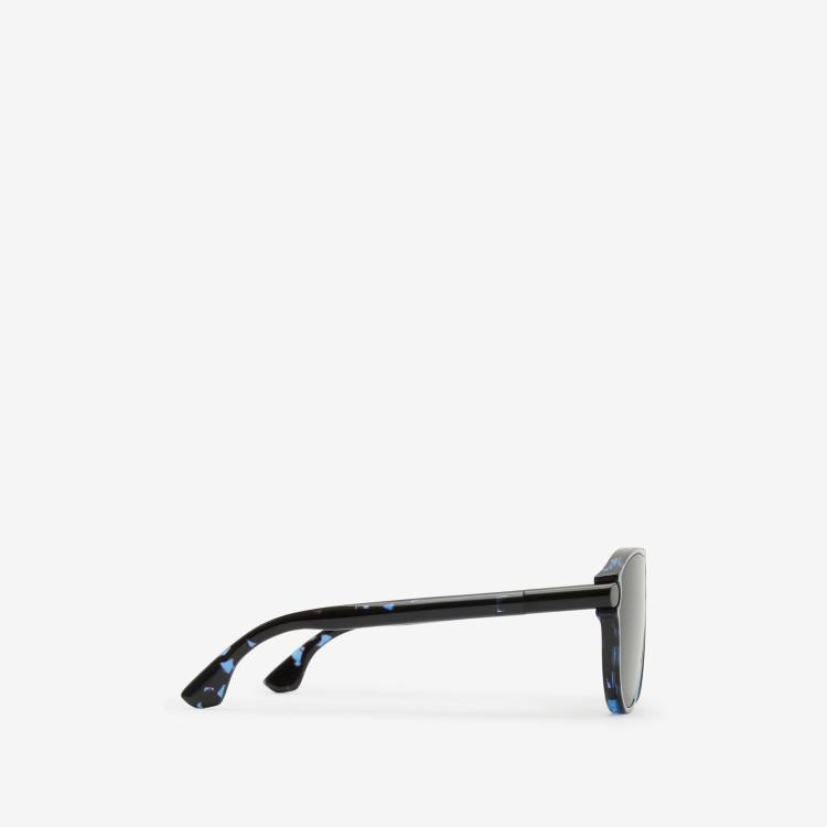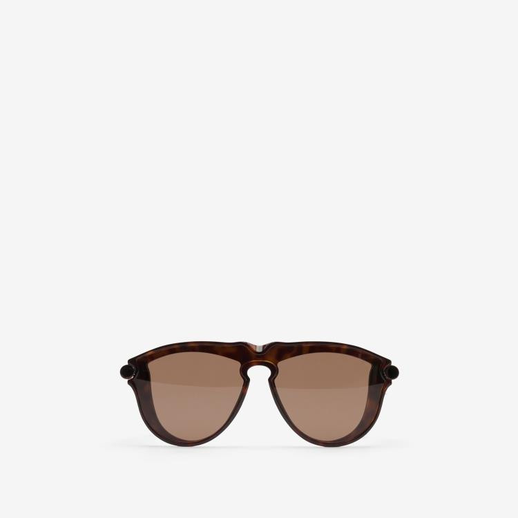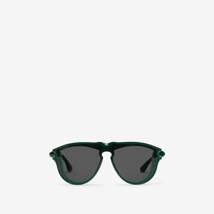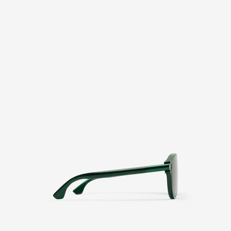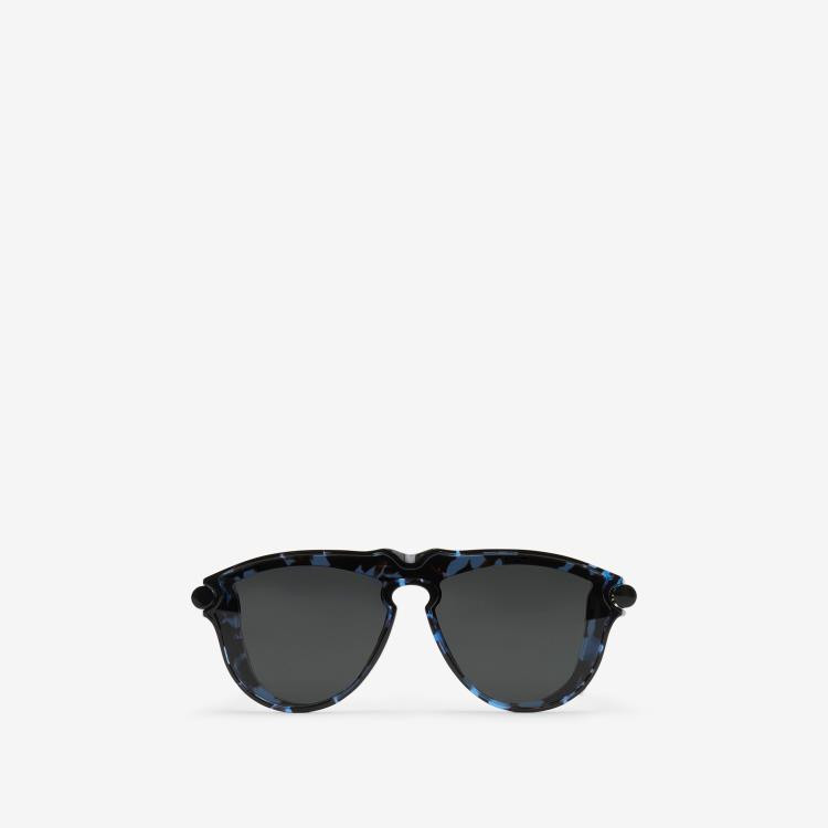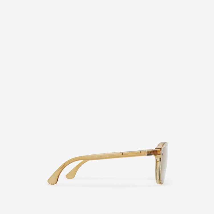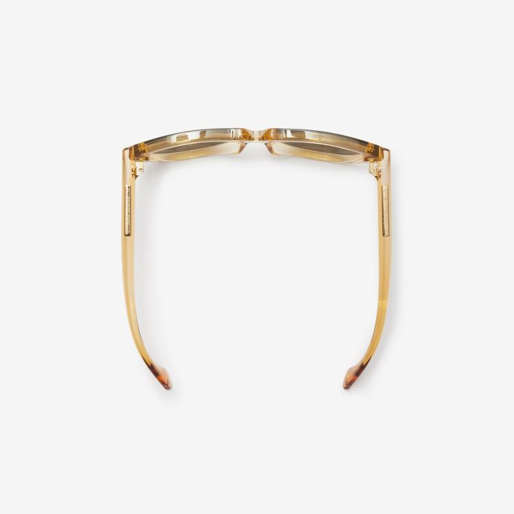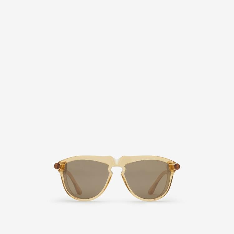 Pilot sunglasses in transparent acetate with a sculptural frame and tubular temples. The polished metal hardware is engraved with the Burberry logo and hallmarks.