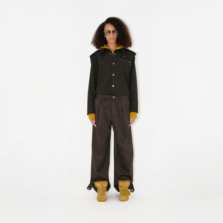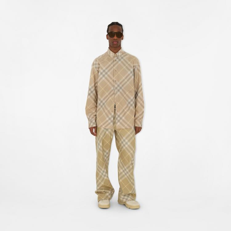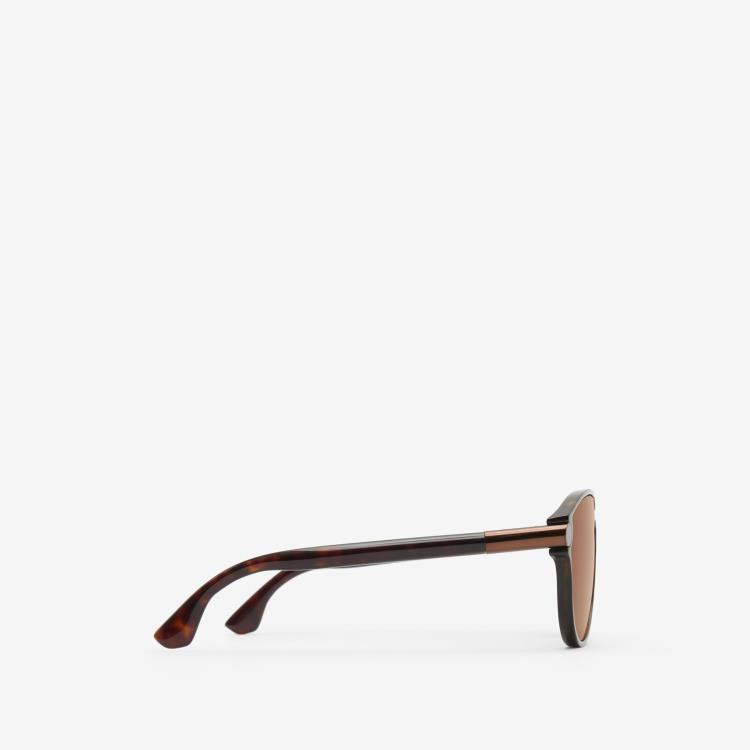 A pair of pilot sunglasses with a seamless lens. The polished metal hardware at the rounded temples is engraved with the Burberry logo and hallmarks.