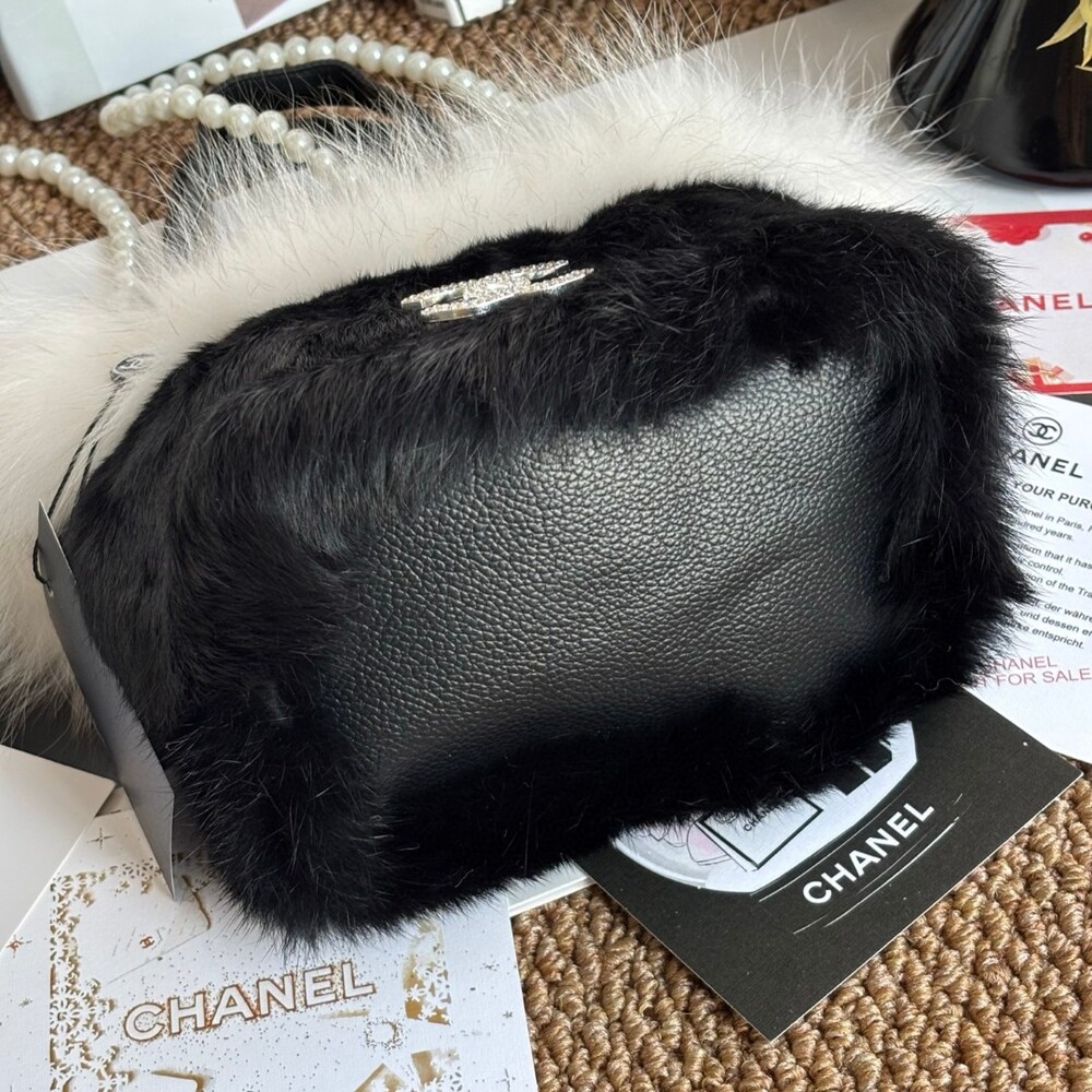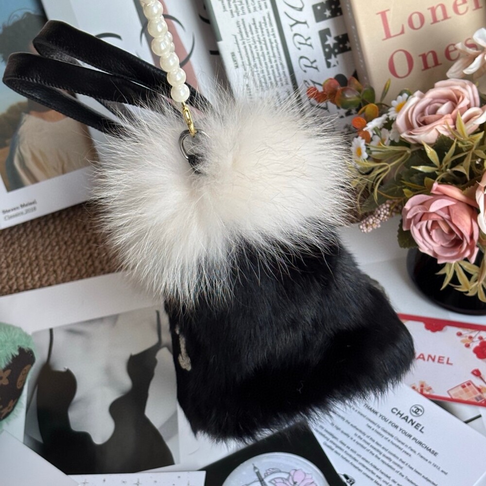 부드럽고 풍성한 퍼 텍스처에 진주 체인 스트랩이 더해져