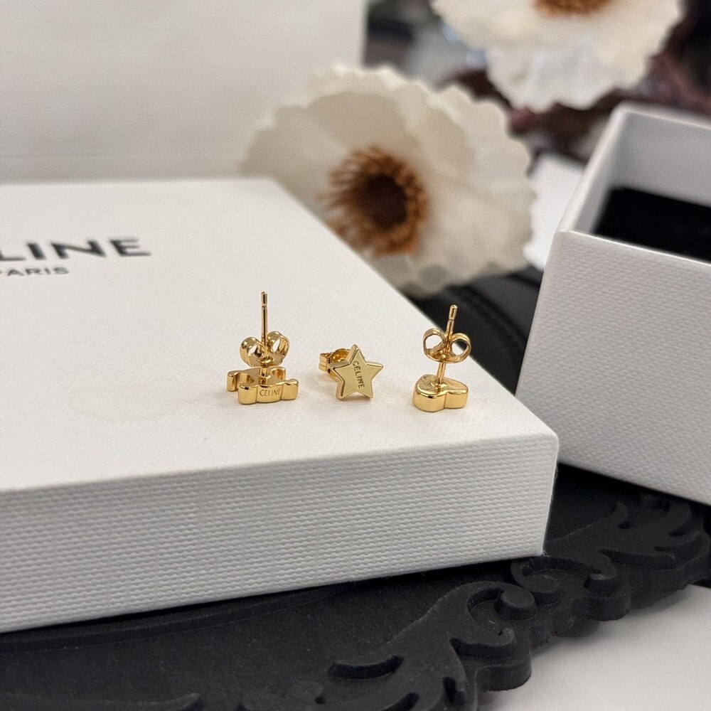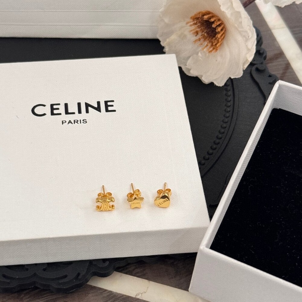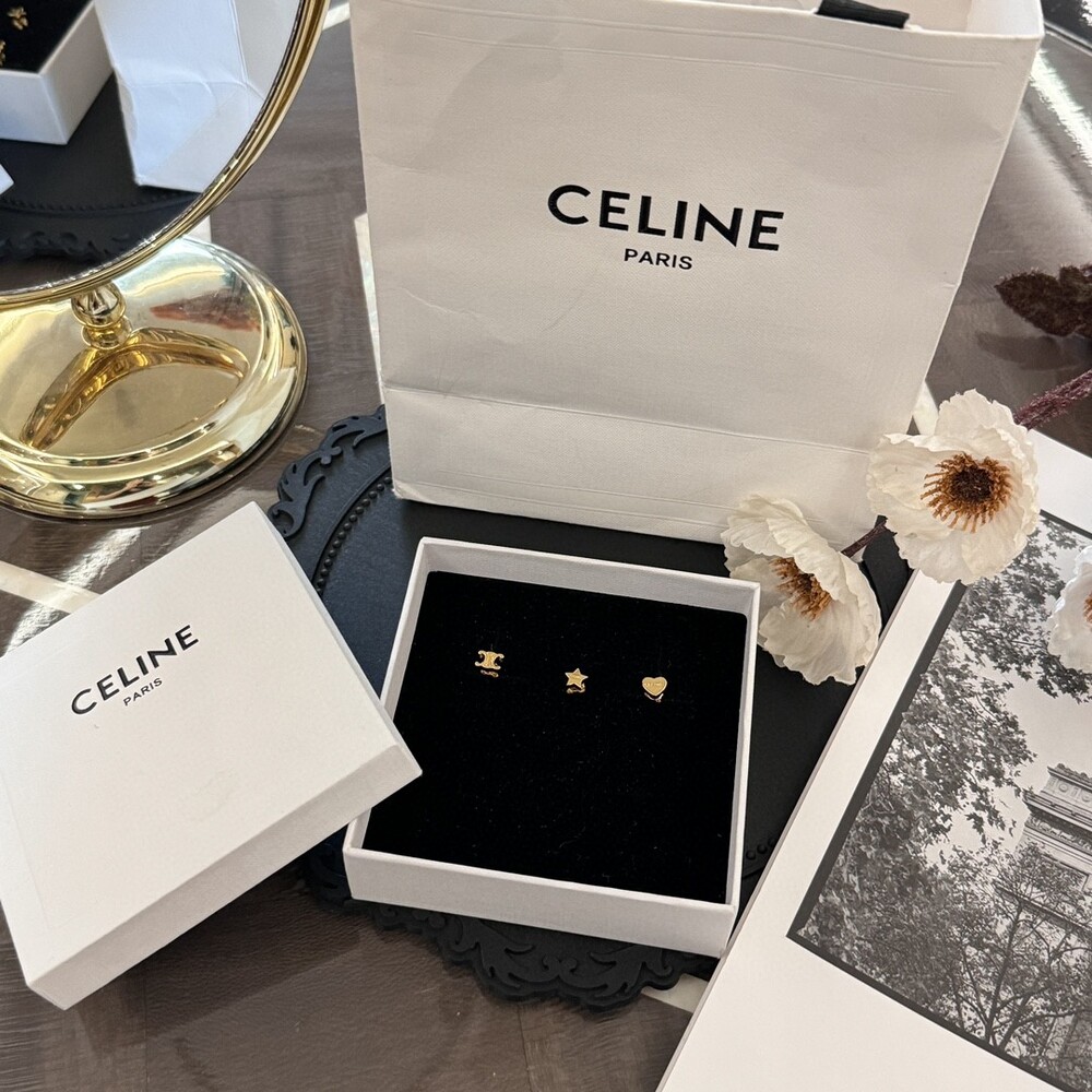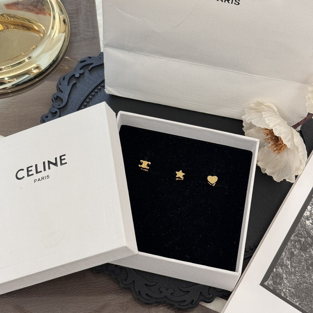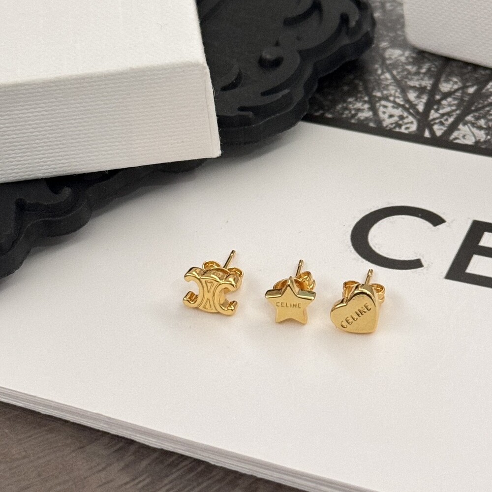 New Celine gift TRIOMPHE Gold Brass Earrings Set of 3Arc de Triomphe LOGO Pentagonal Star Peach Heart Delicate and compact Casual