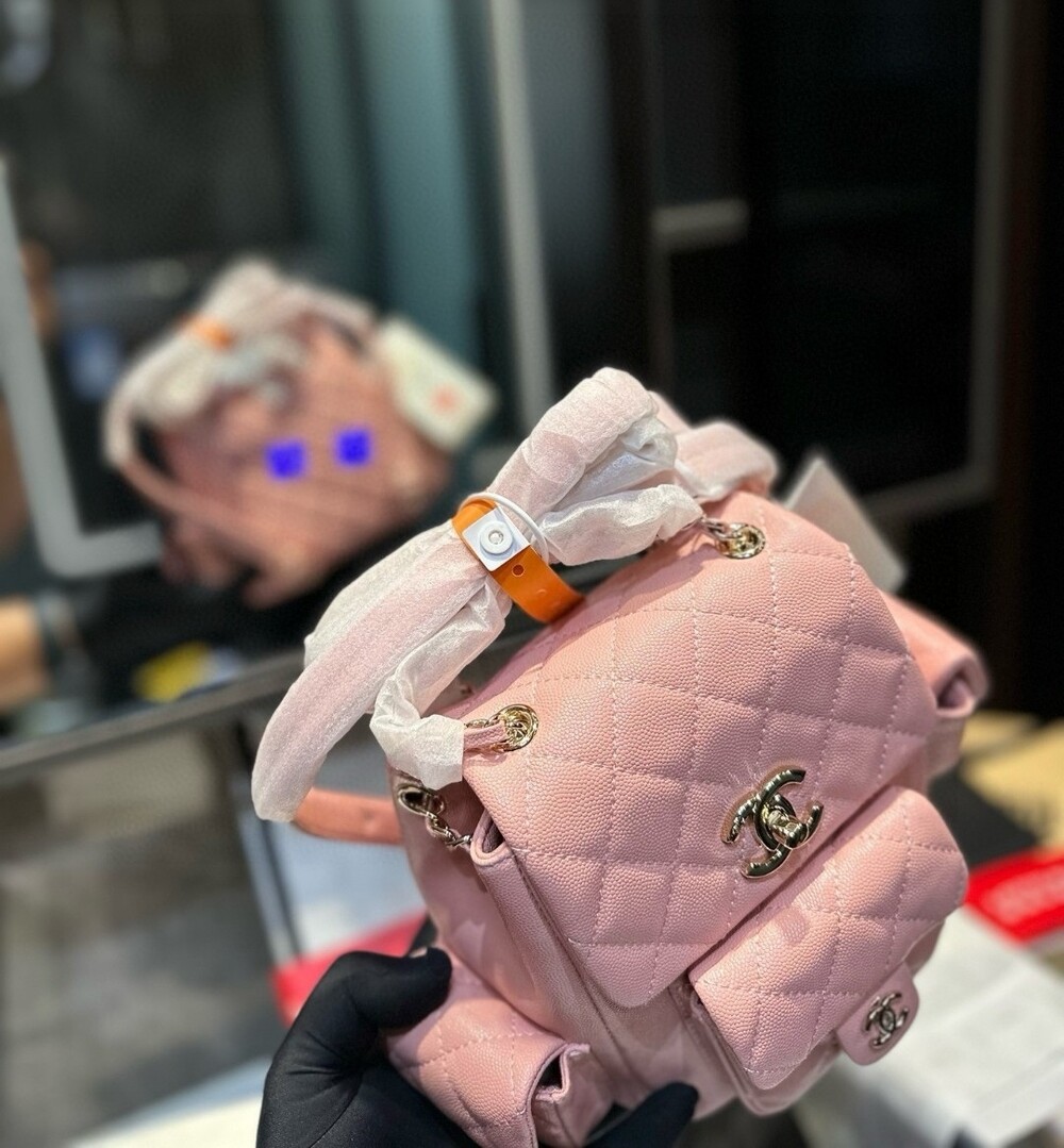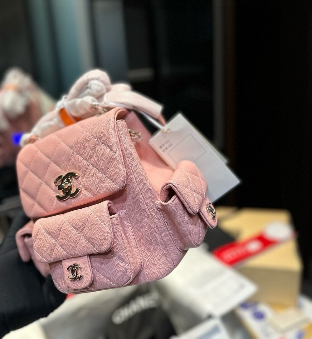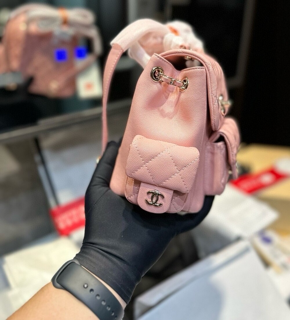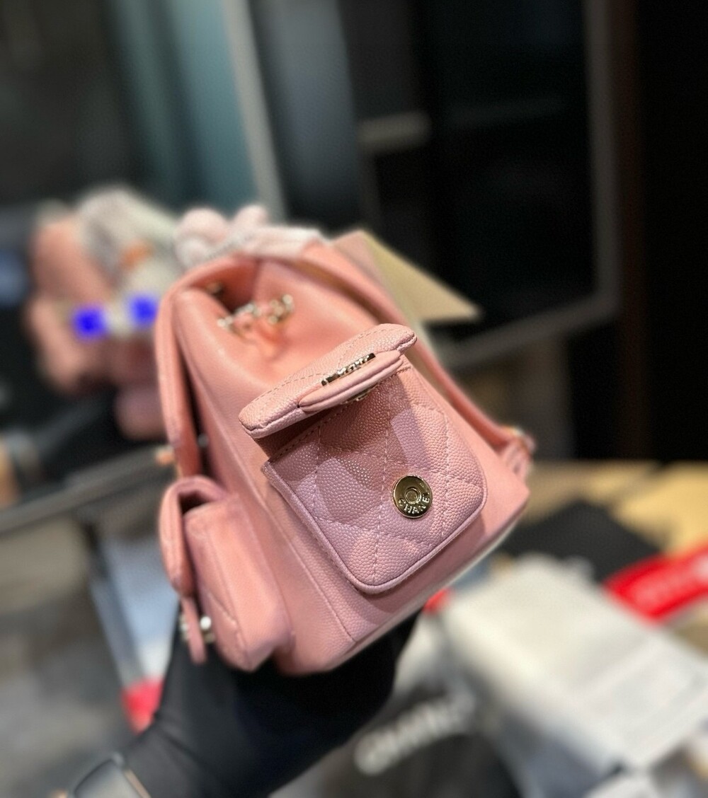 Chanel 23k Duma Tank Backpack The new model and the last season Duma has changed, the front lower pocket becomes the left and right sides, practicality and visual value are irresistible The small pockets on both sides are also very practical, and the size is just right to put down the airpodspro earphone box, and you can also put dental floss, headband, and these gadgets. You don't need to take the bag off to the front when you pick it up, carry the bag hand to the side to pick it up, very convenient size 18.18