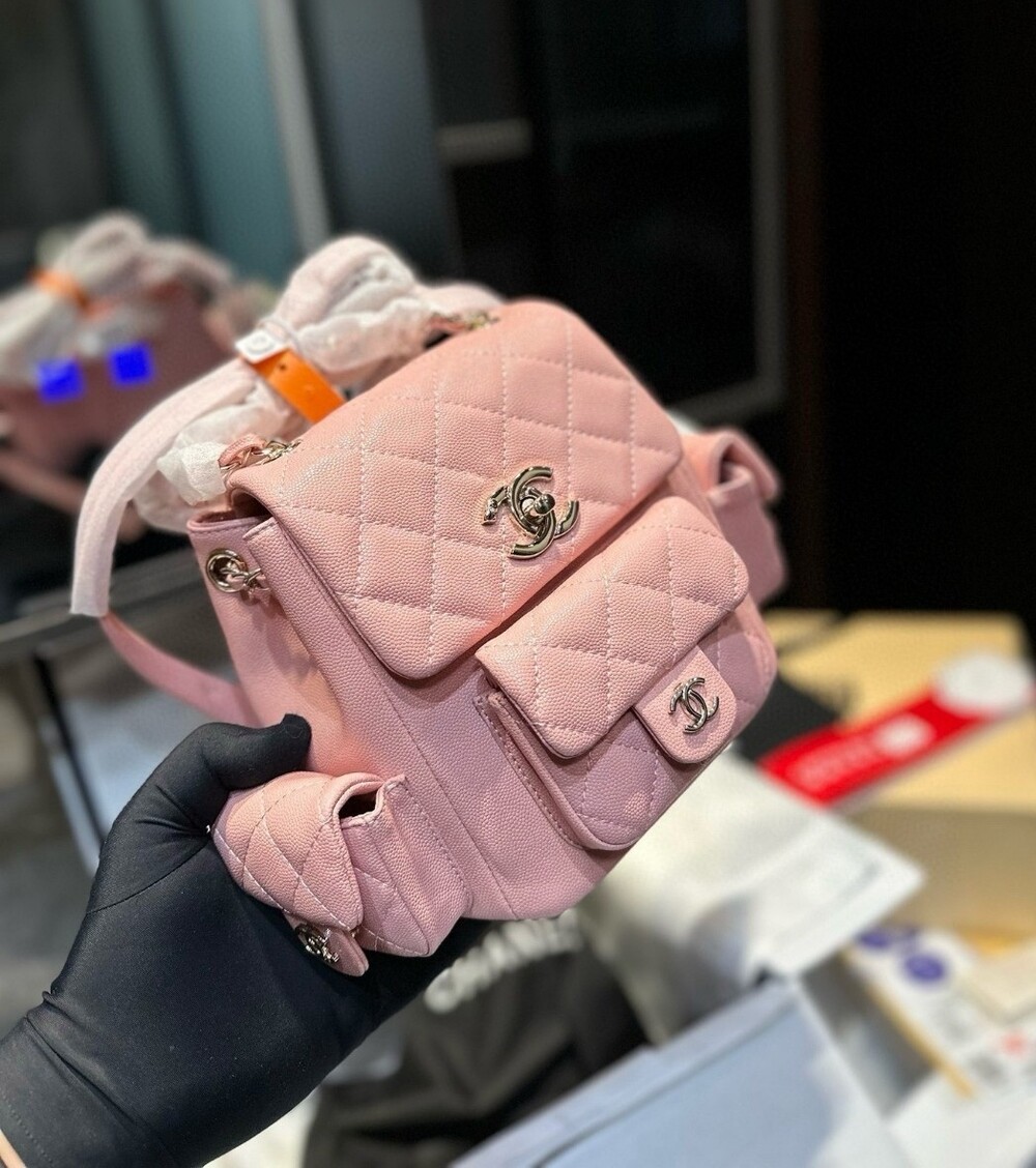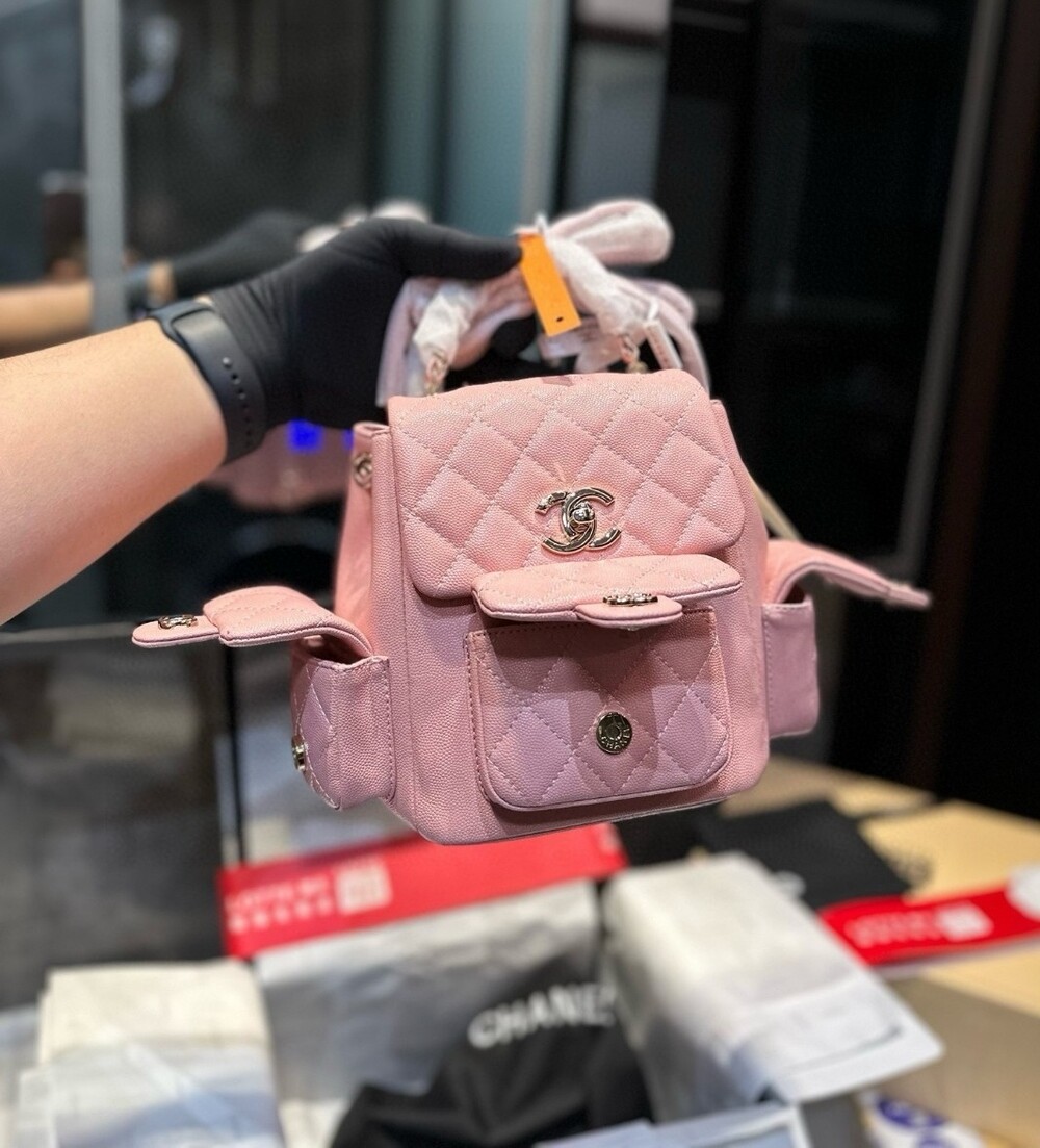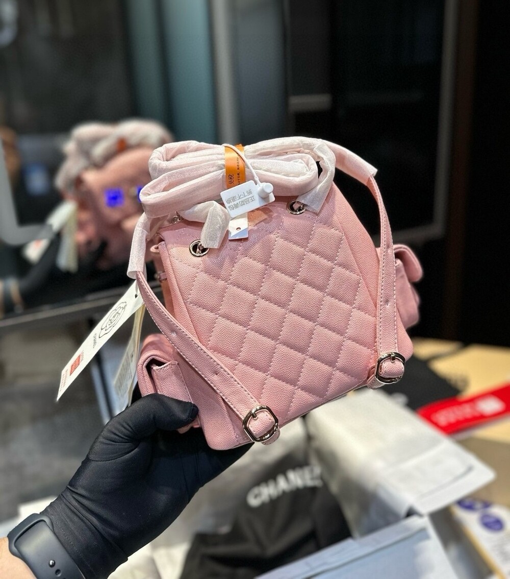Chanel 23k Duma Tank Backpack The new model and the last season Duma has changed, the front lower pocket becomes the left and right sides, practicality and visual value are irresistible The small pockets on both sides are also very practical, and the size is just right to put down the airpodspro earphone box, and you can also put dental floss, headband, and these gadgets. You don't need to take the bag off to the front when you pick it up, carry the bag hand to the side to pick it up, very convenient size 18.18