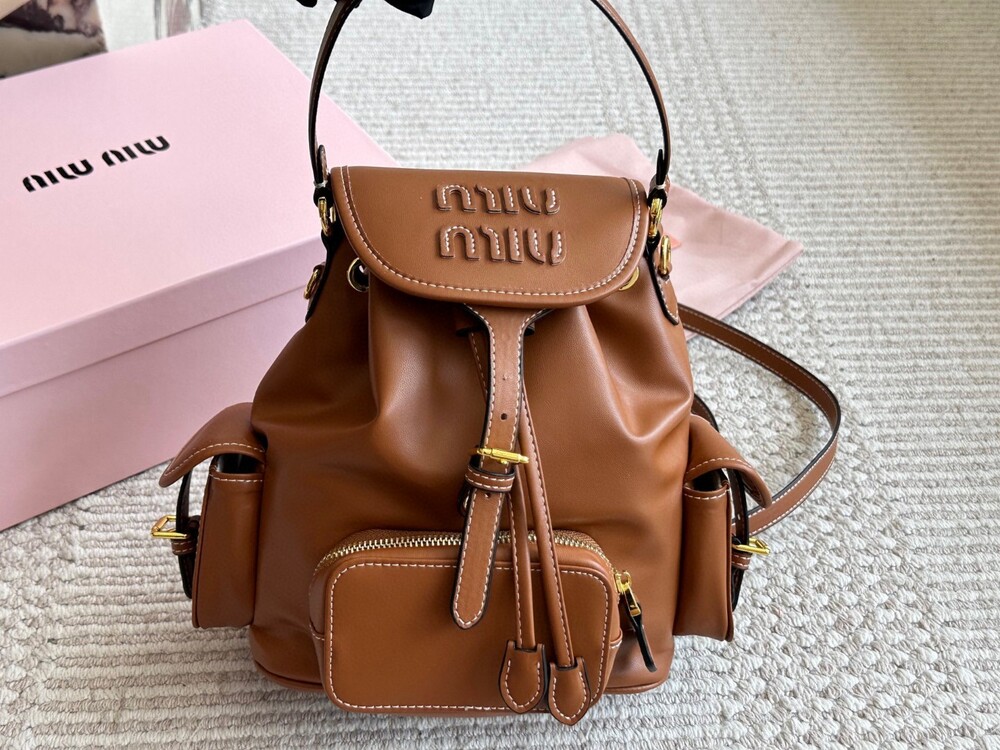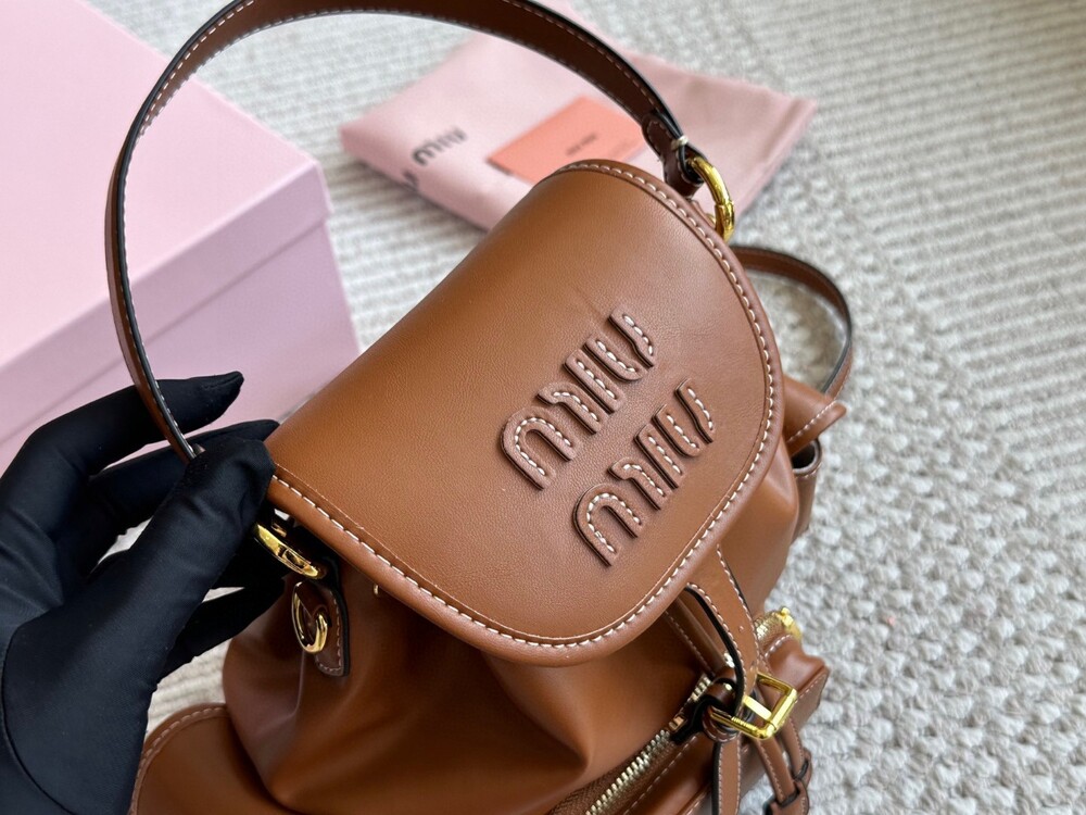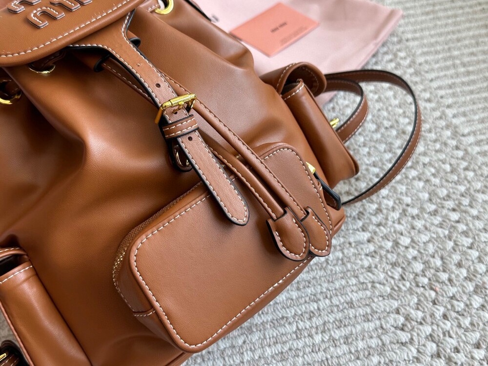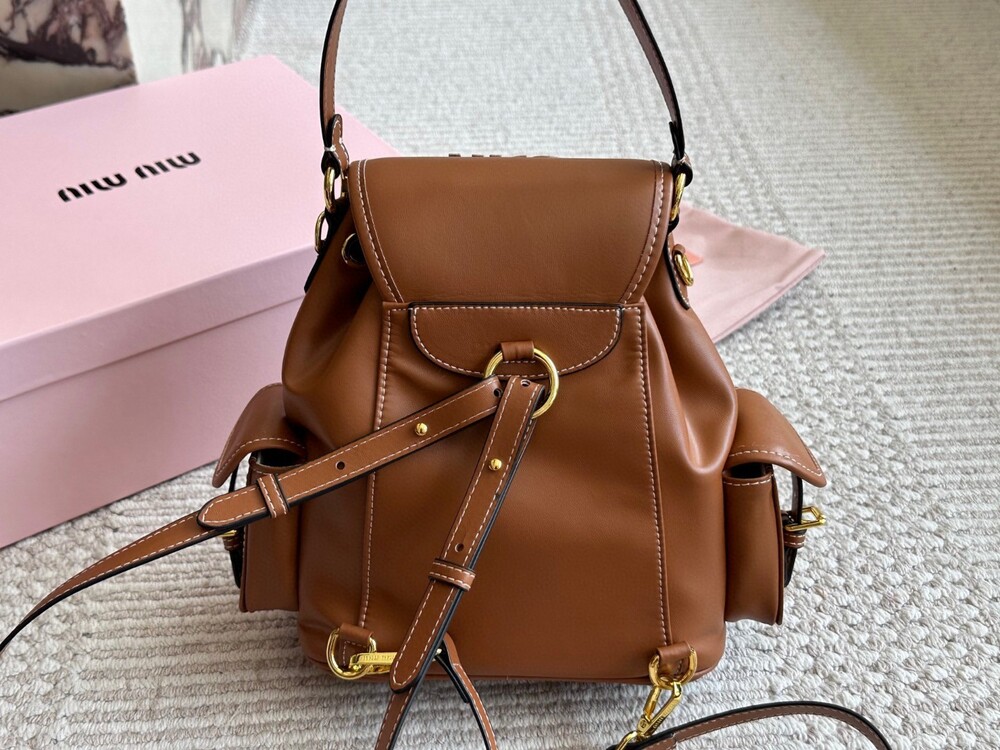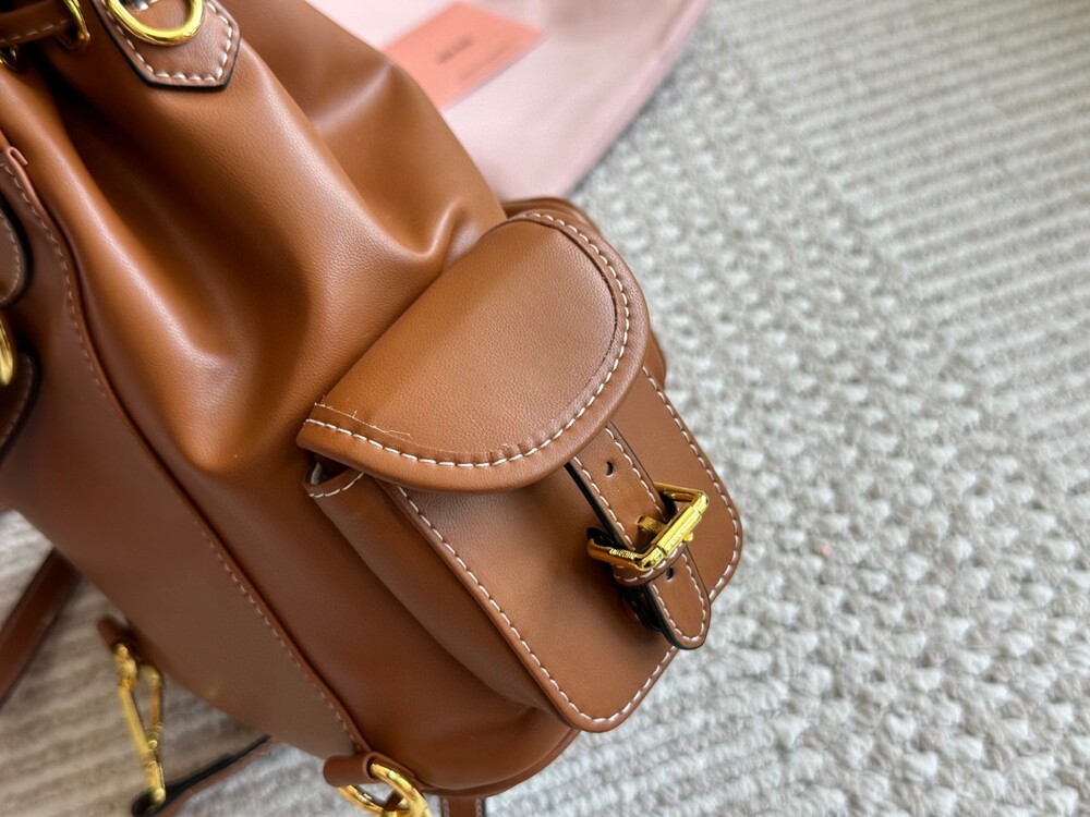 A chic and playful Miu Miu mini leather backpack in soft caramel brown.