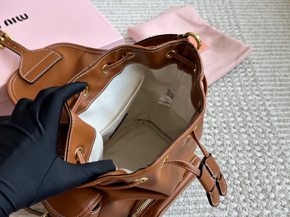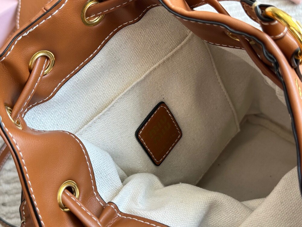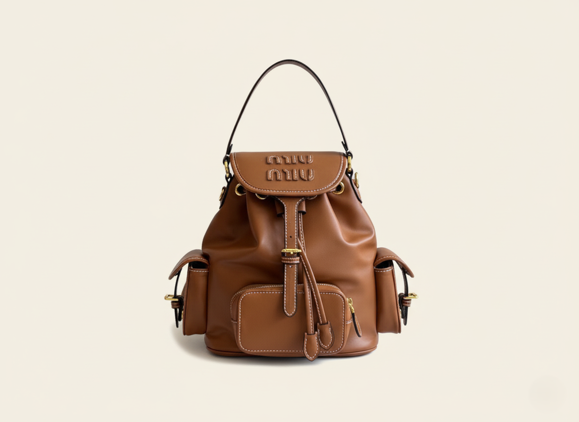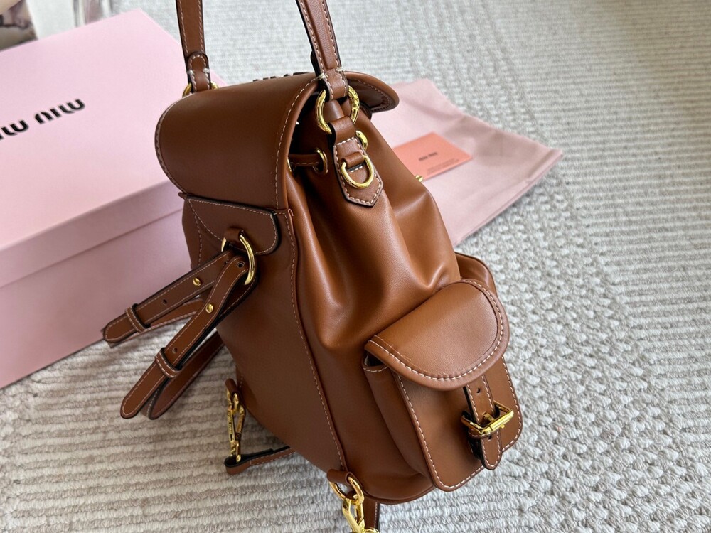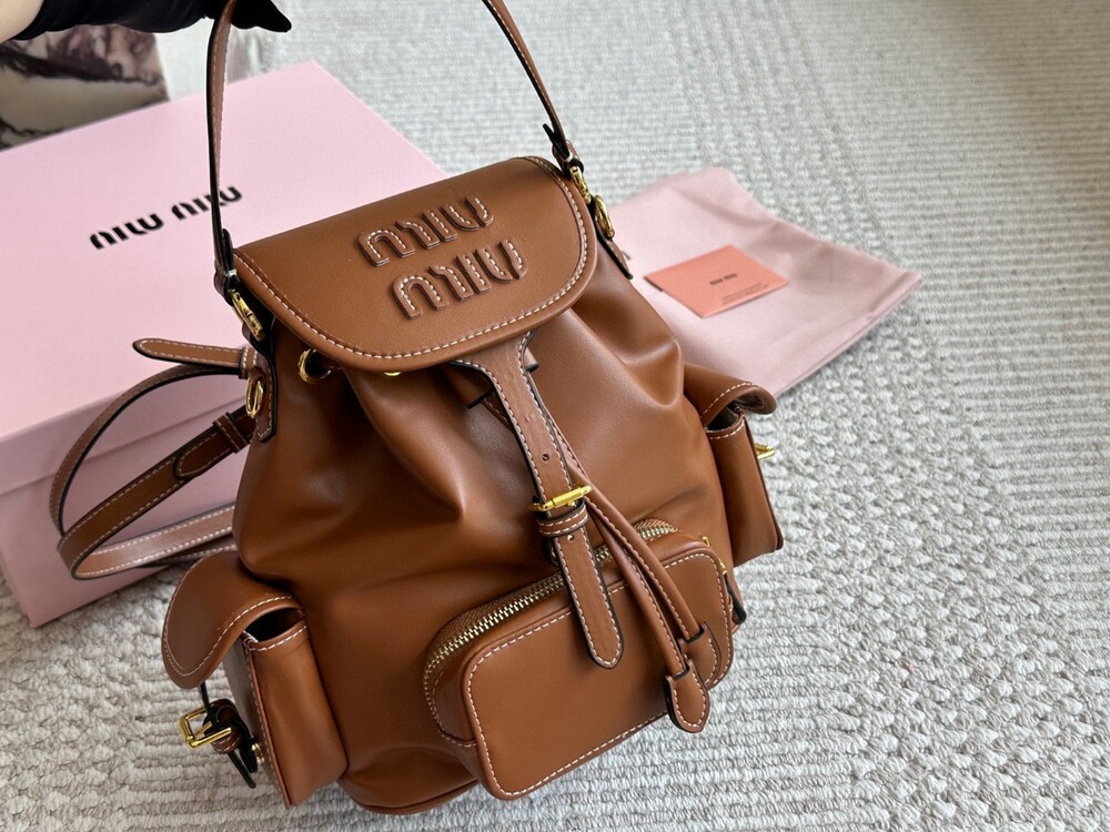 A chic and playful Miu Miu mini leather backpack in soft caramel brown.