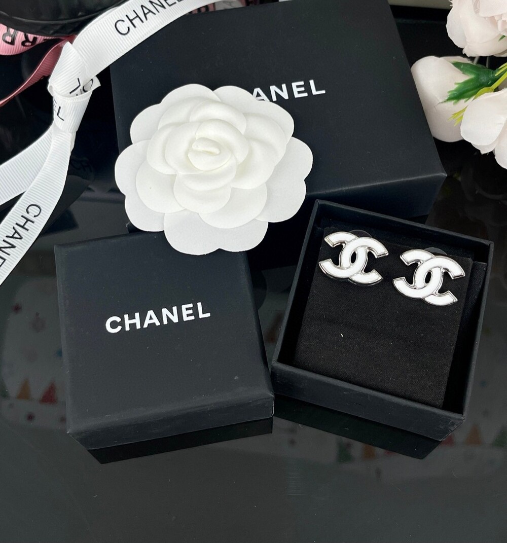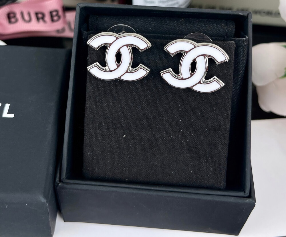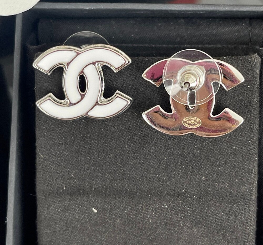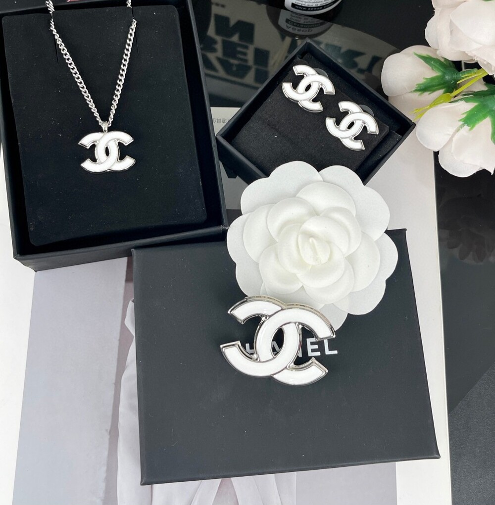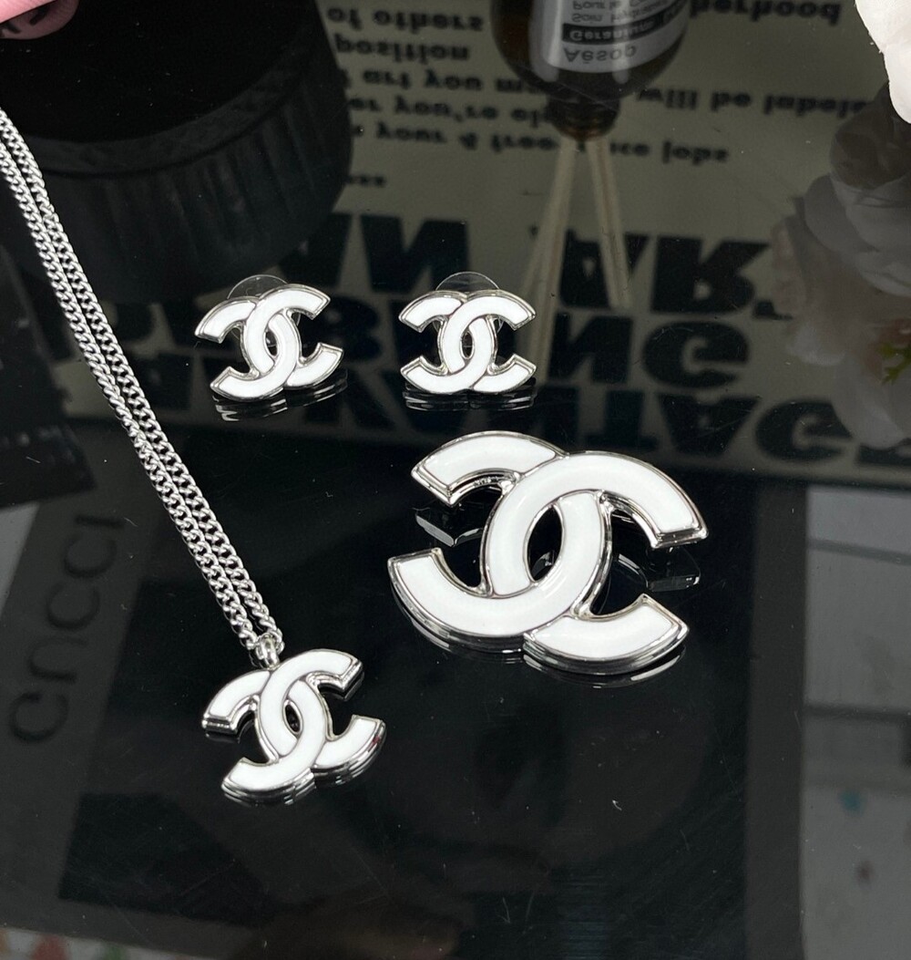 A classic CHANEL set featuring the iconic CC logo with white enamel accents.
