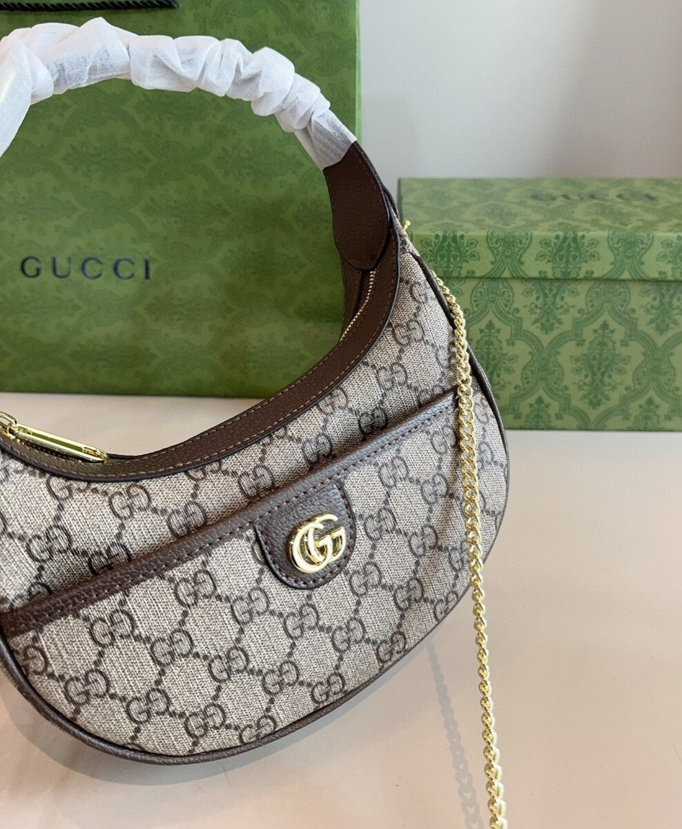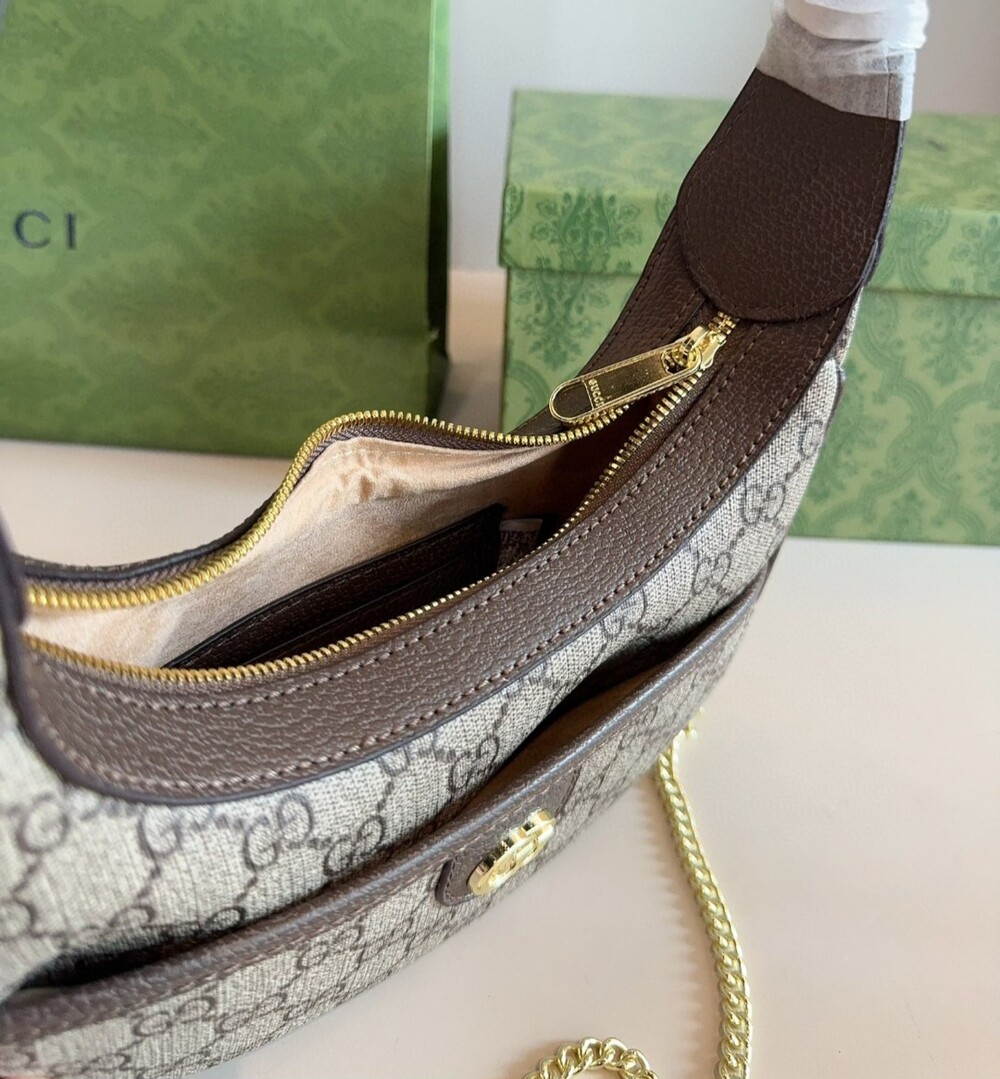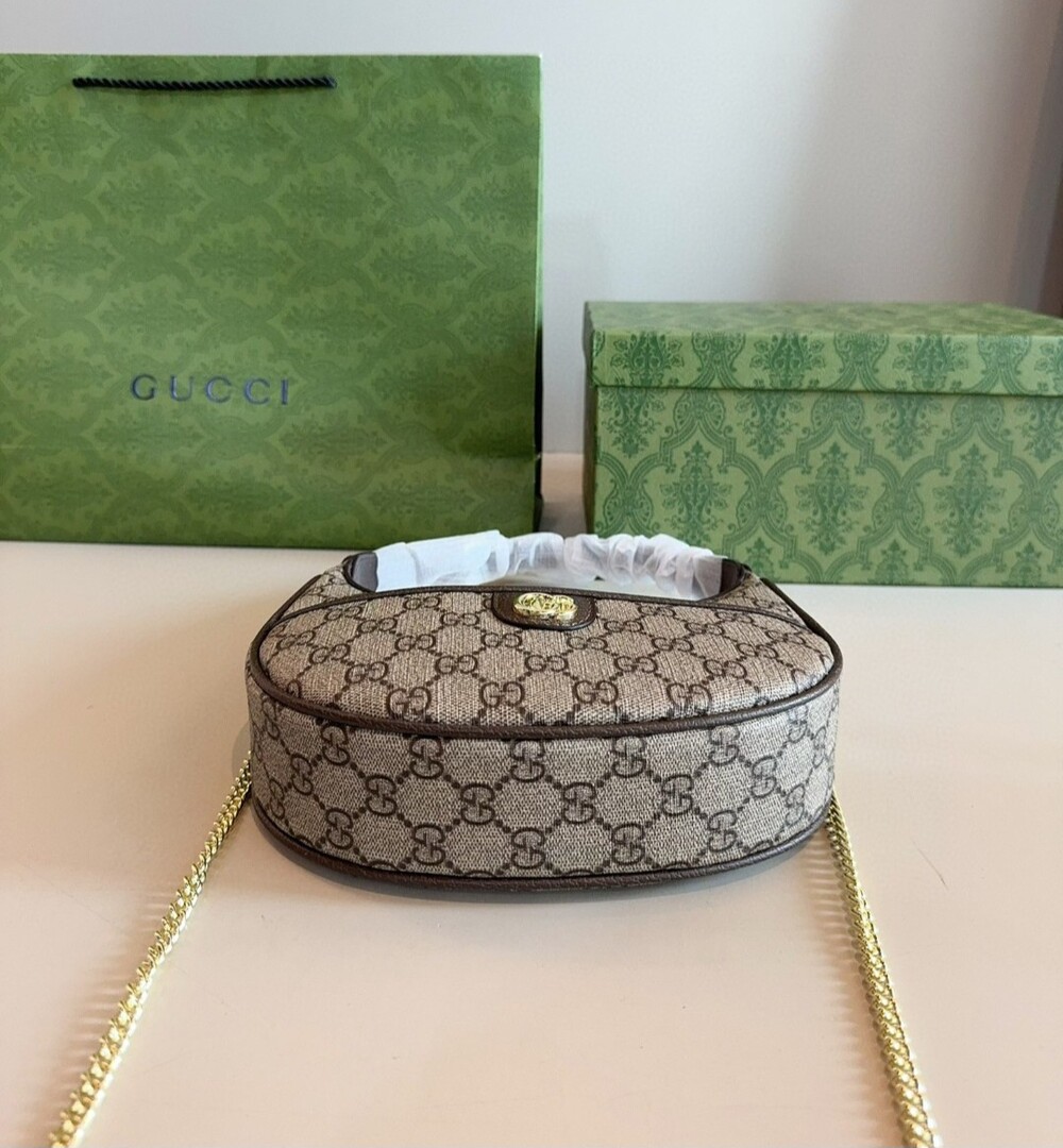 The Gucci GG Supreme Half-Moon Shoulder Bag is a chic and compact design