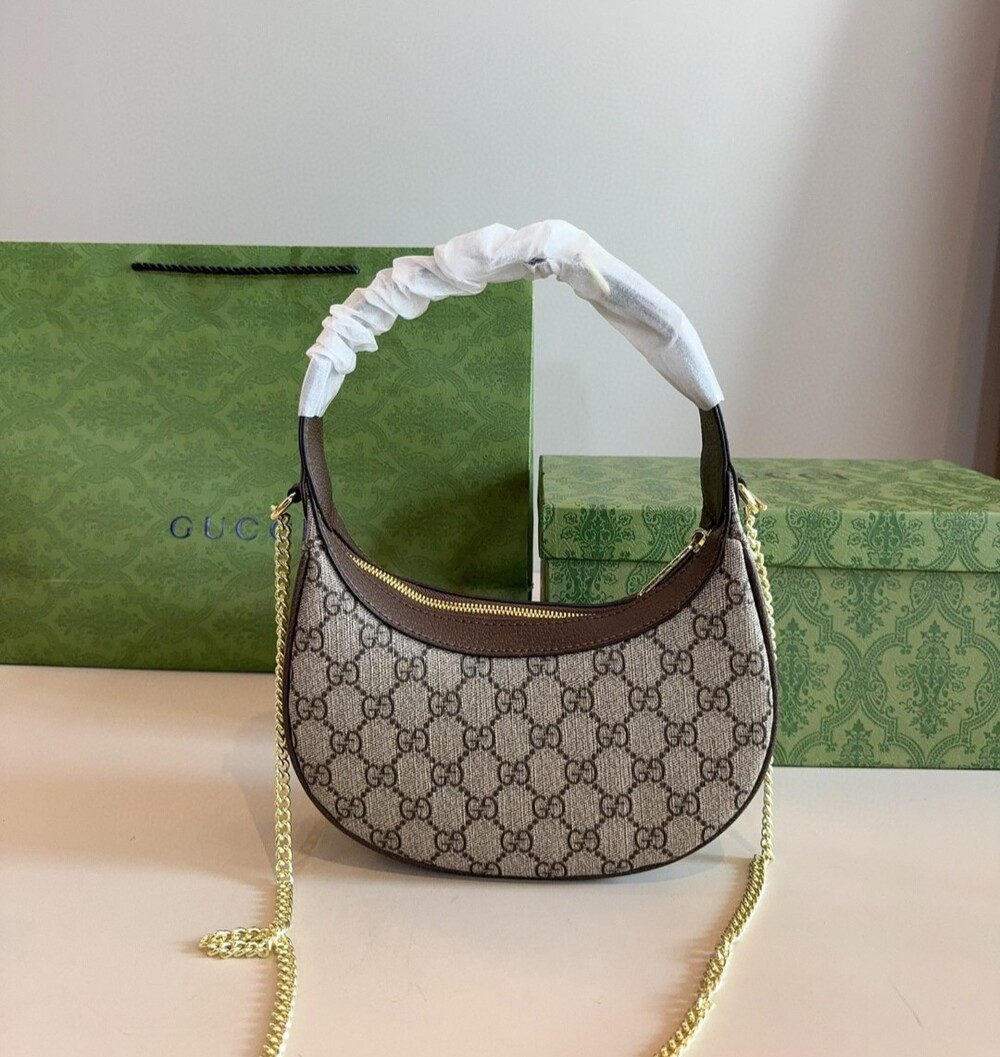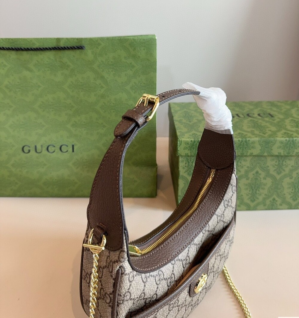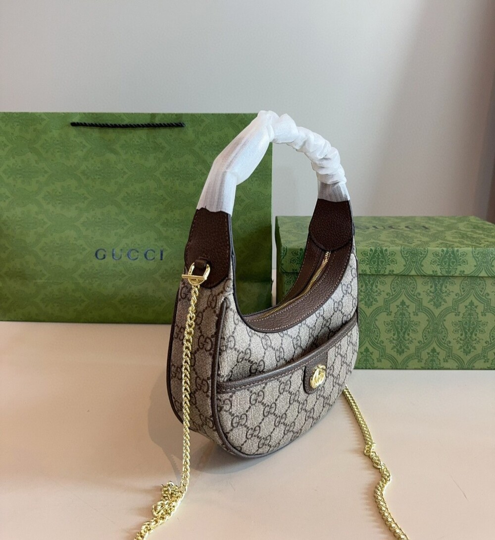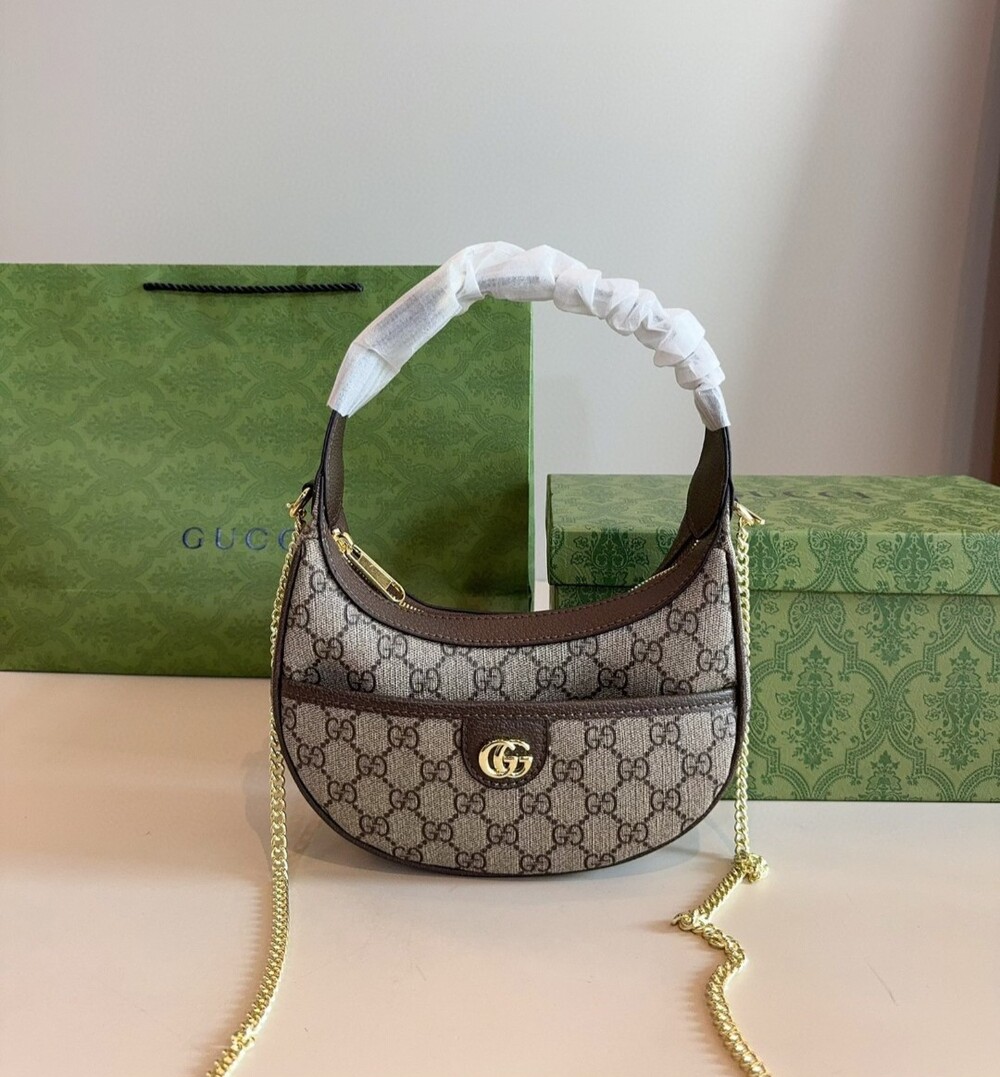 The Gucci GG Supreme Half-Moon Shoulder Bag is a chic and compact design