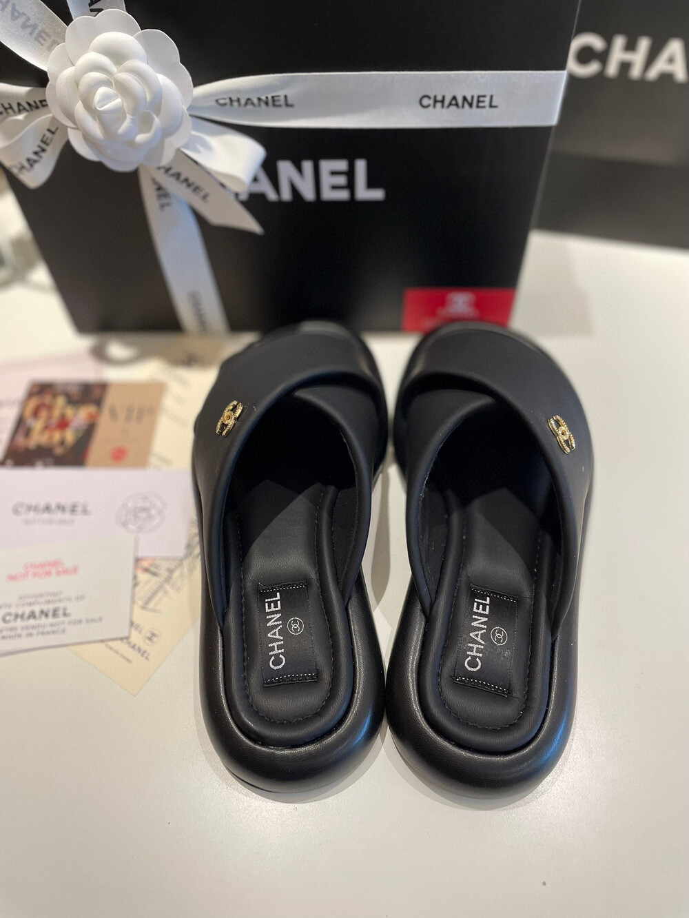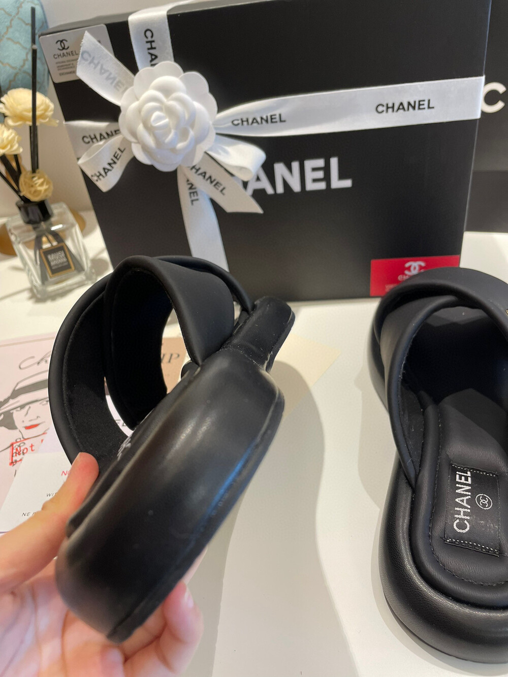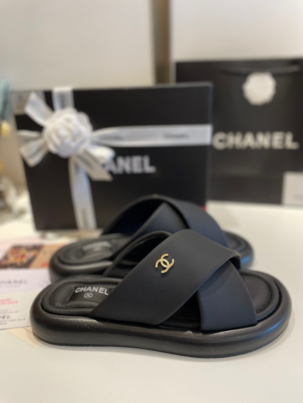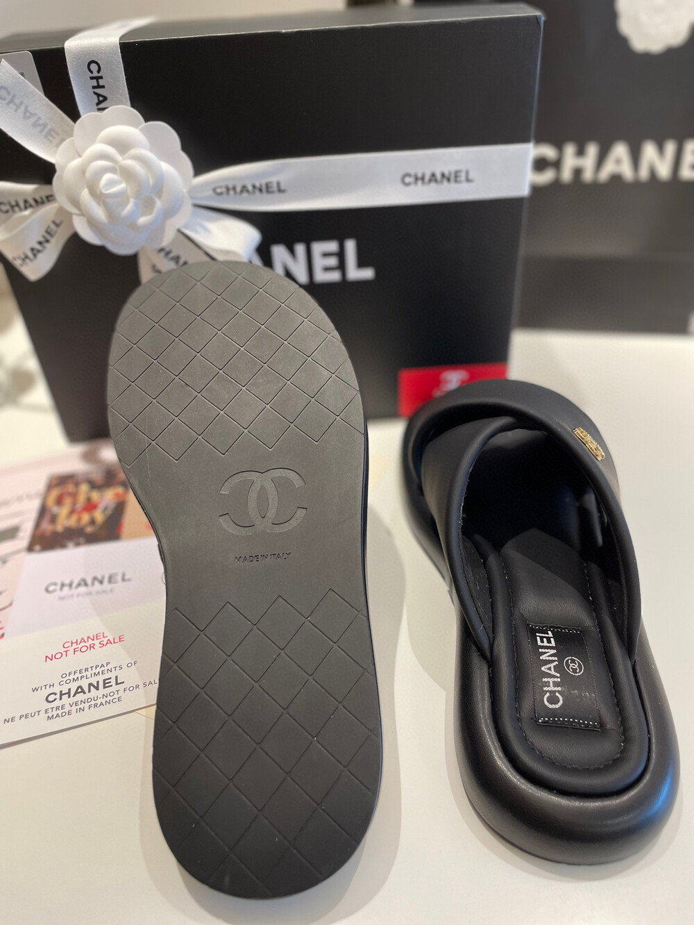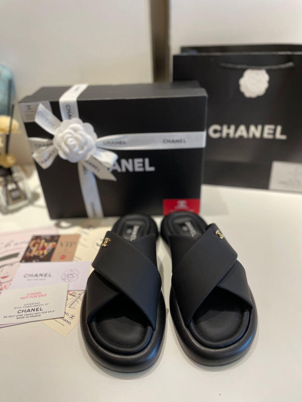Chanel VIP Gift Slipper Special 35-40 yards Chanel Cross Platform Slippers. This cross-platform mule has a very comfortable fit as it gently wraps the top of the foot with cushion material. I recommend the standard size. The standard size is prettier because it is more elastic than leather. It's a model that I recommend daily because it doesn't come out with this kind of material