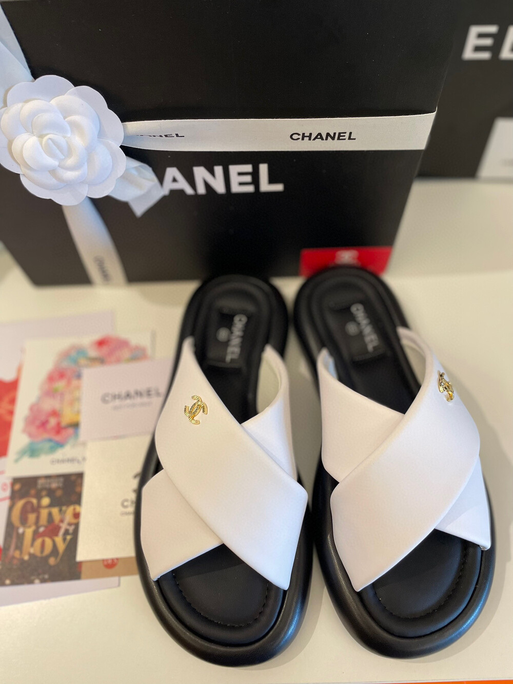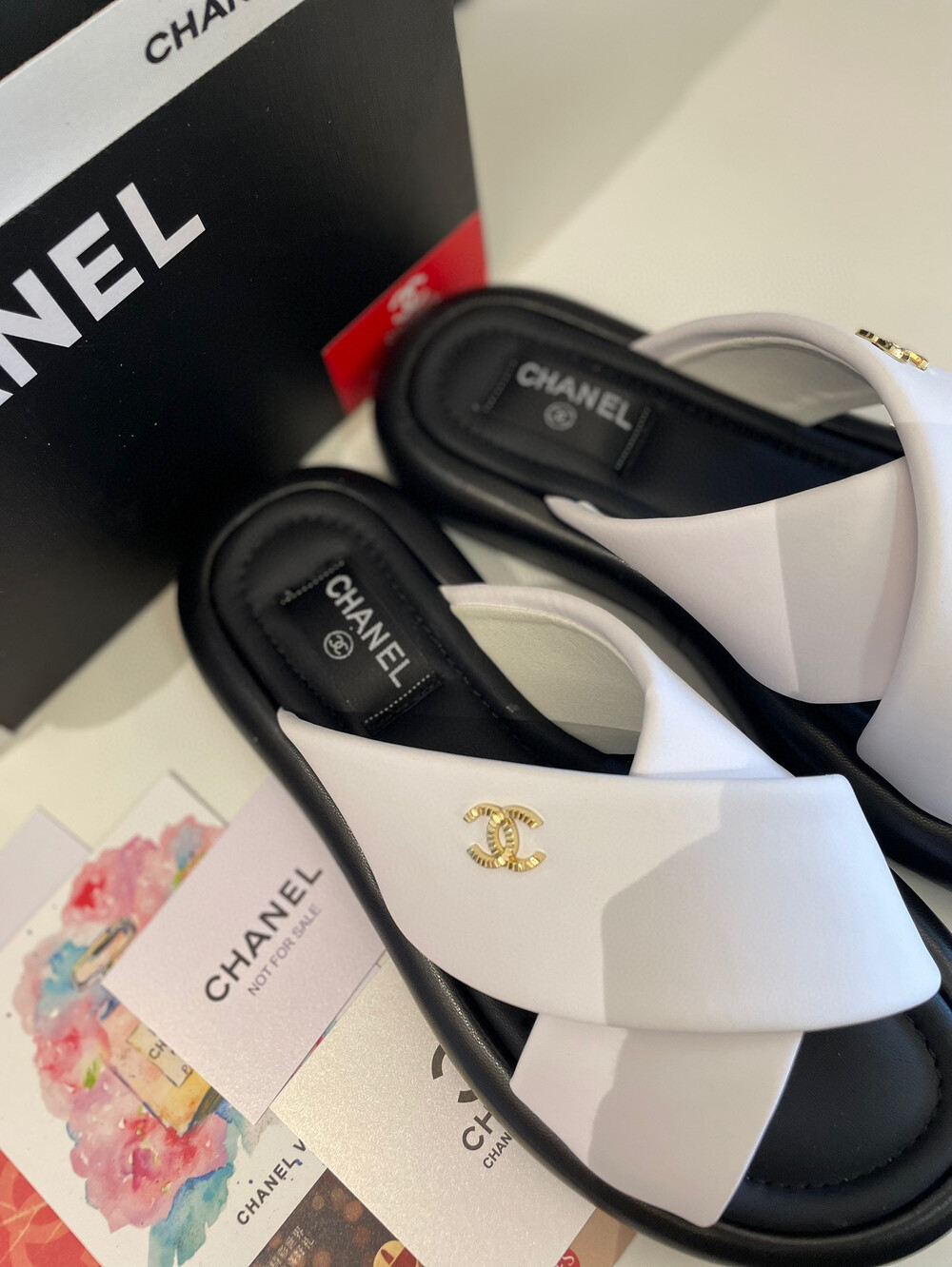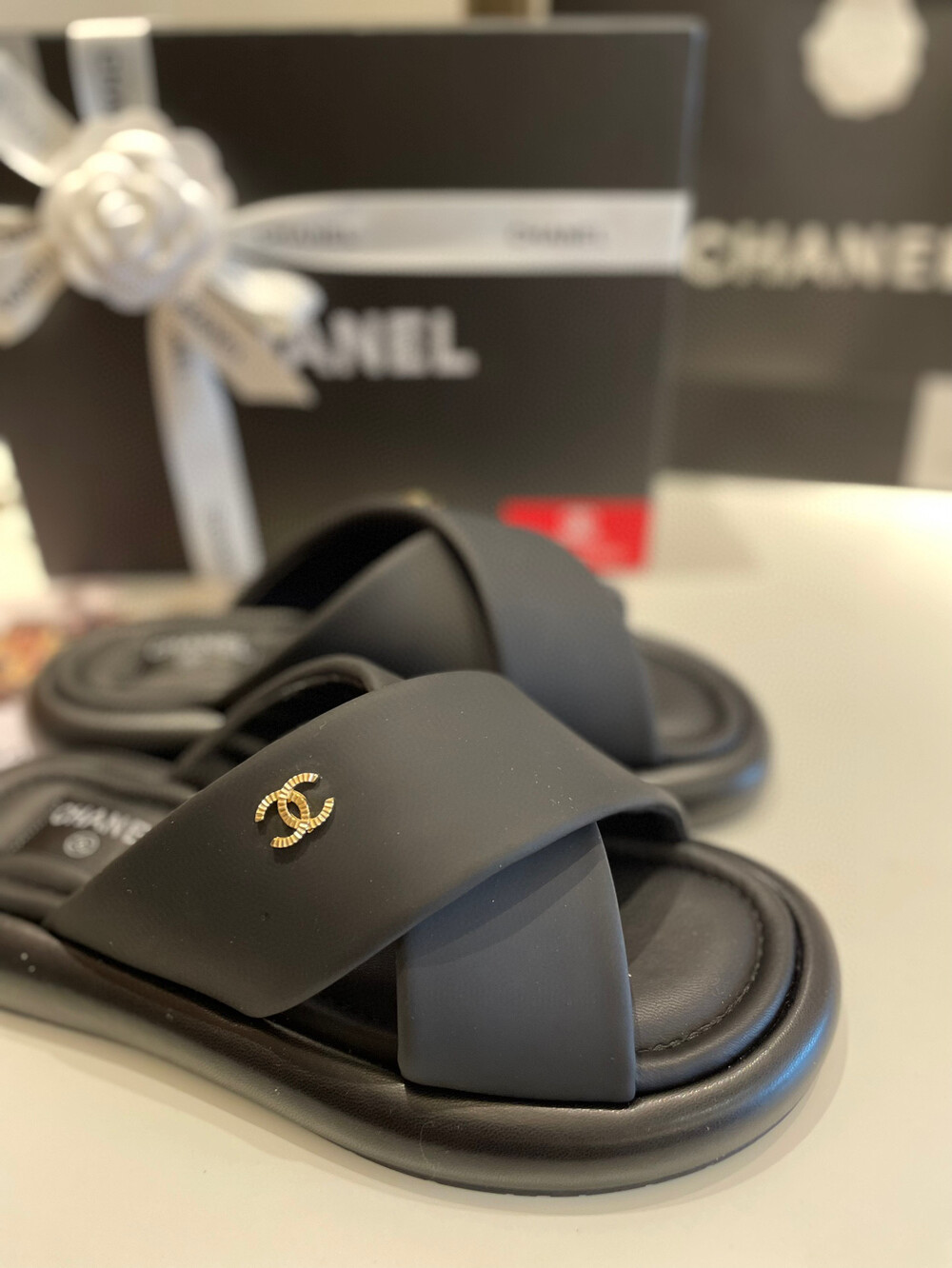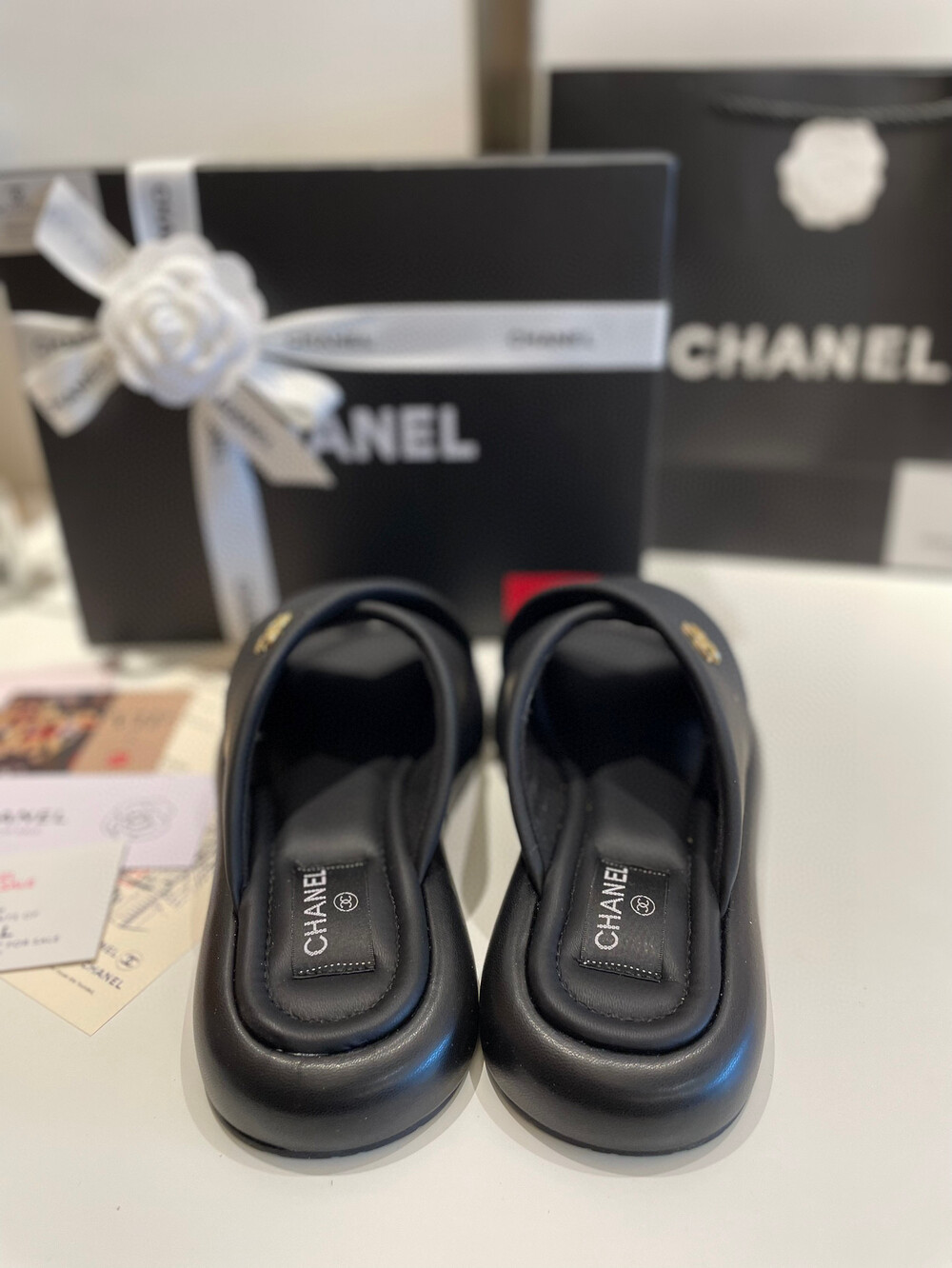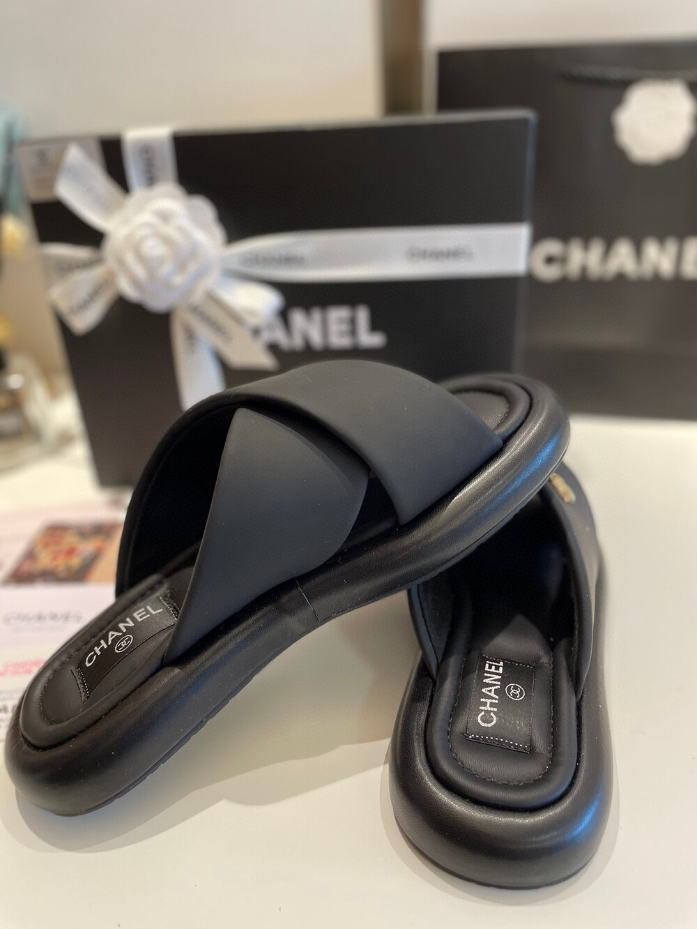 Chanel VIP Gift Slipper Special 35-40 yards Chanel Cross Platform Slippers. This cross-platform mule has a very comfortable fit as it gently wraps the top of the foot with cushion material. I recommend the standard size. The standard size is prettier because it is more elastic than leather. It's a model that I recommend daily because it doesn't come out with this kind of material