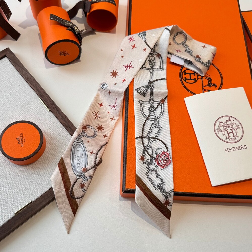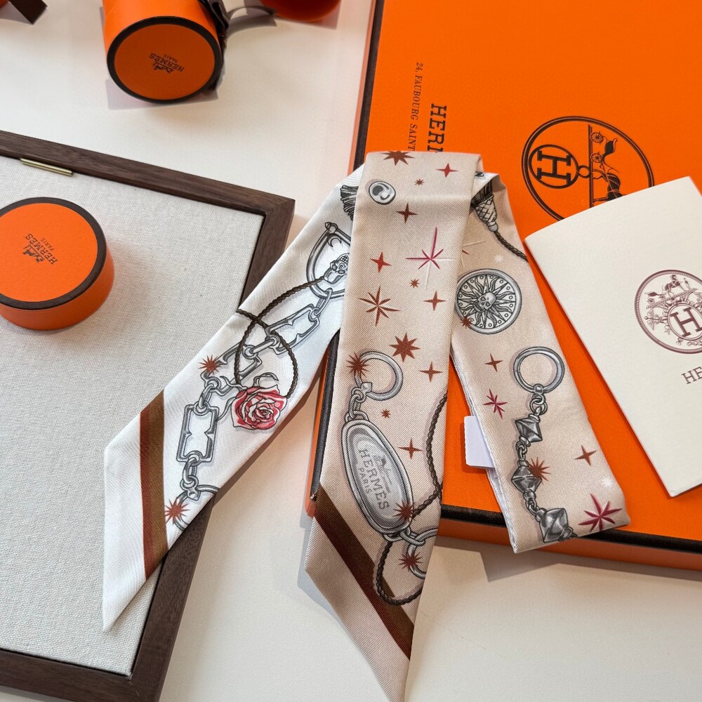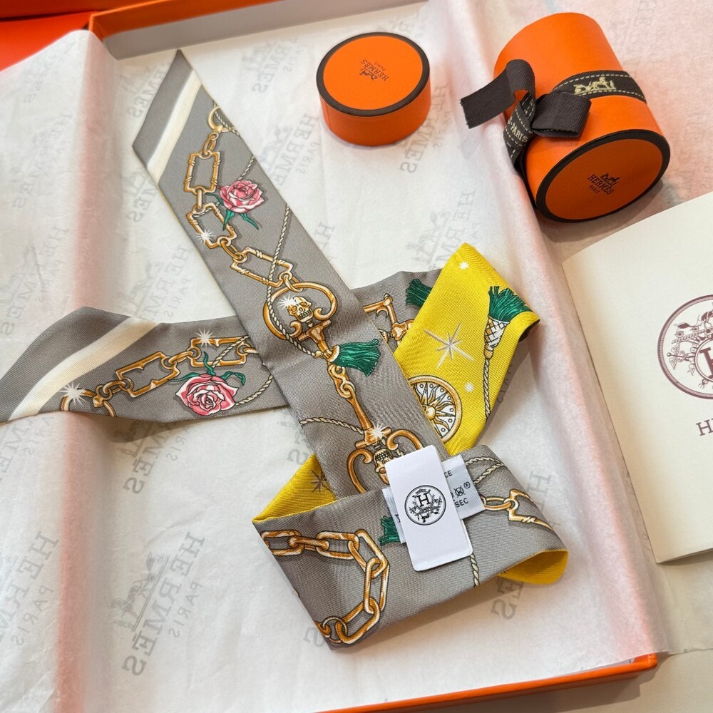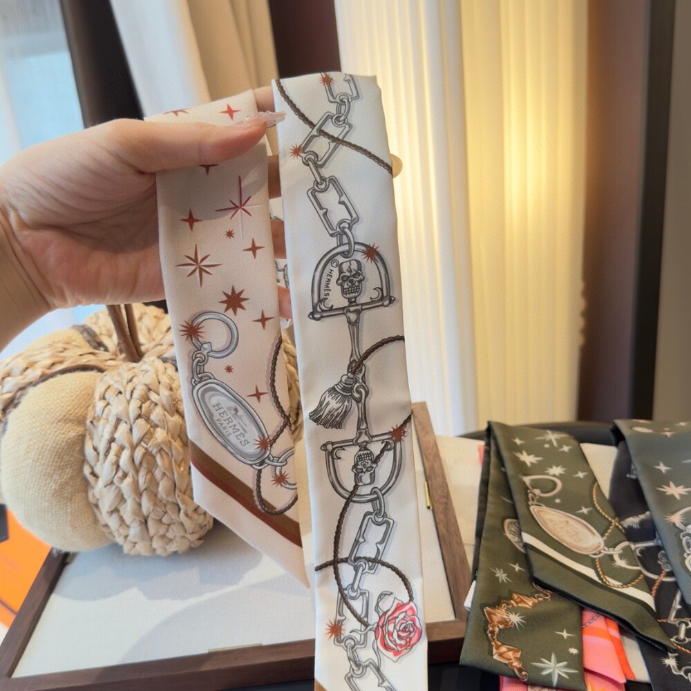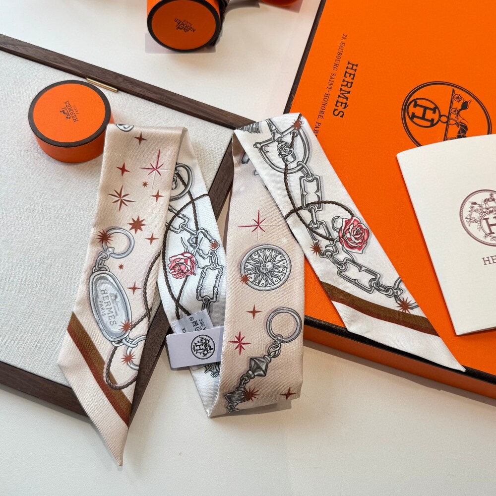 A luxury double-sided twilly silk ribbon scarf crafted from 100% premium twill silk.
