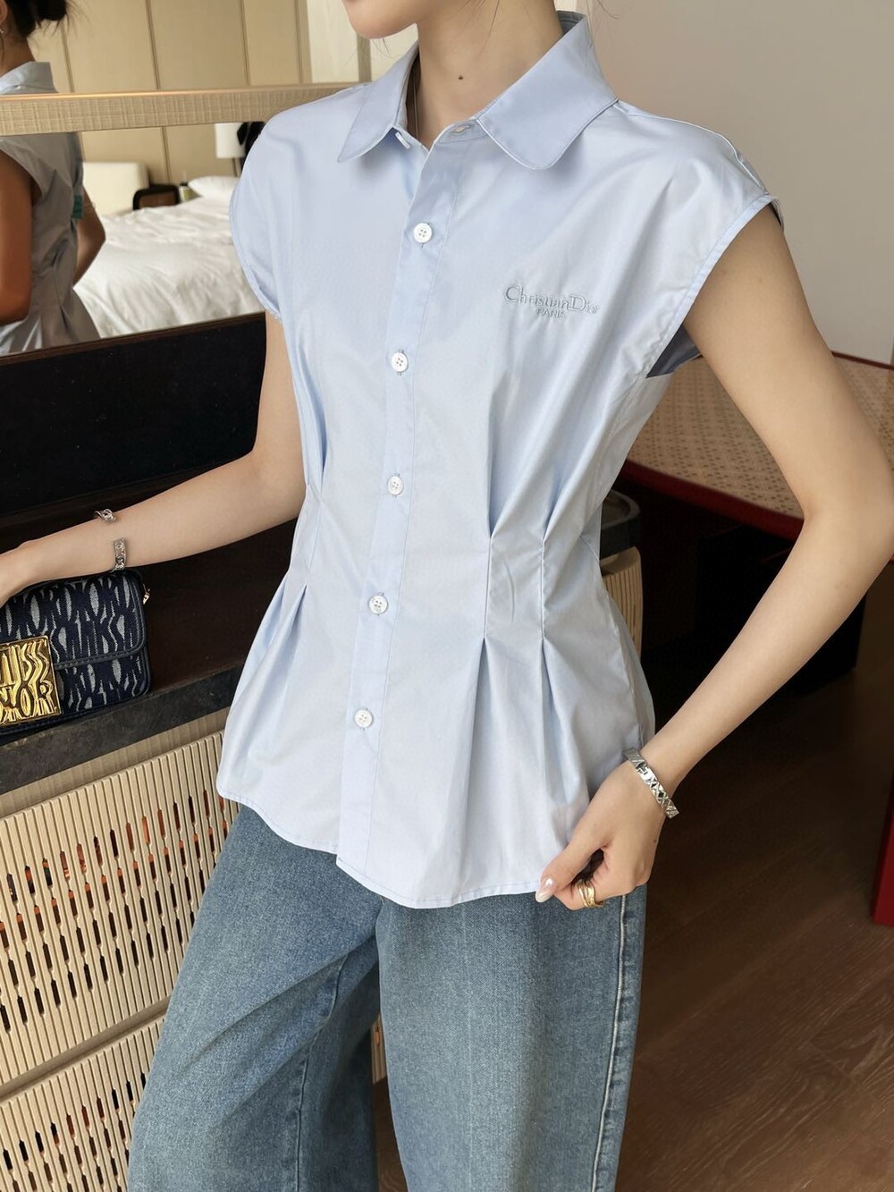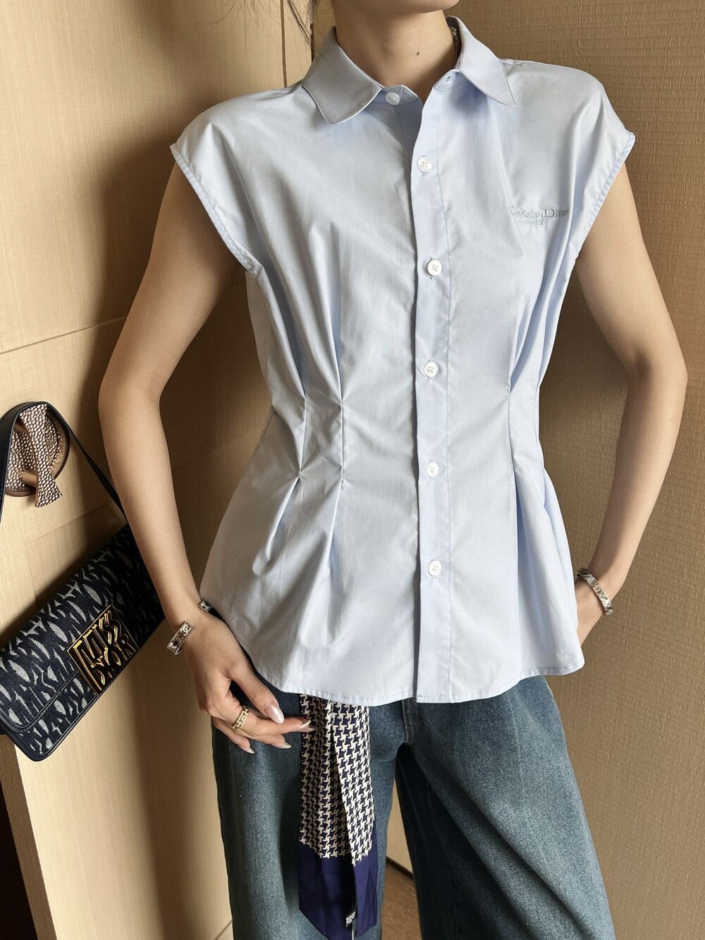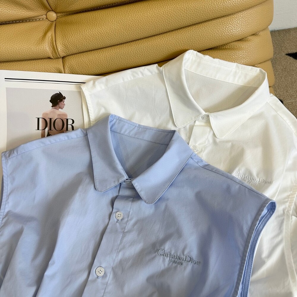 D. CD 레터링 핀턱 민소매 블라우스