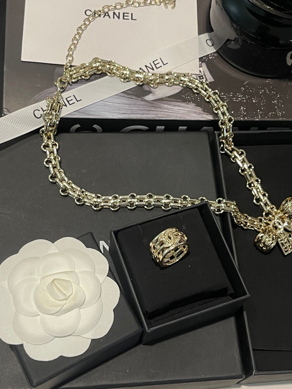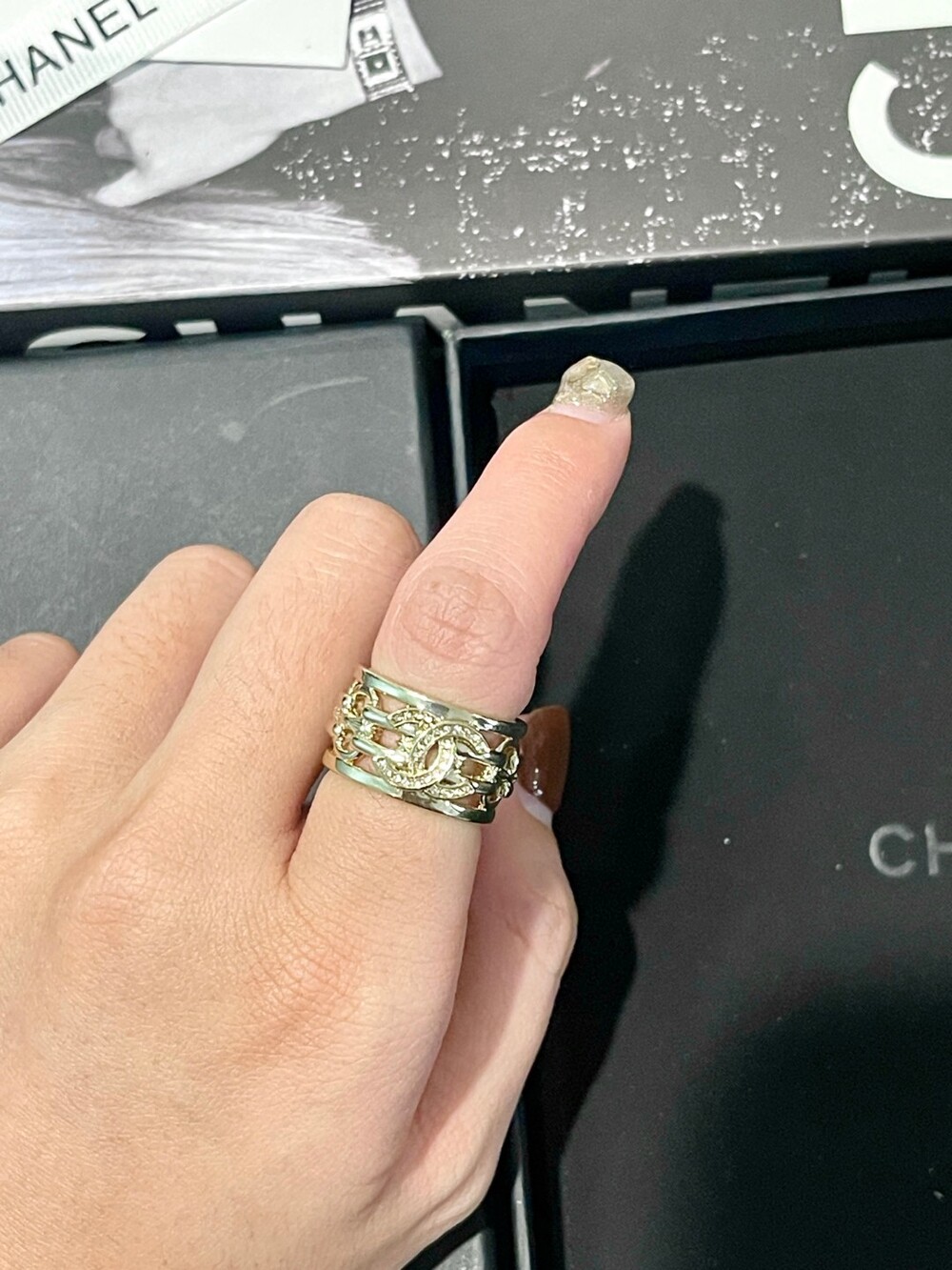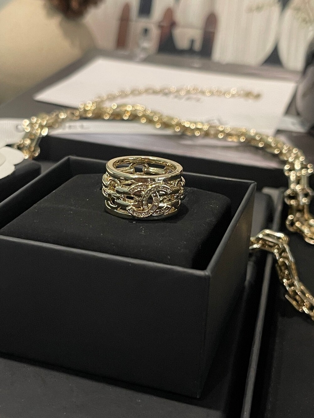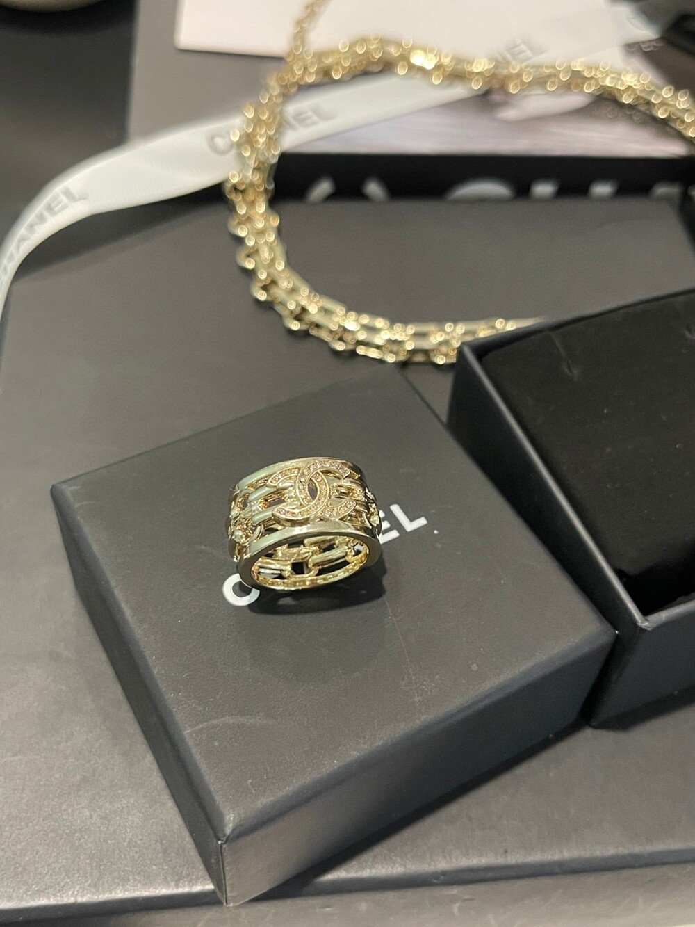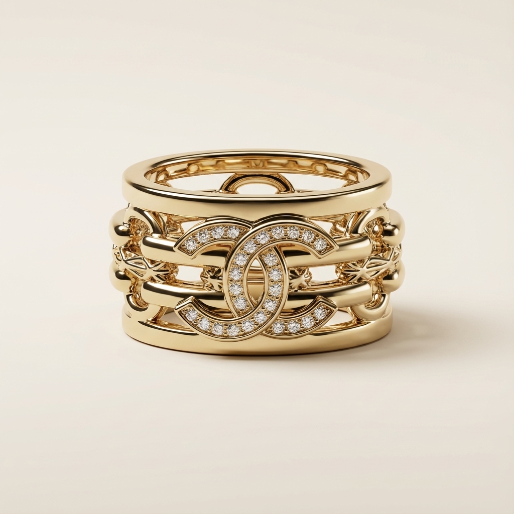 An elegant openwork ring featuring Chanel’s signature double C motif,