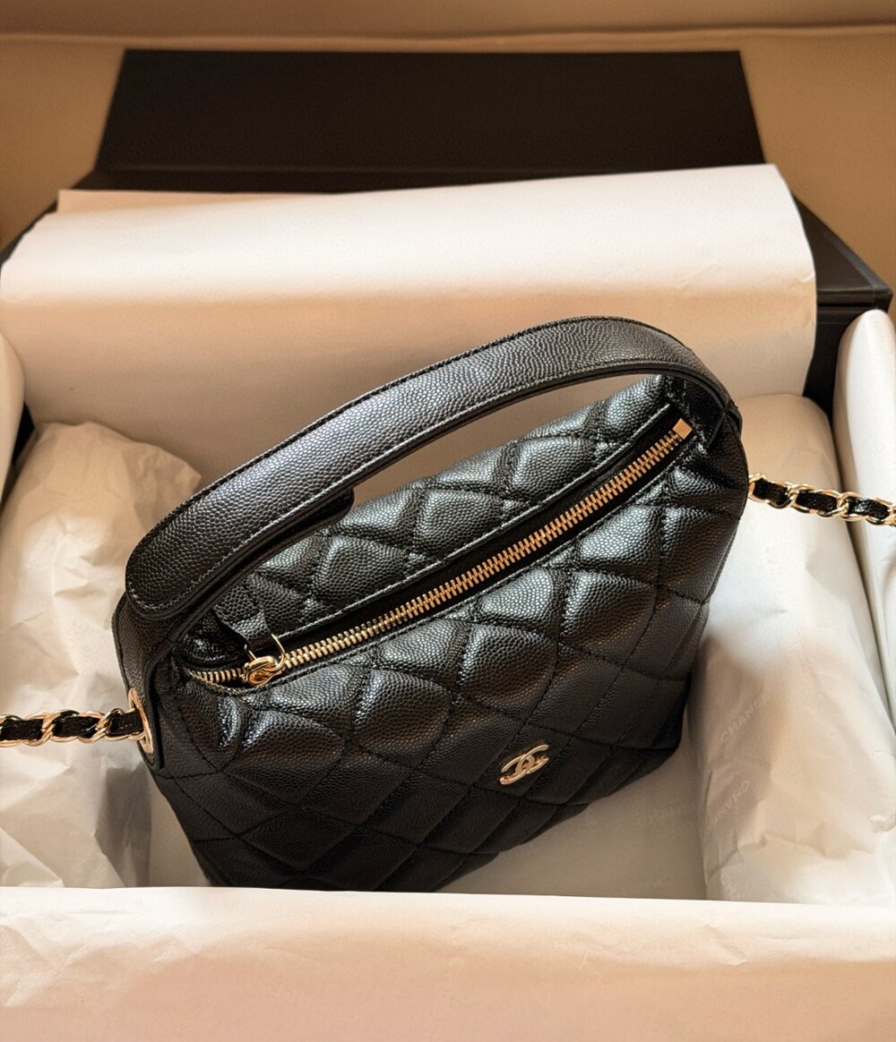 클래식한 매력이 돋보이는 Chanel 미니 베니티 ‘런치박스’ 백입니다.