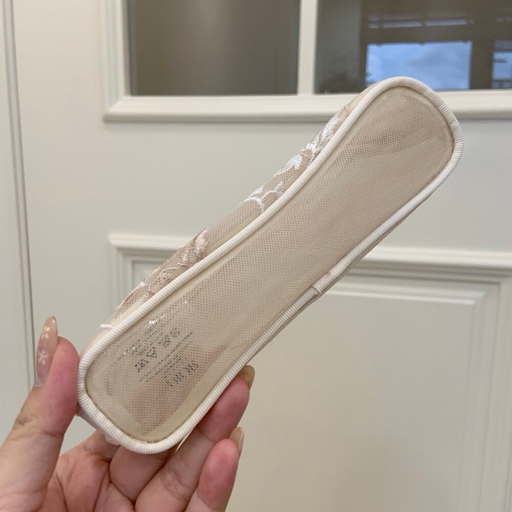 Crafted in a soft beige mesh fabric with delicate floral and butterfly embroidery.