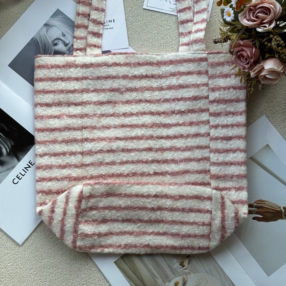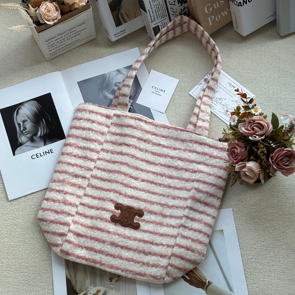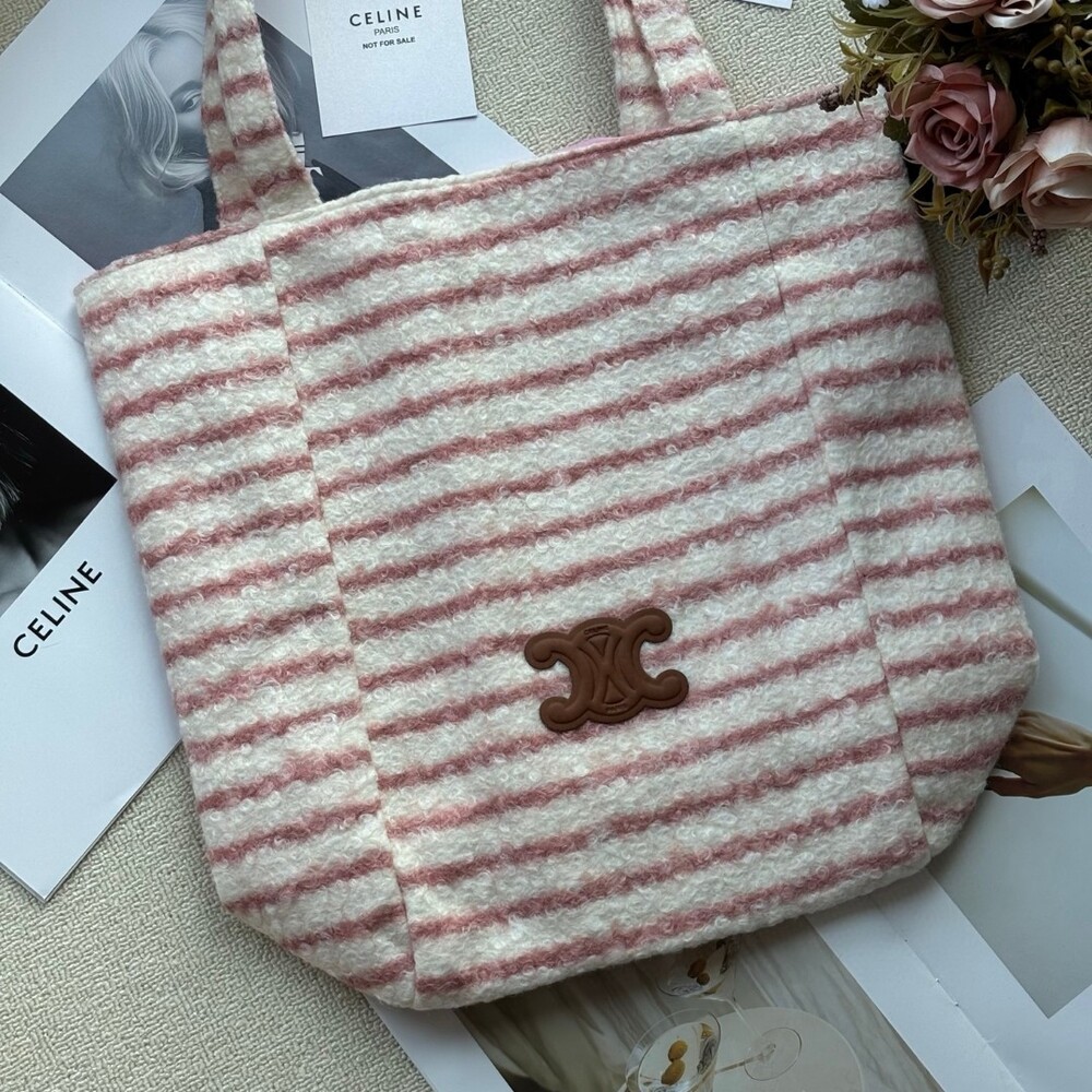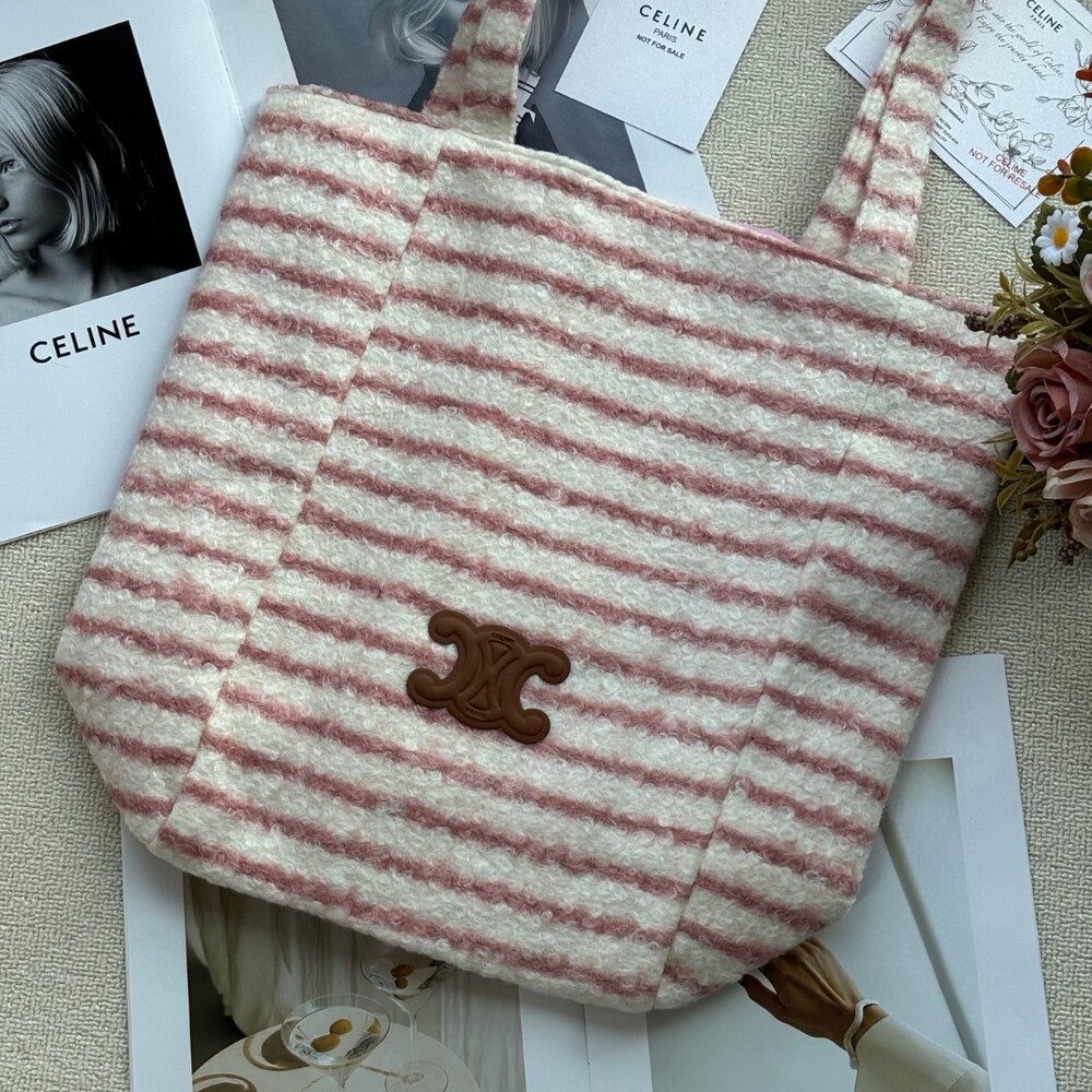 A cozy and stylish plush tote bag from Celine’s iconic Triomphe collection.Perfect for autumn and winter, this bag offers a soft, warm texture that feels luxurious to the touch while keeping your hands cozy.Its elegant striped pattern and signature Triomphe emblem make it a chic yet practical piece for daily use.Size: 39 × 37 cm