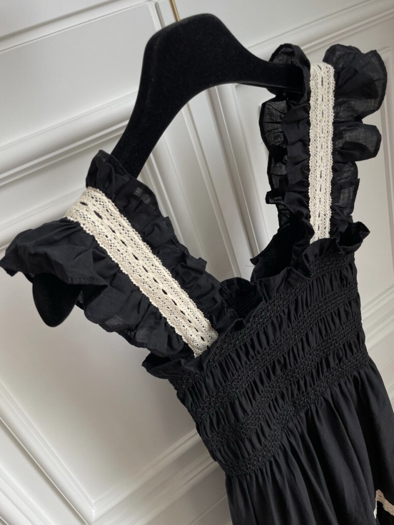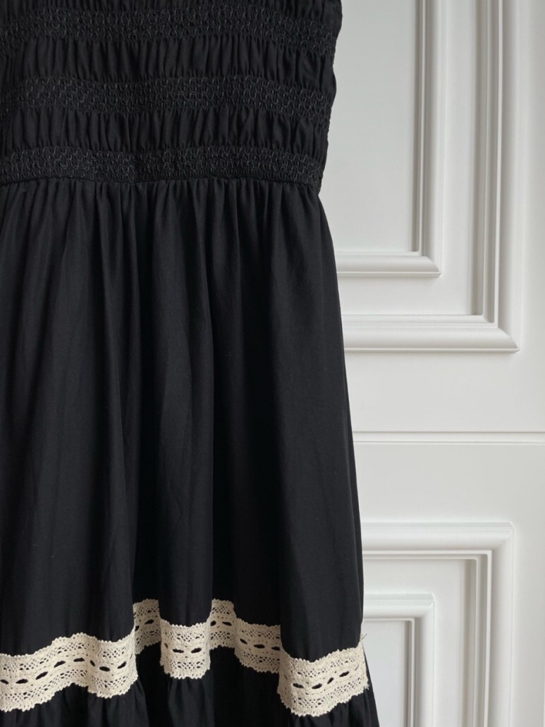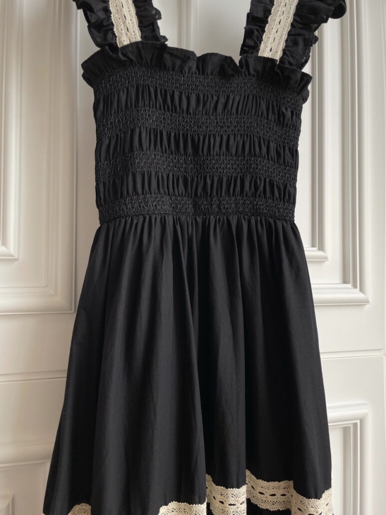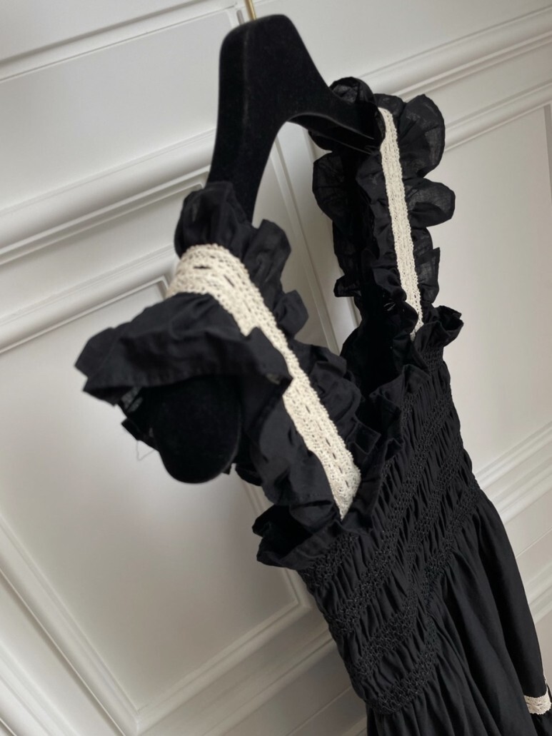 숄더 프릴이 귀여움을 주는 원피스이구요 가슴부분 전체 스모크밴딩으로 되어 있어서 체형에 맞게 늘어납니다🖤