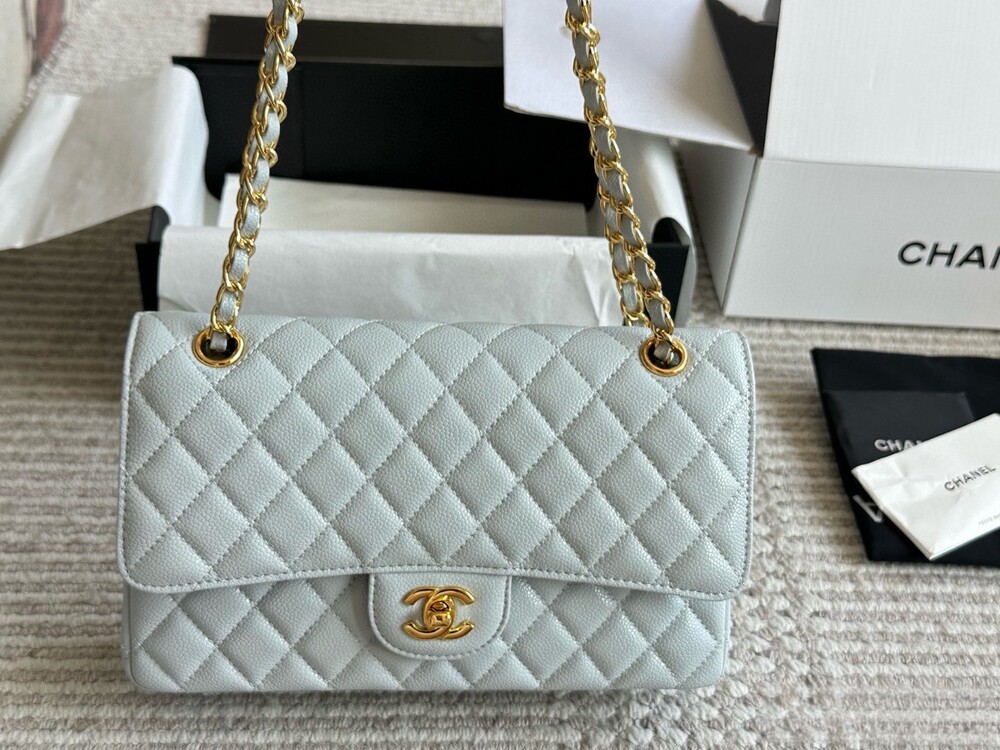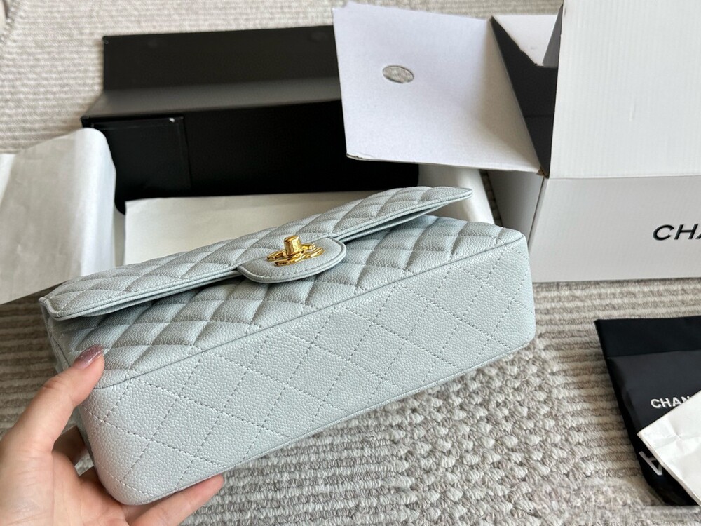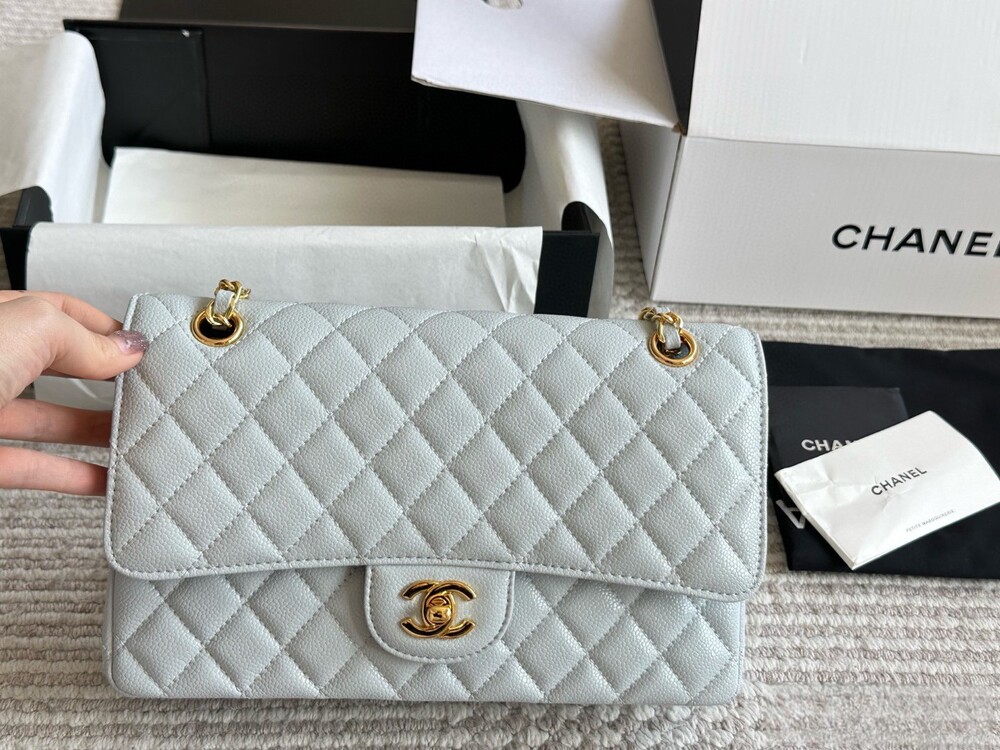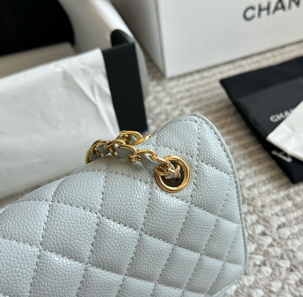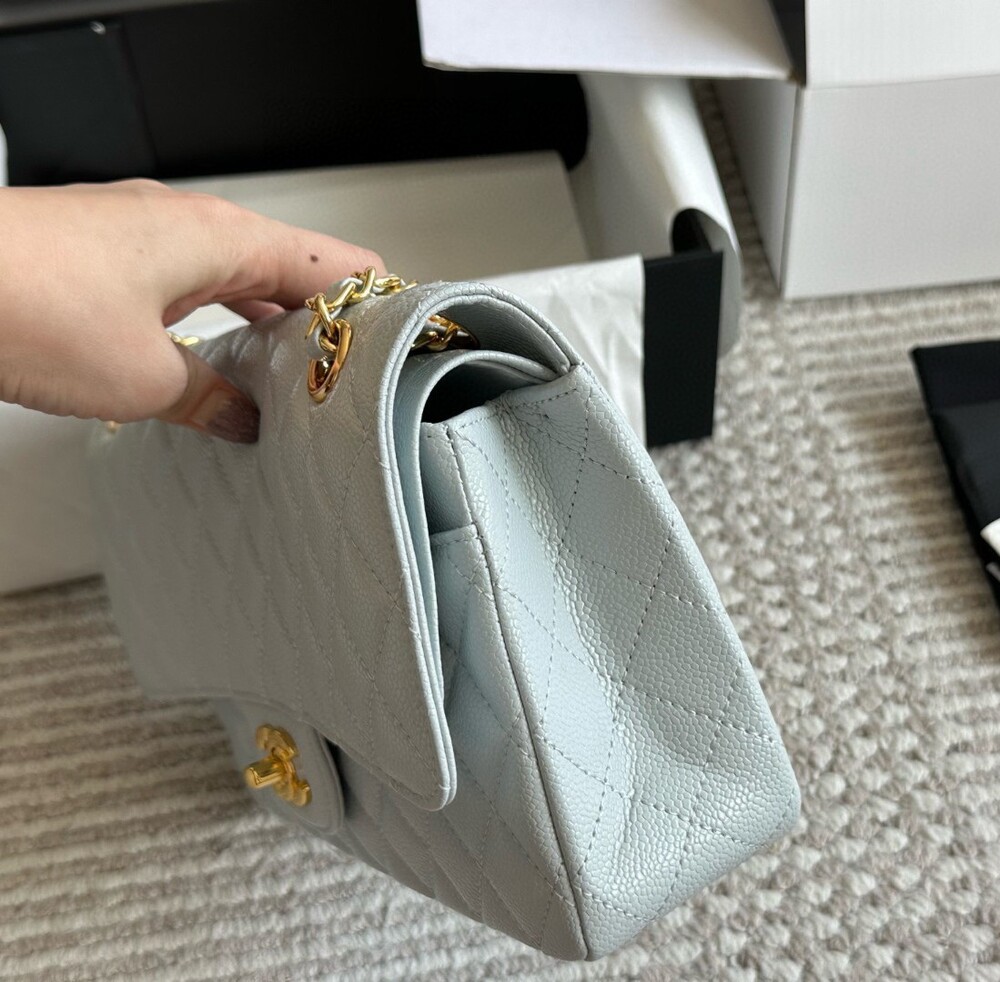 this 25cm model features luxurious light gray caviar calfskin paired with elegant gold hardware.