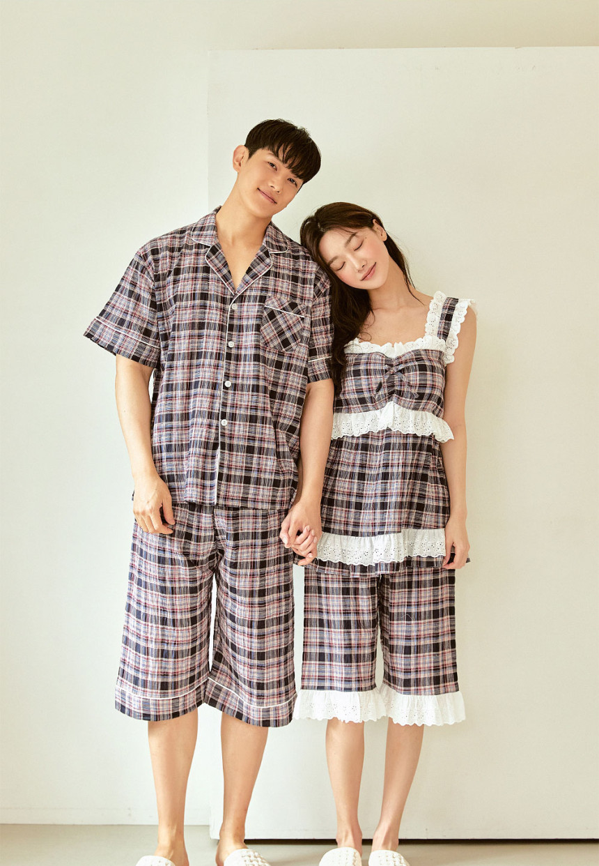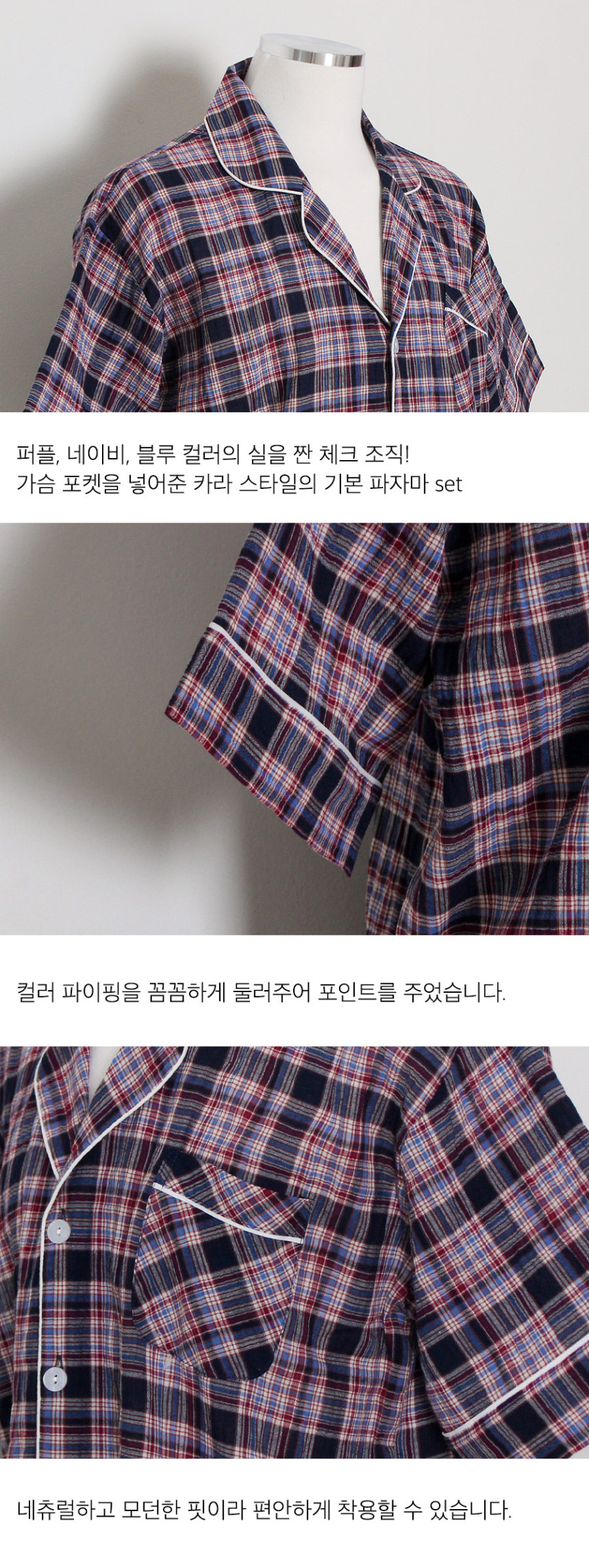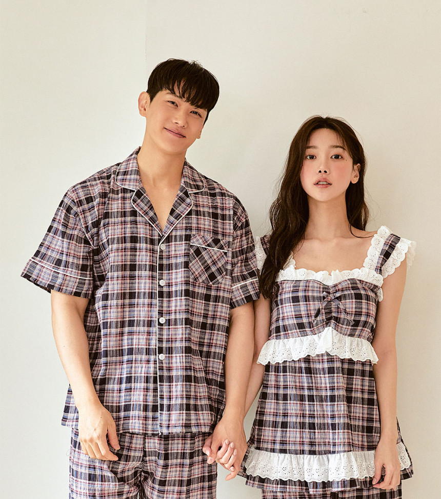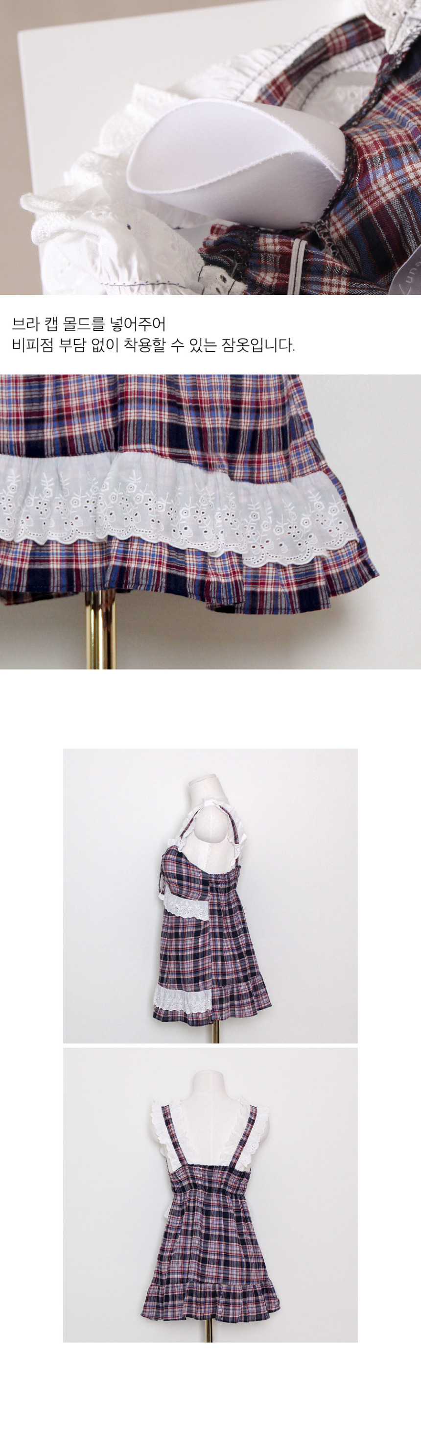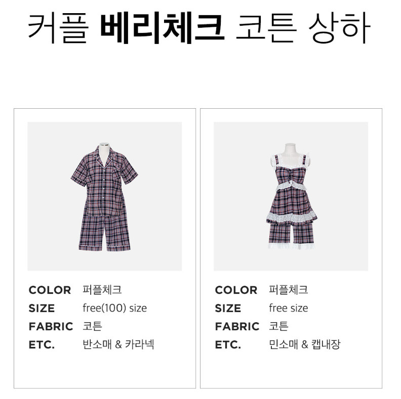 여성 남성 커플 베리체크 원피스 투피스 캡내장 수면 잠옷