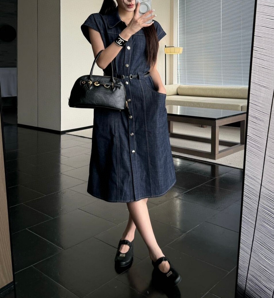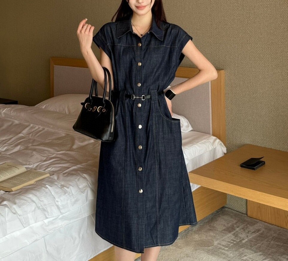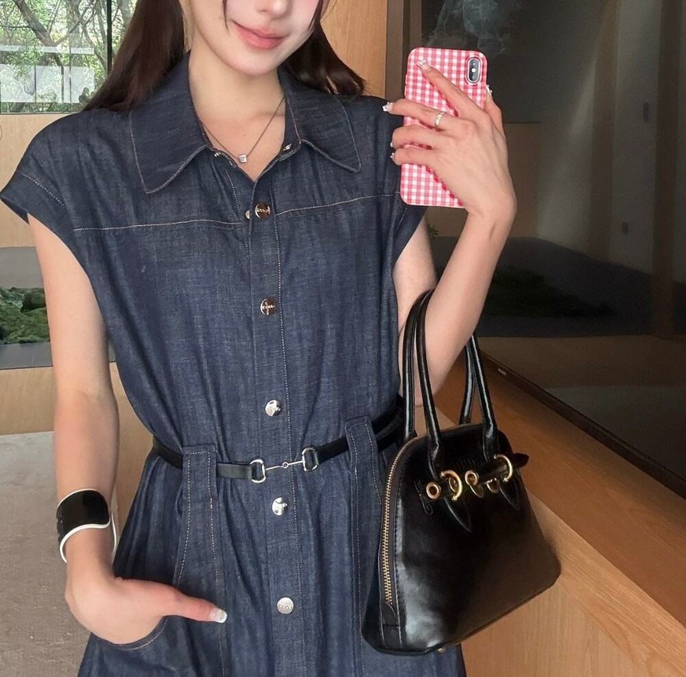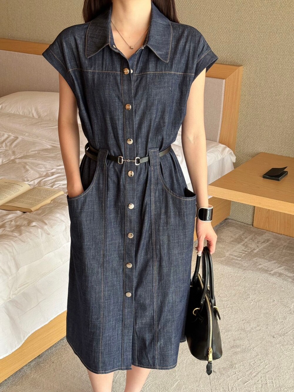 클래식한 진청 컬러의 슬리브 데님 원피스 입니다