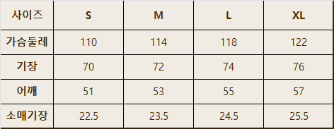 <상의 사이즈표>