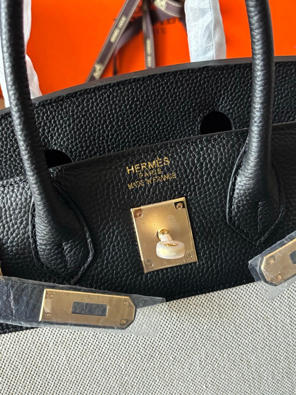 Finished with classic gold-tone hardware and the iconic Birkin lock and keys,