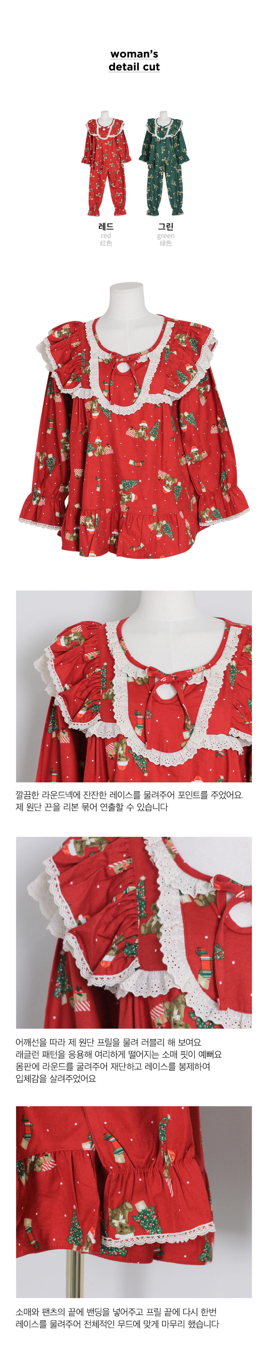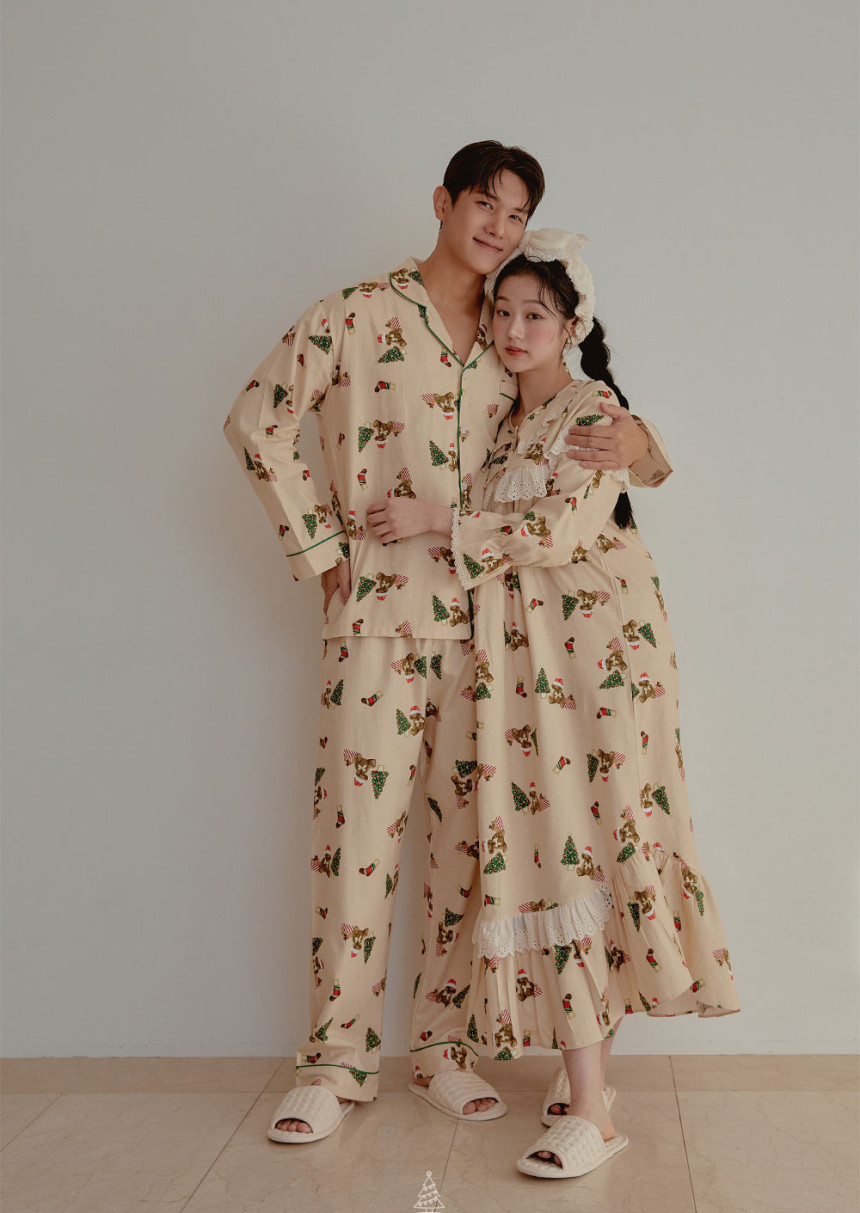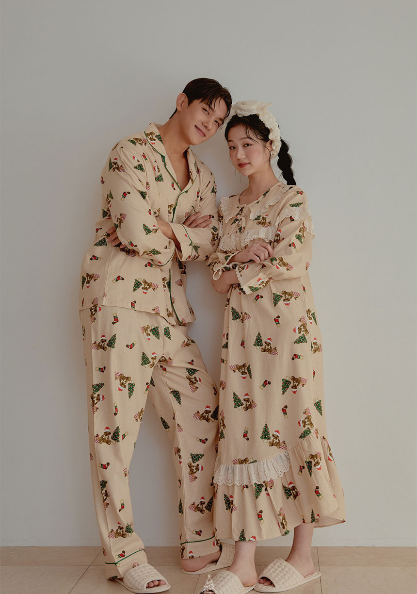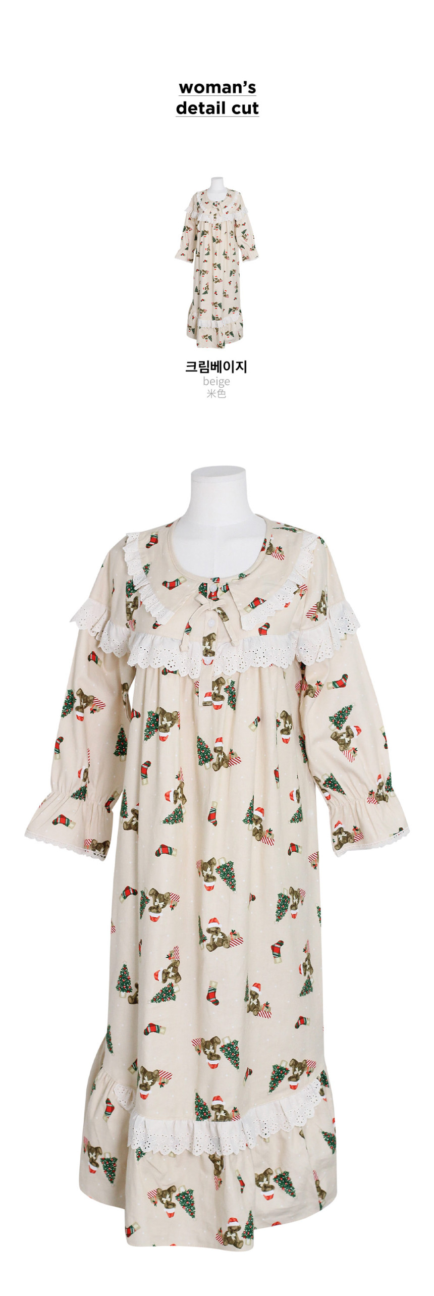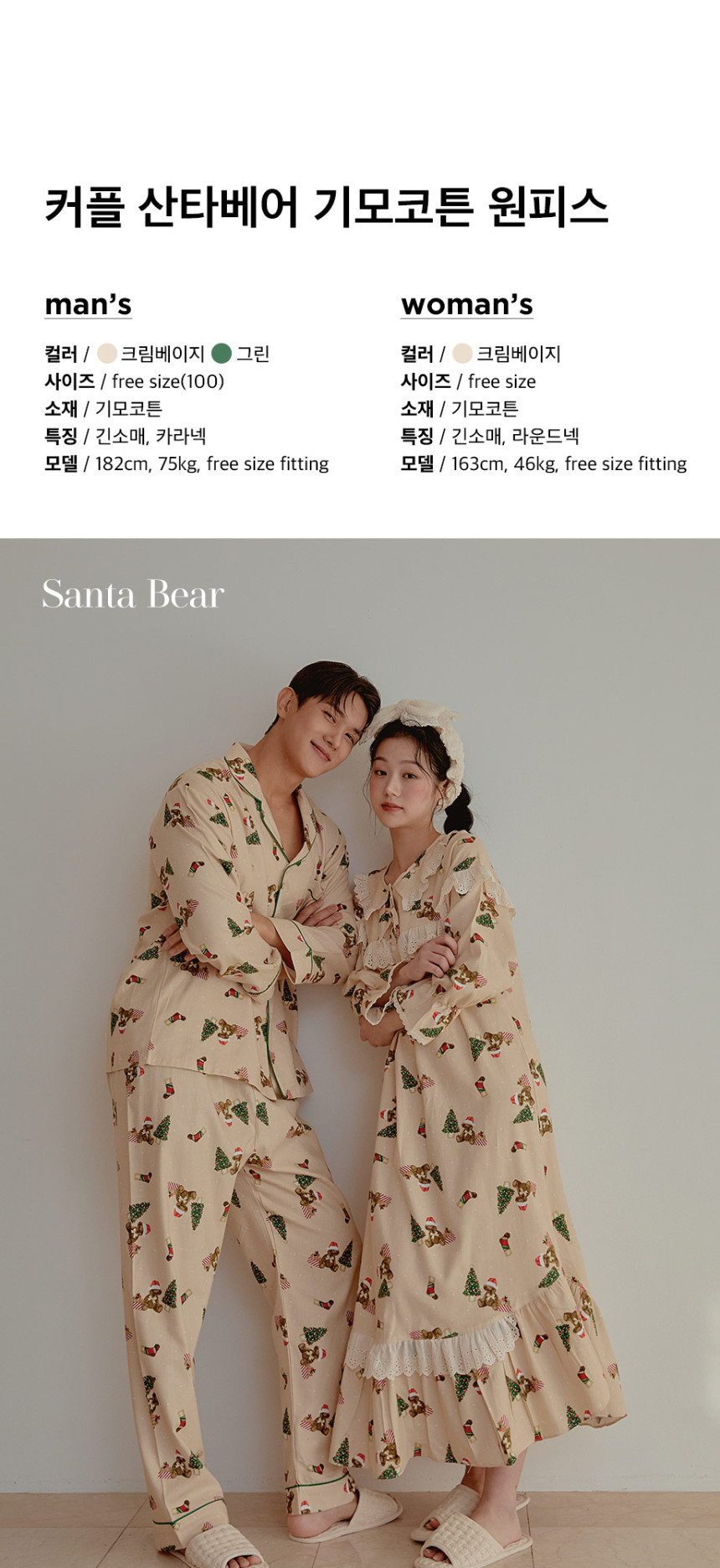 여성 남성 커플산타베어 긴소매 원피스 투피스 레이스 카라 수면 잠옷