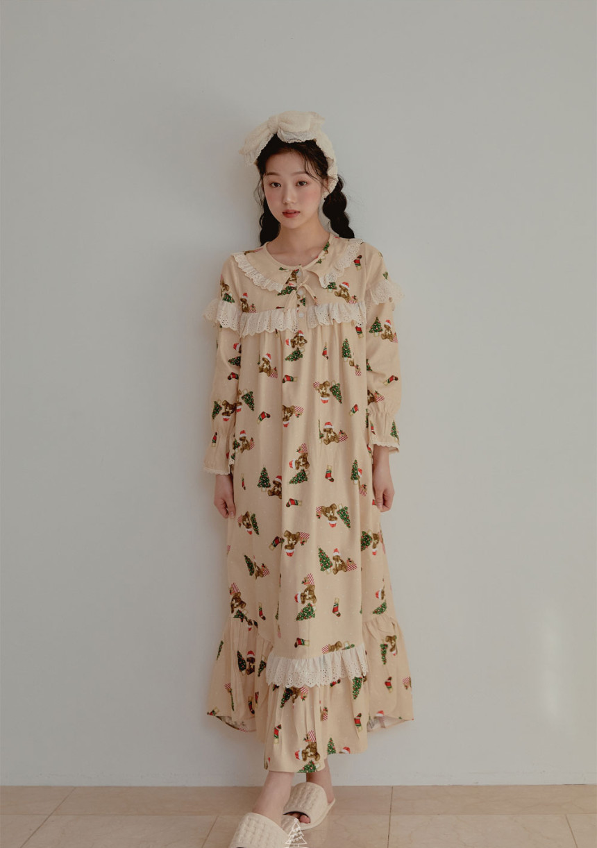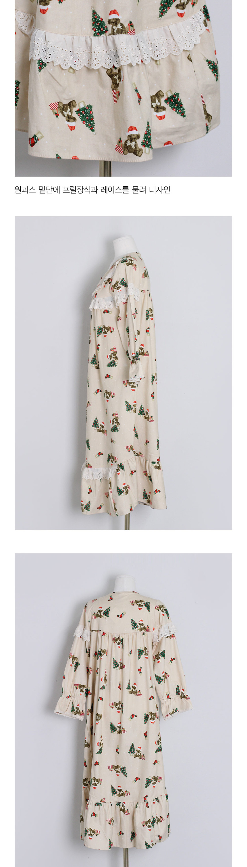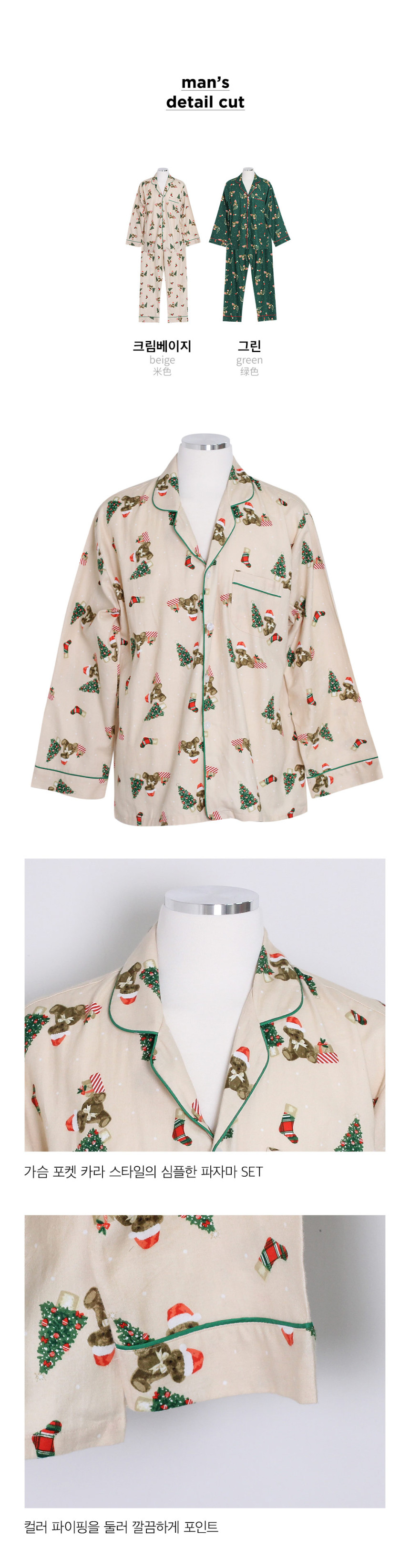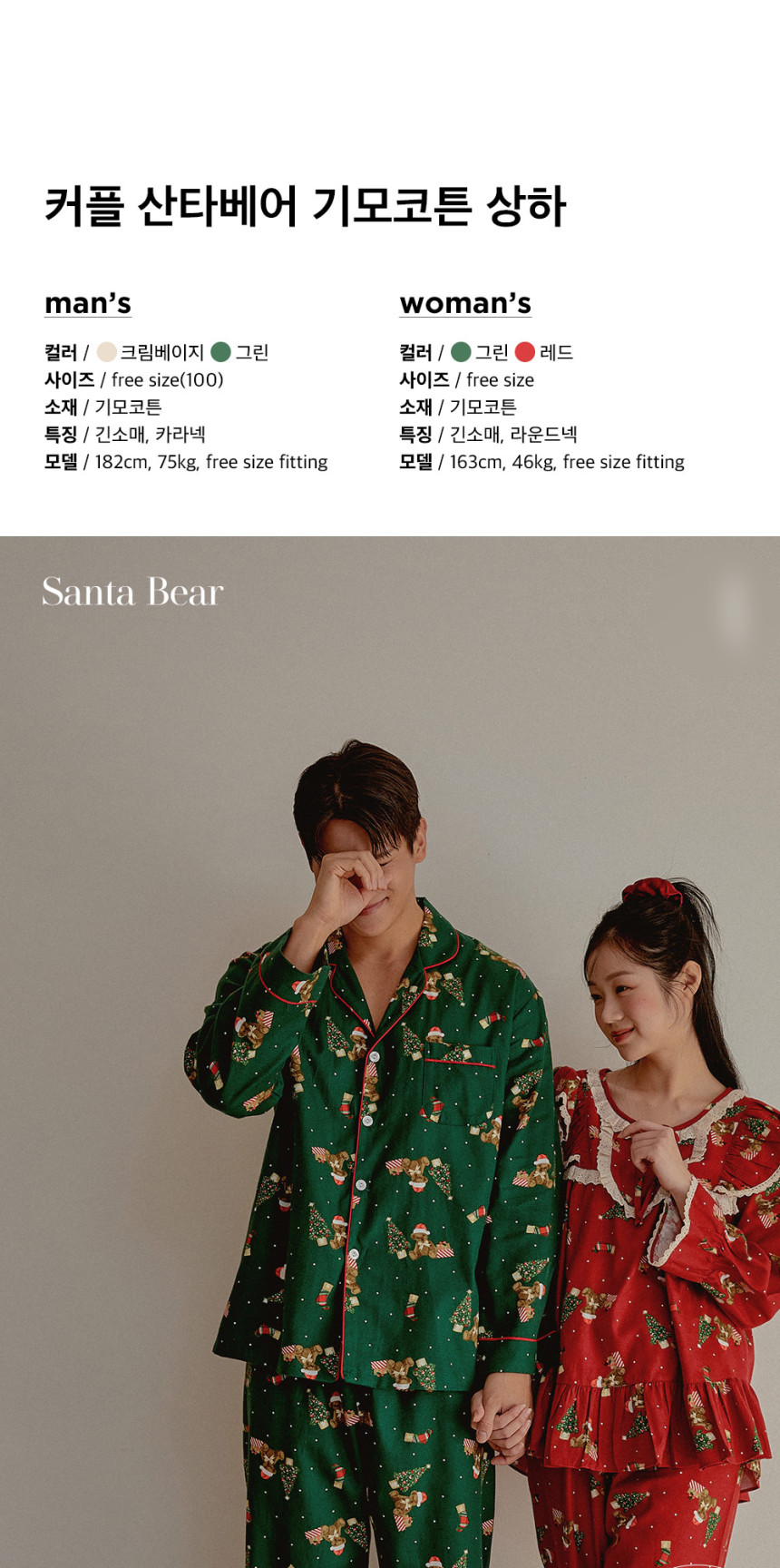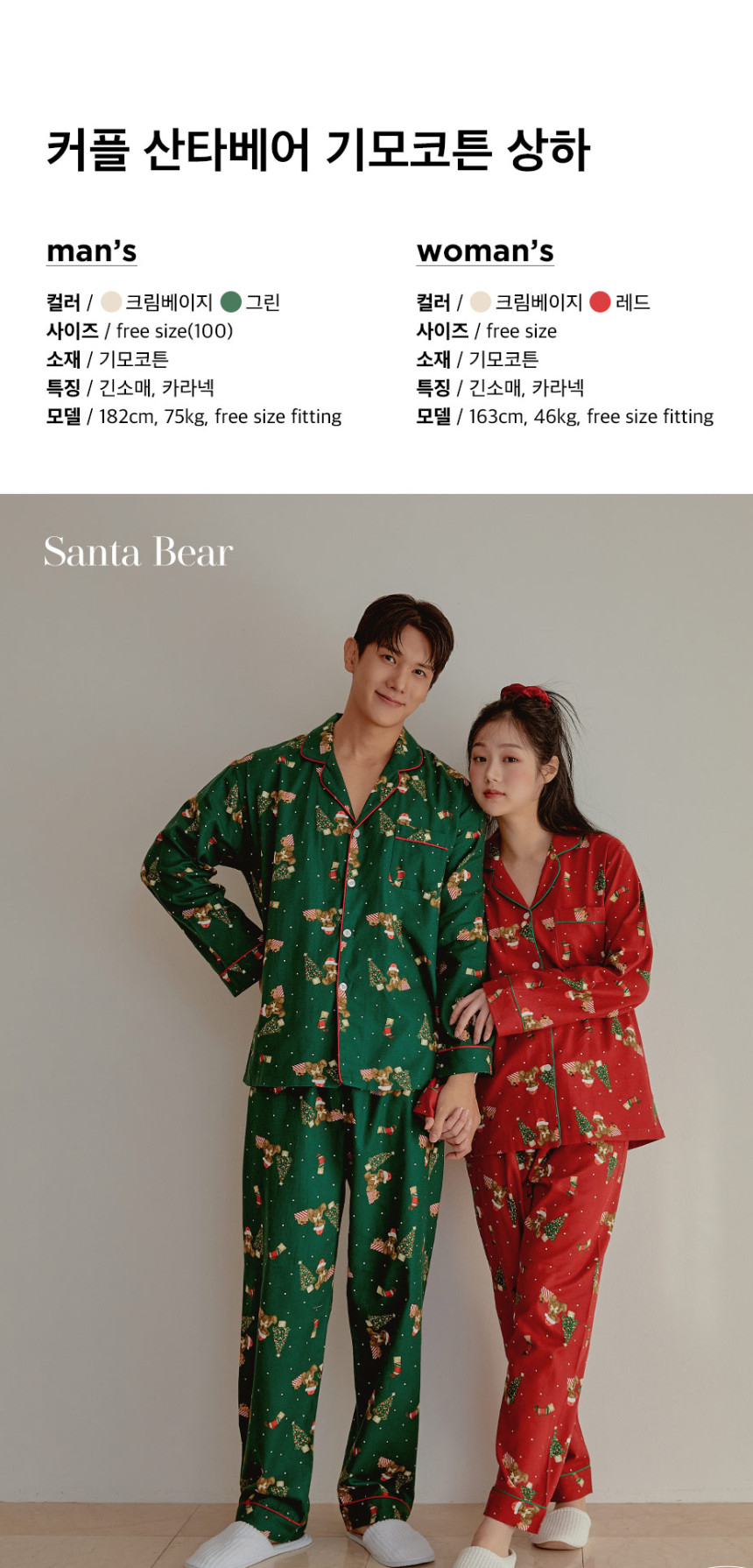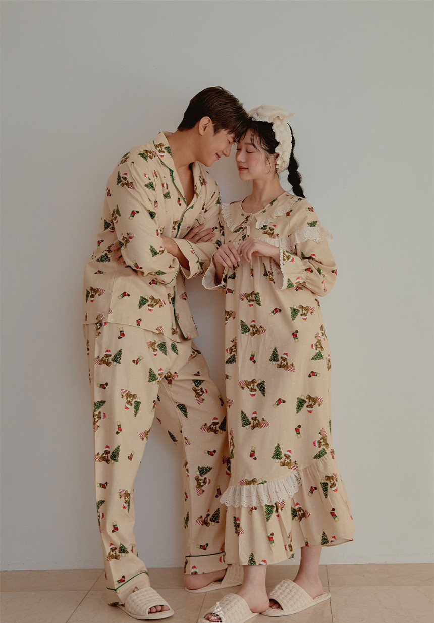 여성 남성 커플산타베어 긴소매 원피스 투피스 레이스 카라 수면 잠옷