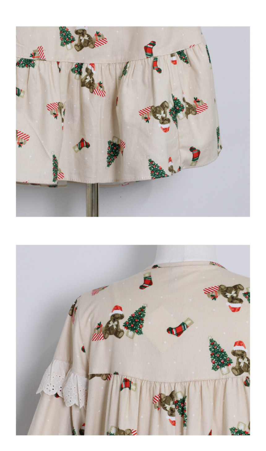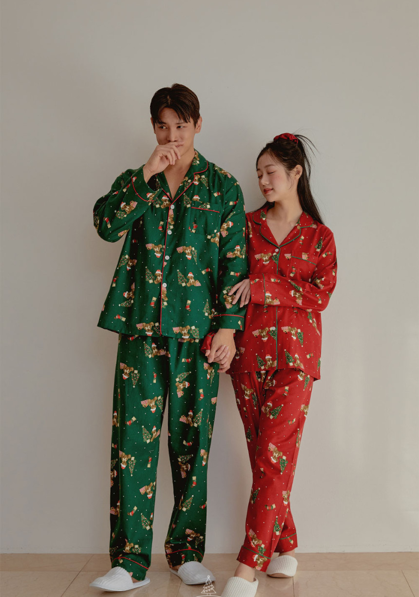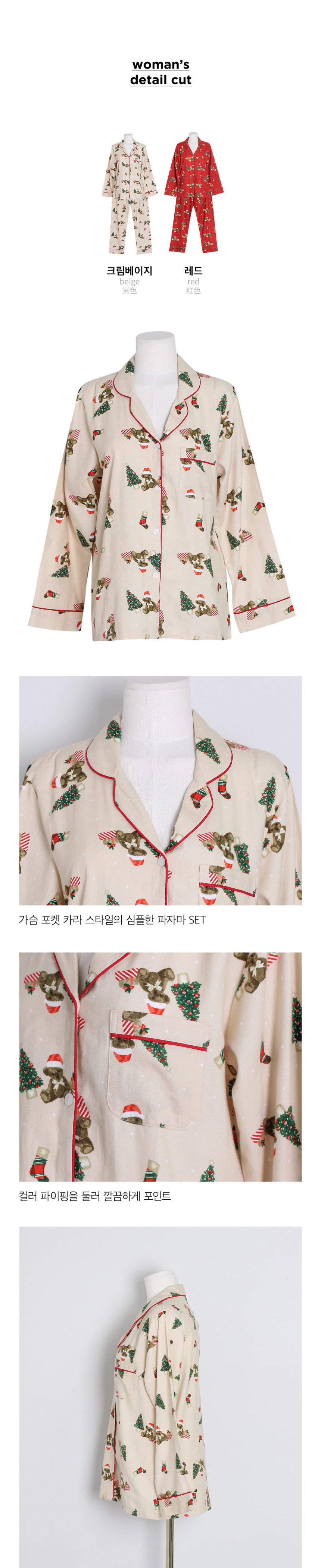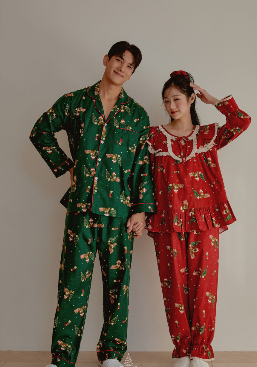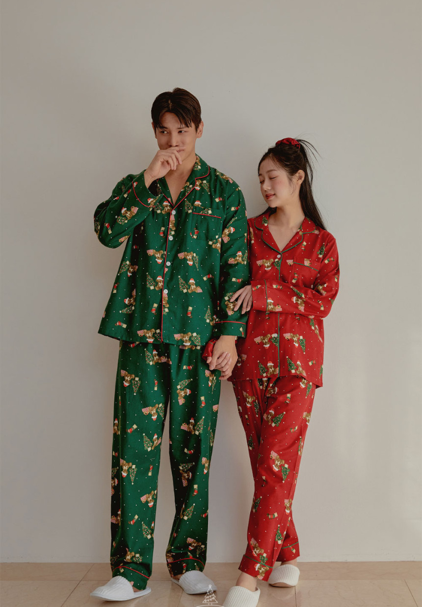 여성 남성 커플산타베어 긴소매 원피스 투피스 레이스 카라 수면 잠옷