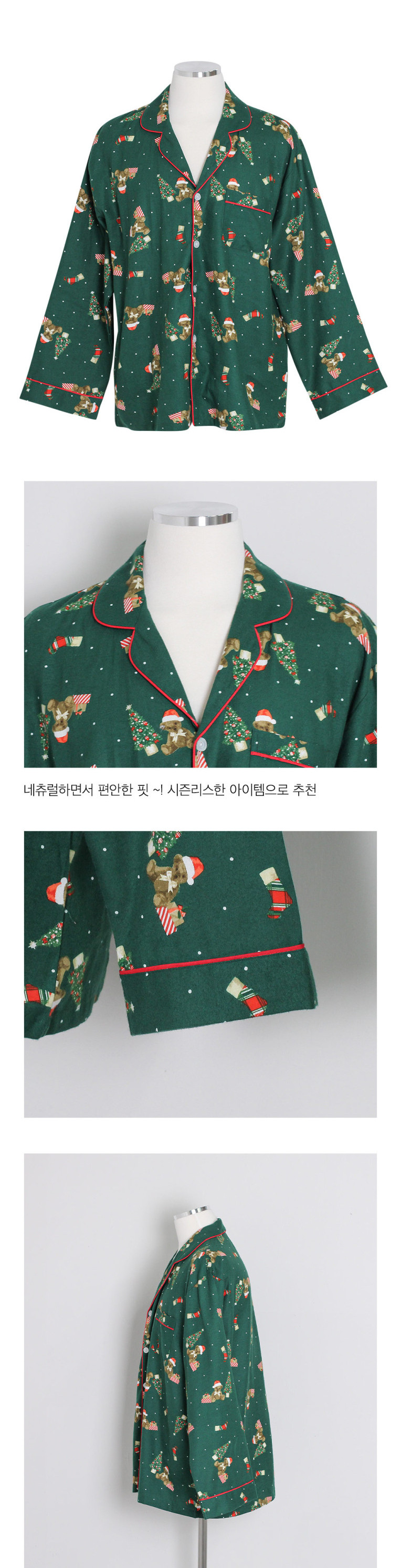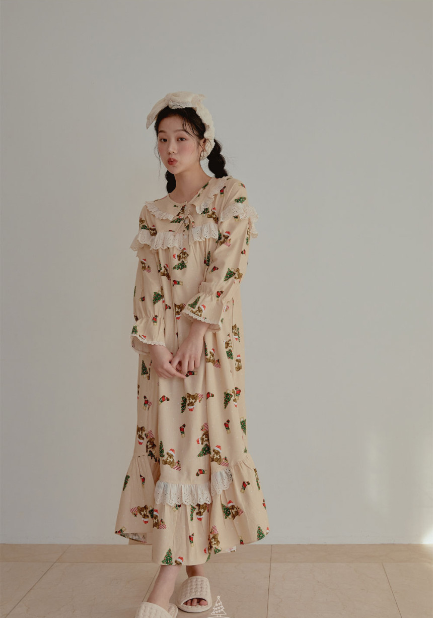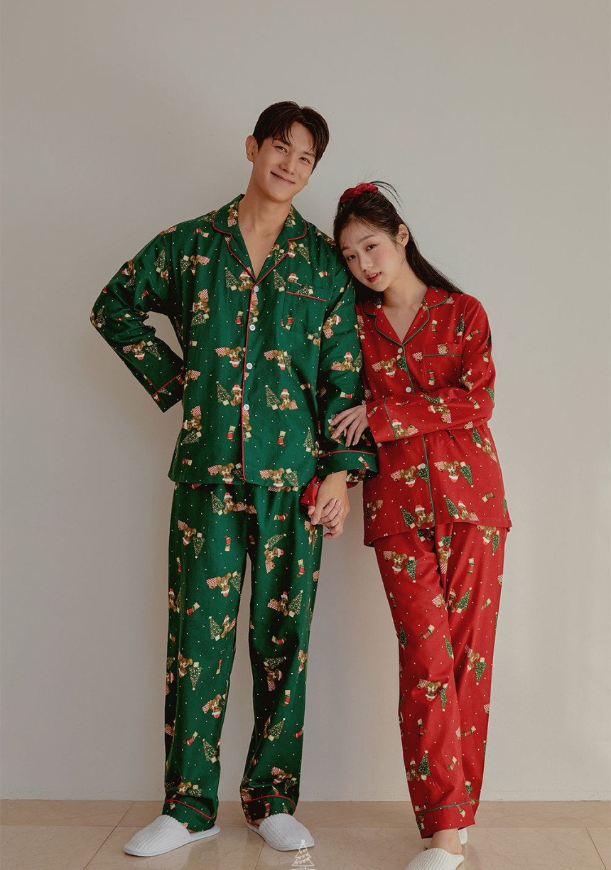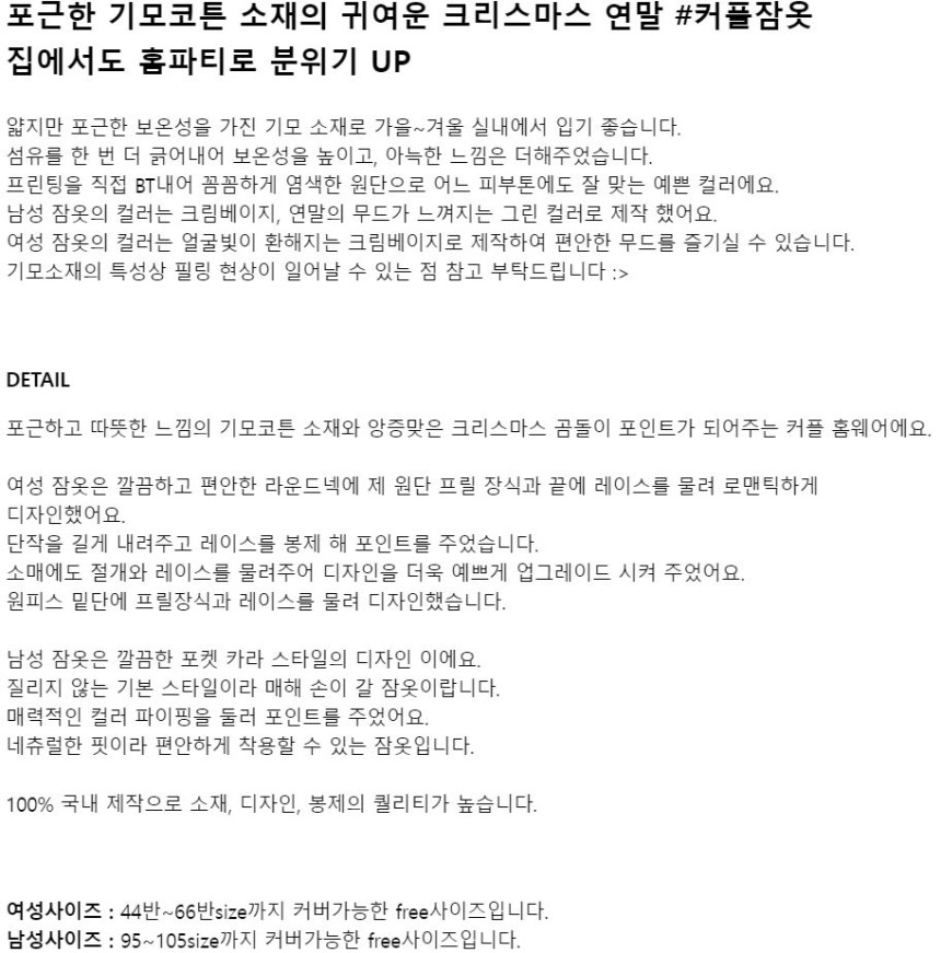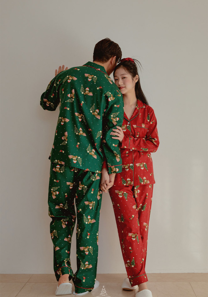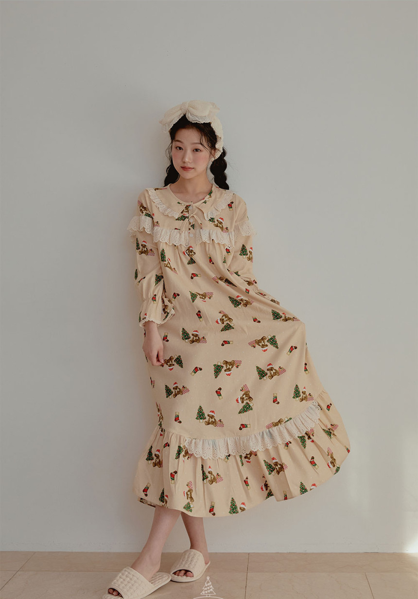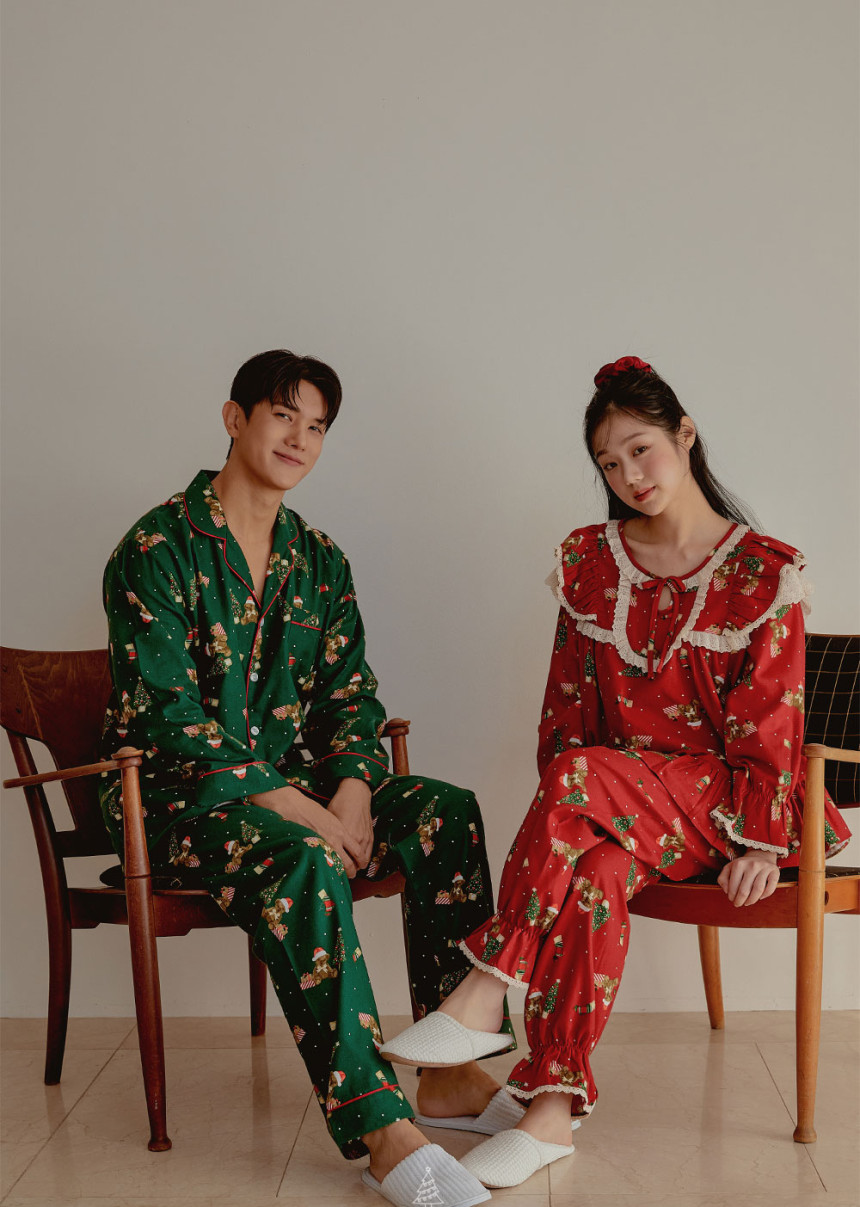 여성 남성 커플산타베어 긴소매 원피스 투피스 레이스 카라 수면 잠옷