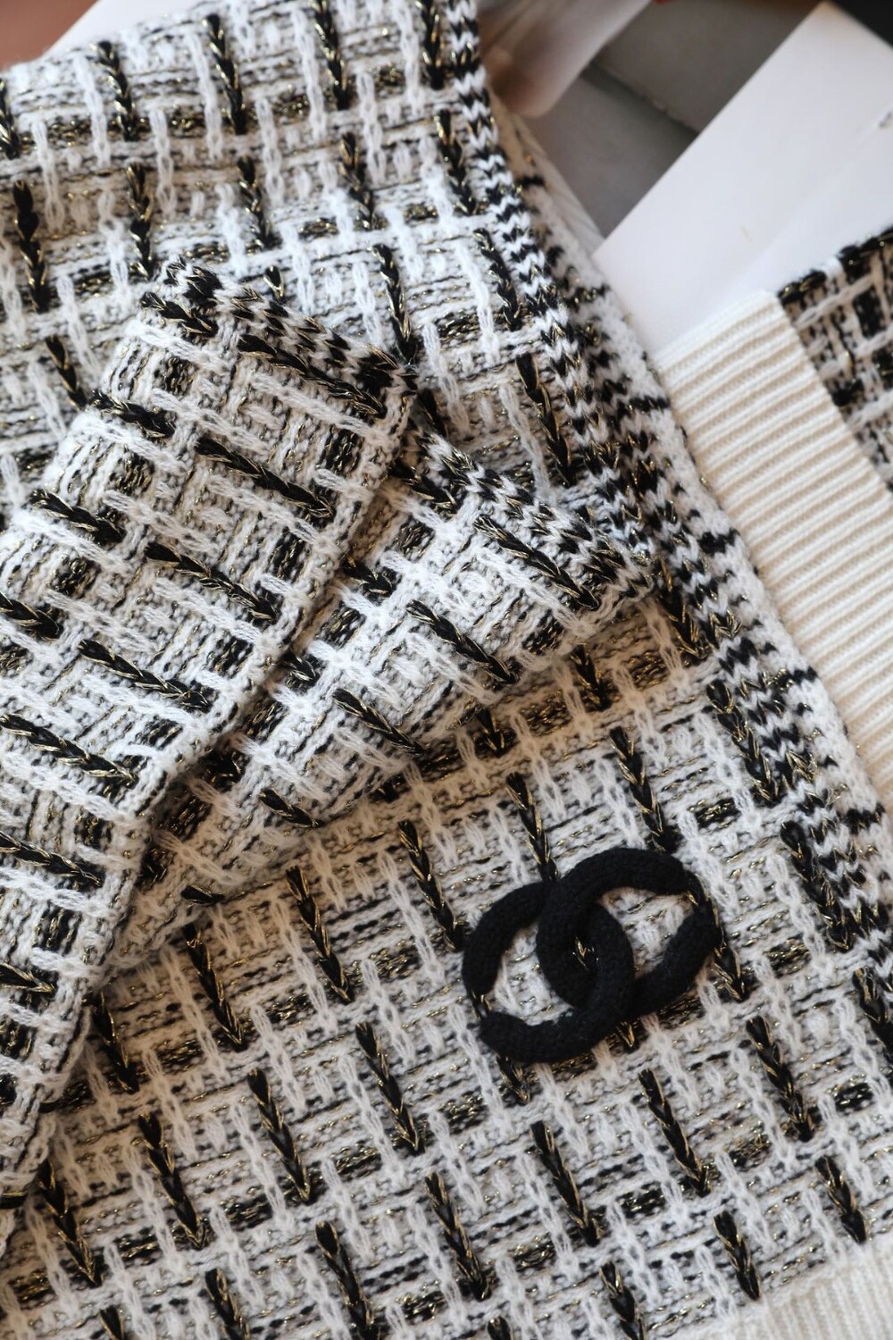 The refined woven texture and iconic Chanel pocket-style detailing elevate the overall look,