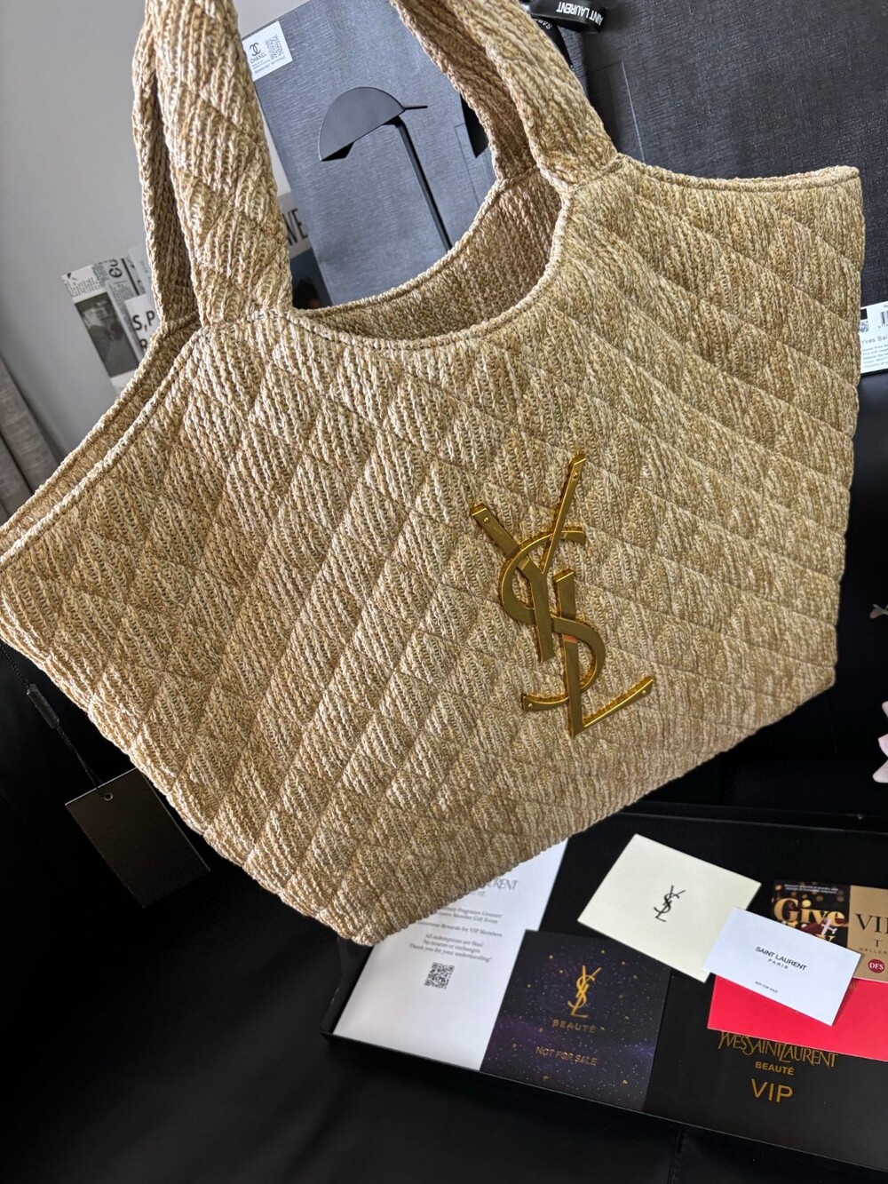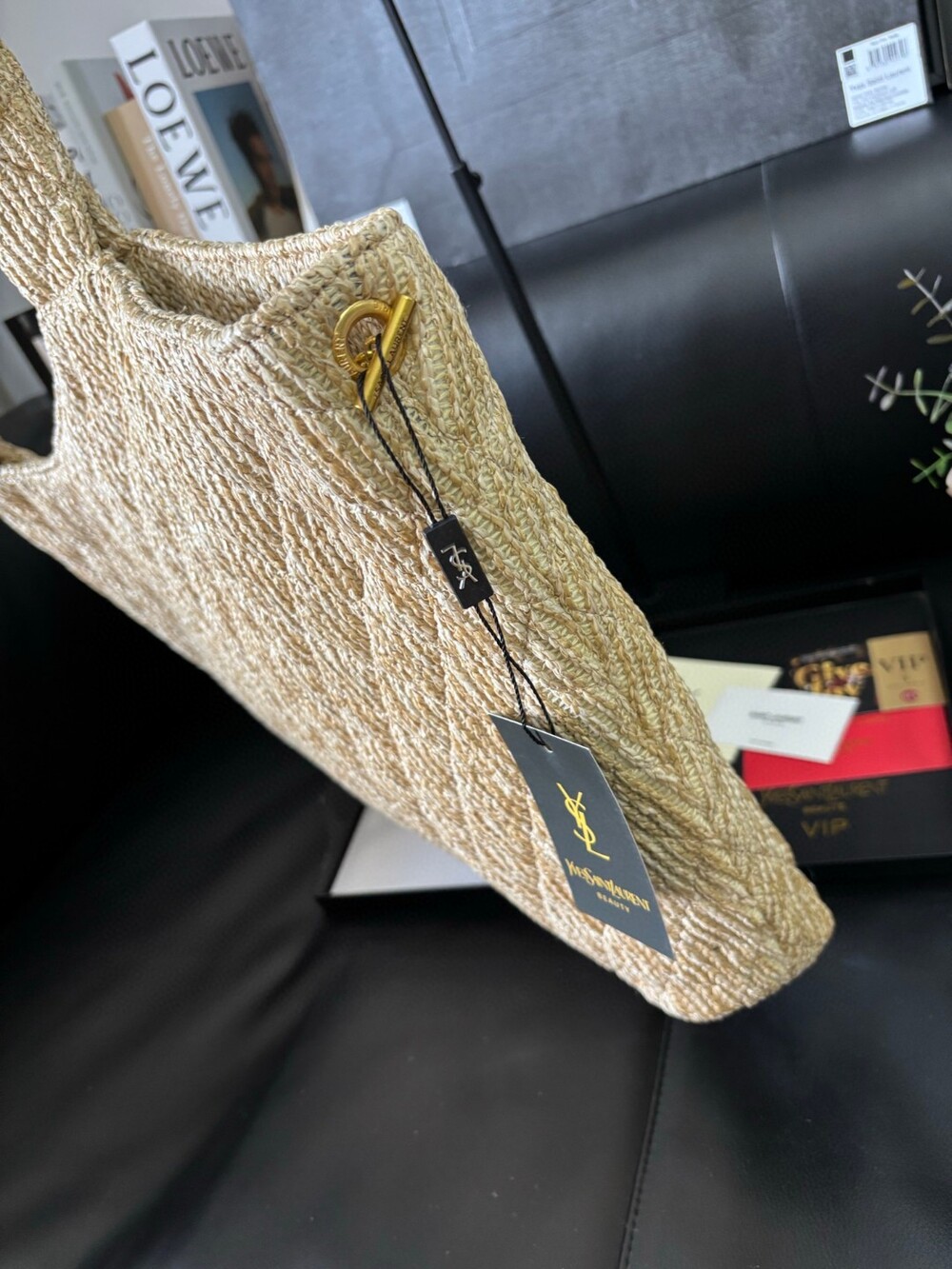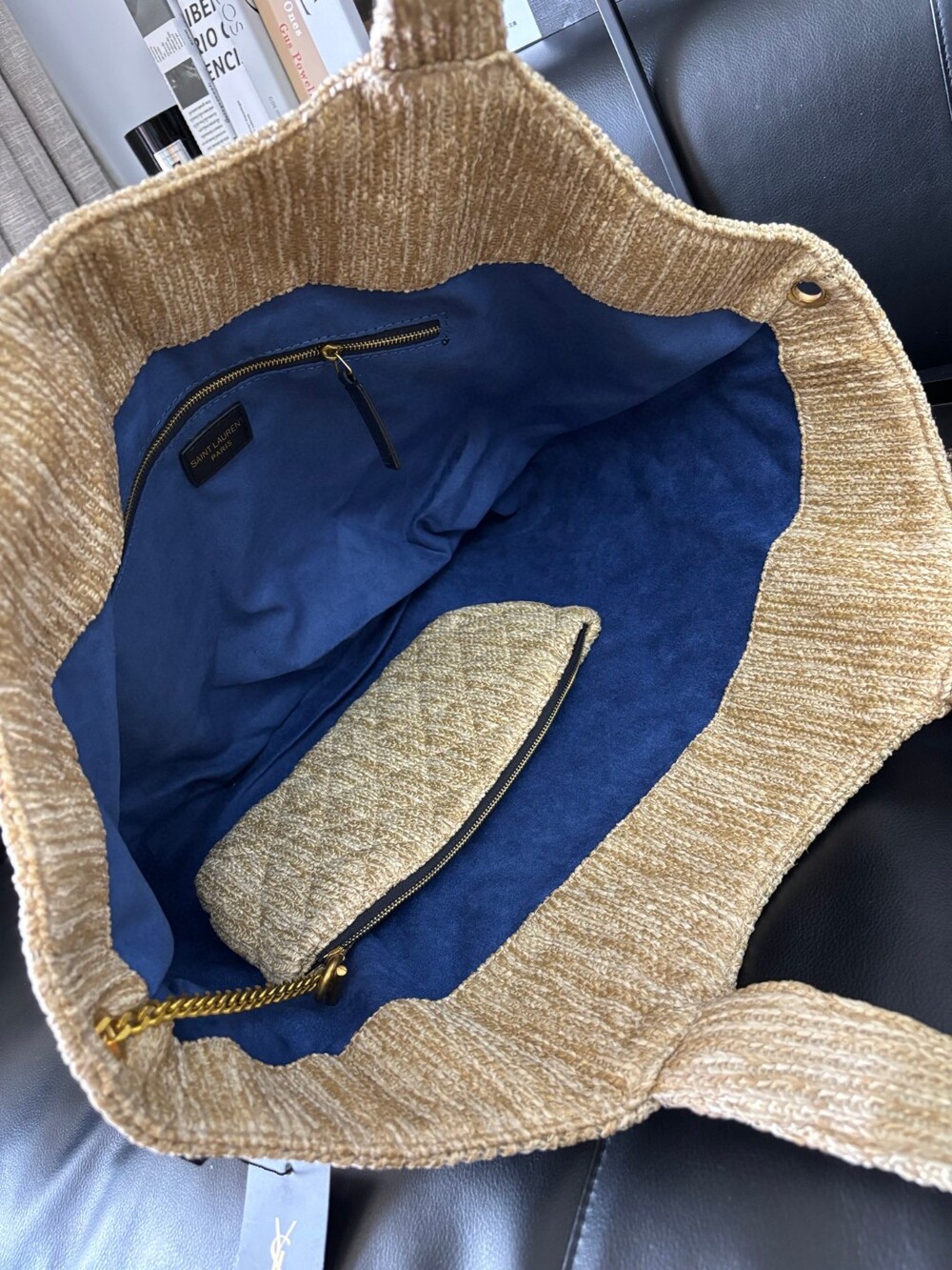 The YSL Large Shopper Tote Bag is crafted from lightweight, delicately woven material, offering a soft yet structured silhouette. Despite its generous size, the bag is surprisingly light. The shimmering YSL interlocking logo adds a refined highlight, making this bag an effortlessly chic match for any outfit.