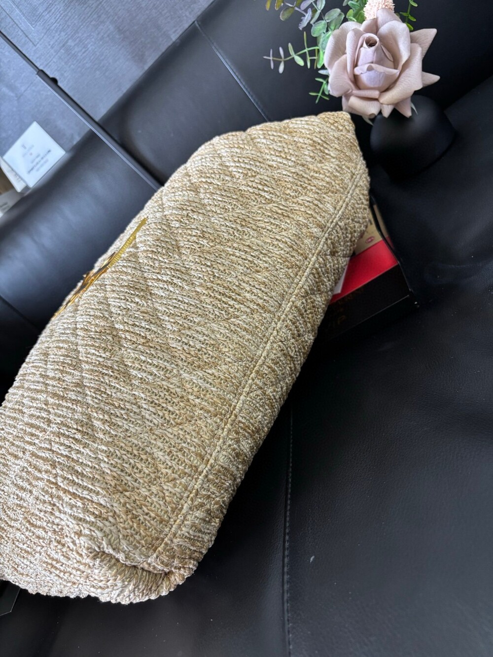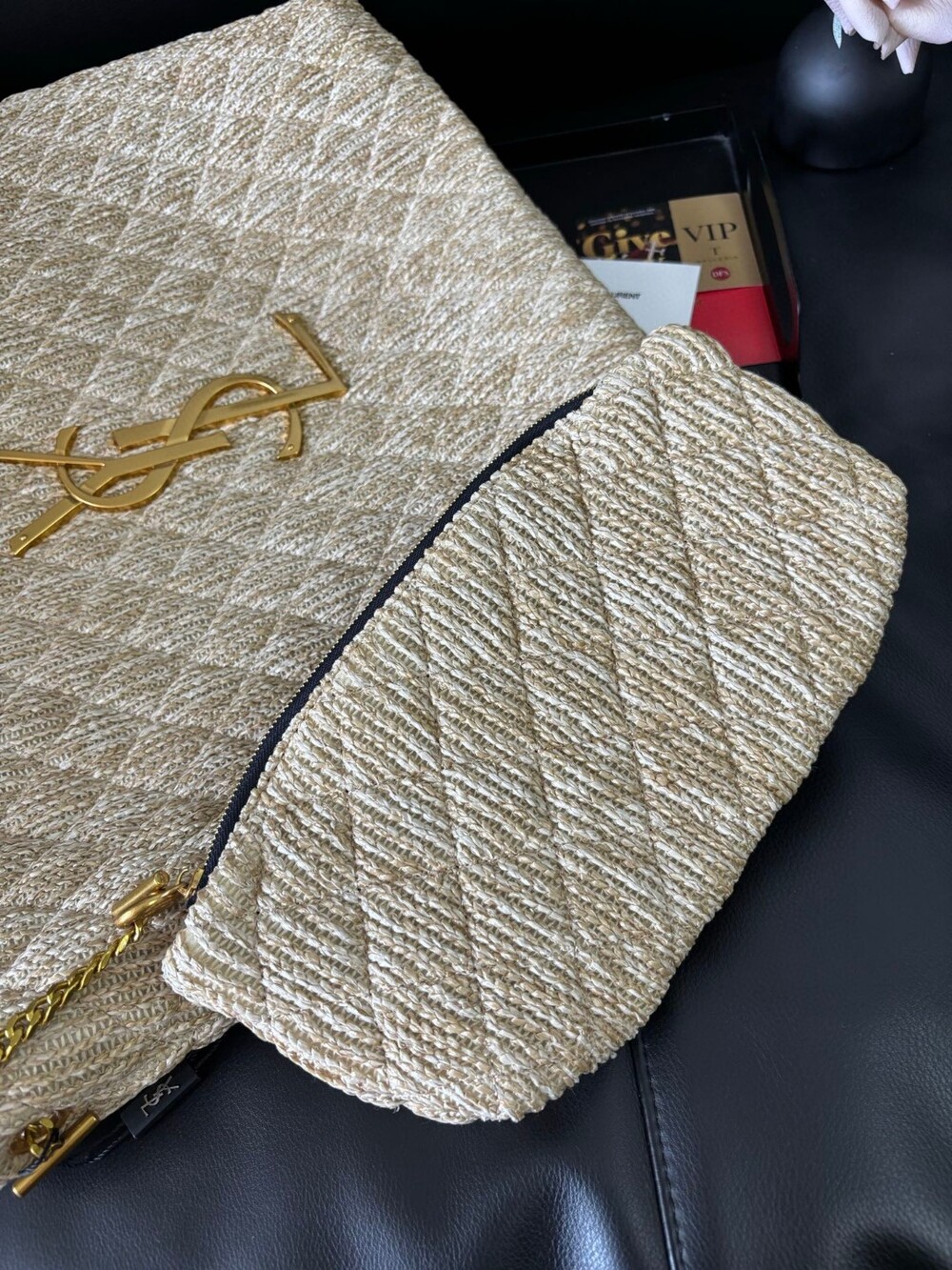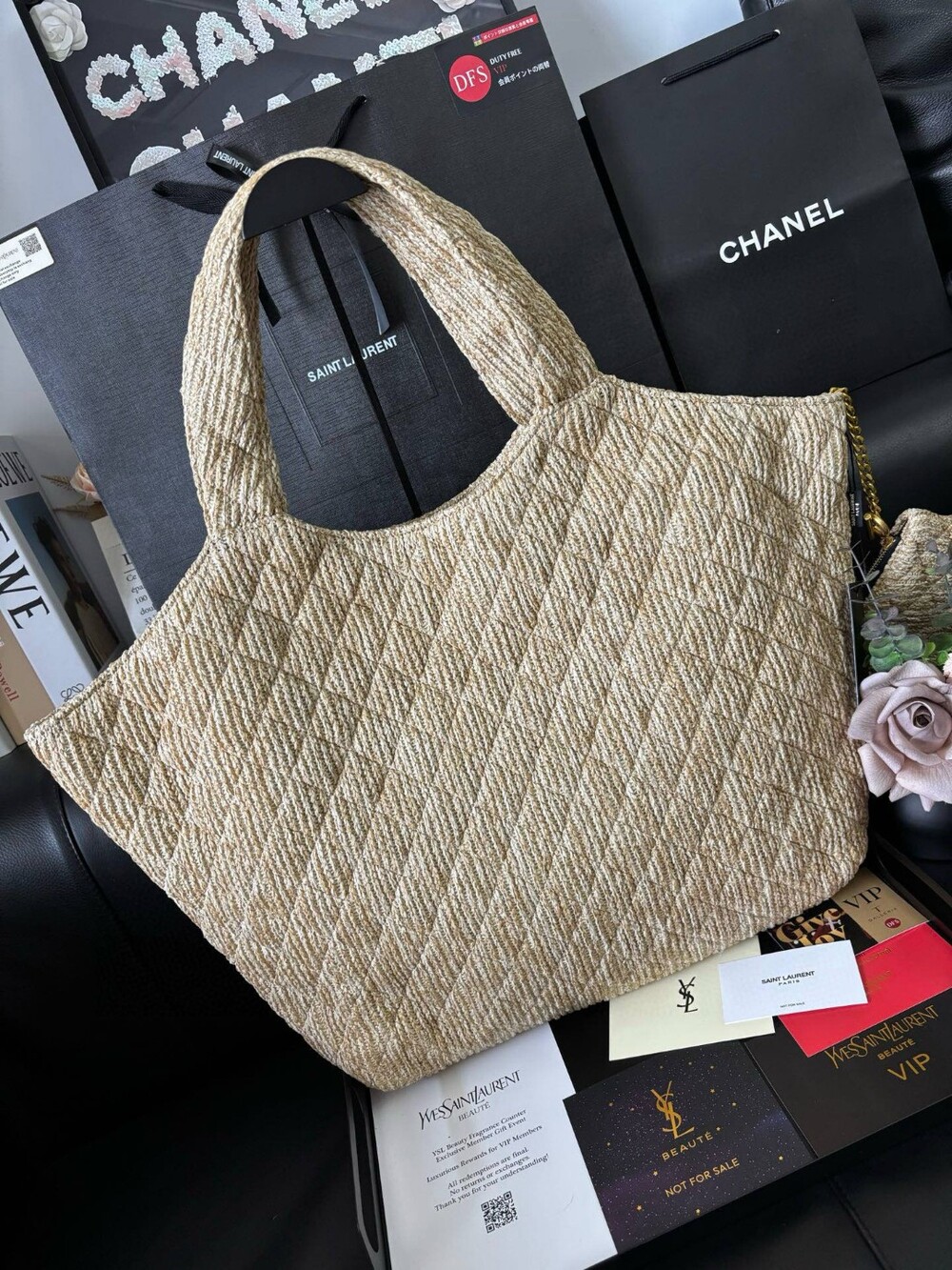 The YSL Large Shopper Tote Bag is crafted from lightweight, delicately woven material, offering a soft yet structured silhouette. Despite its generous size, the bag is surprisingly light. The shimmering YSL interlocking logo adds a refined highlight, making this bag an effortlessly chic match for any outfit.