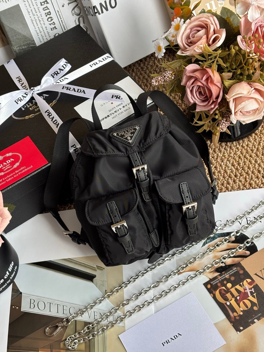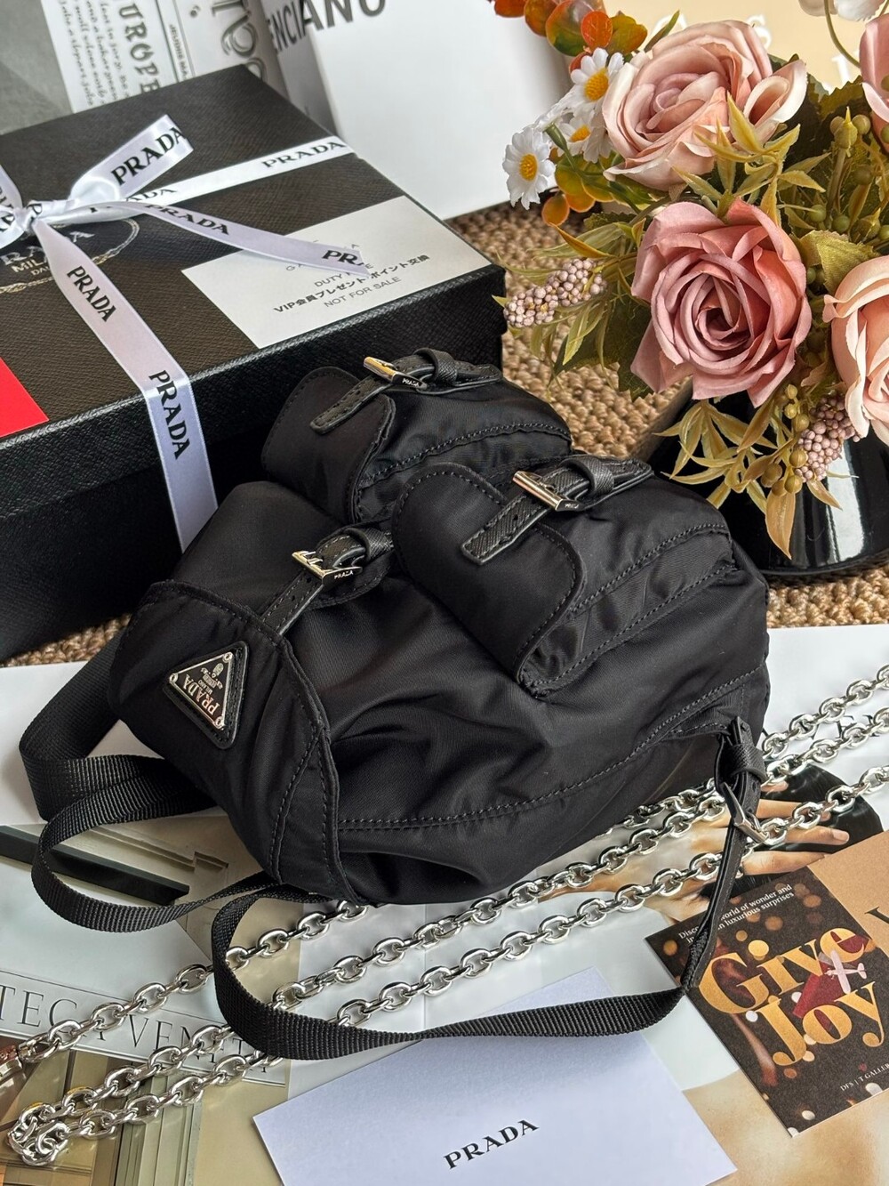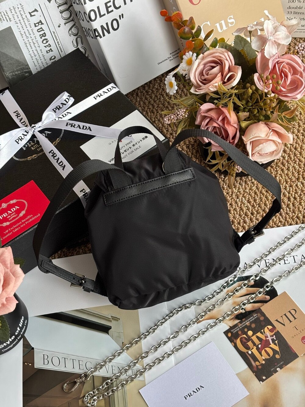 A compact yet iconic Prada Mini Nylon Chain Backpack