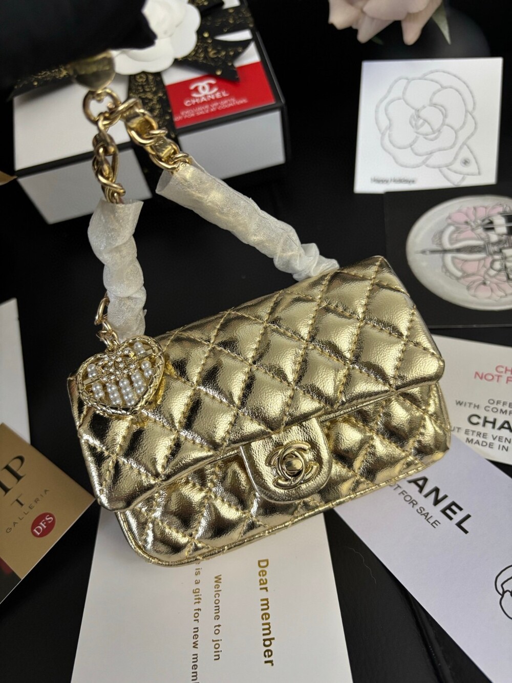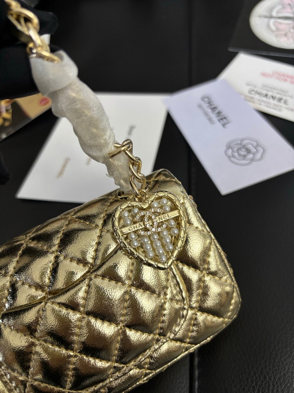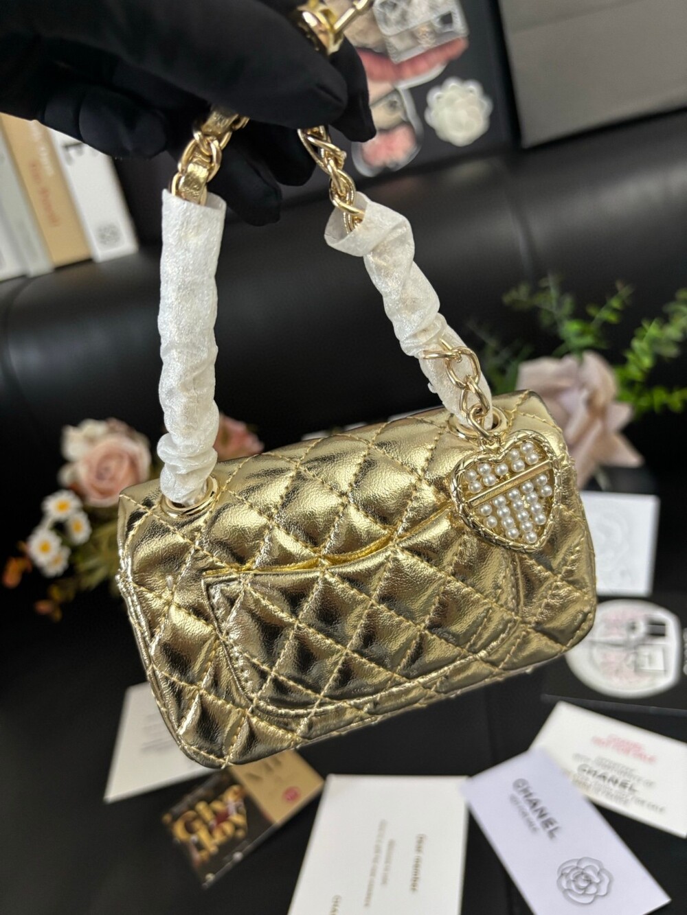 The classic black quilted texture pairs perfectly with the heart-shaped pearl charm,