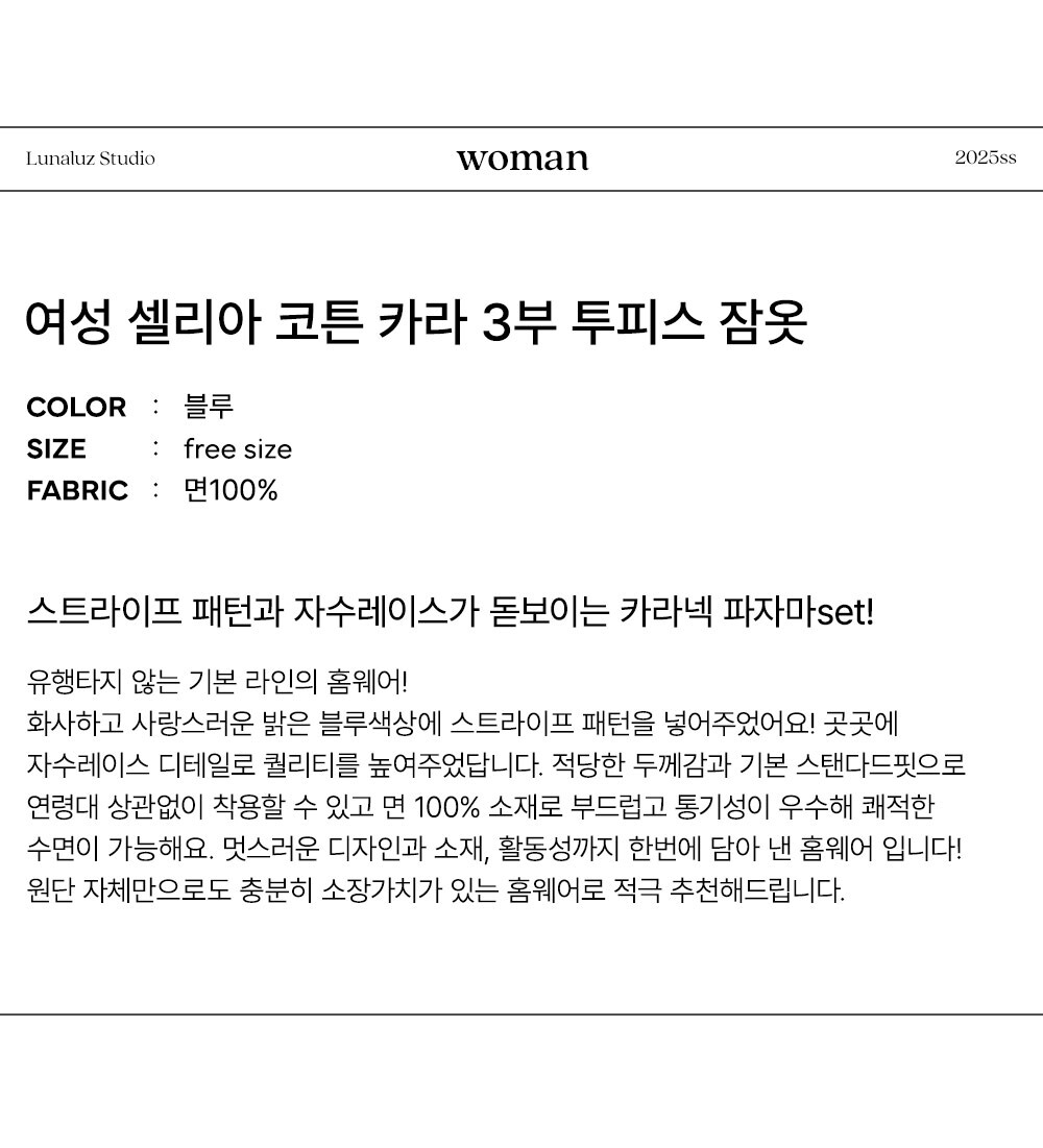 여성 셀리아 코튼 카라 3부 투피스 잠옷