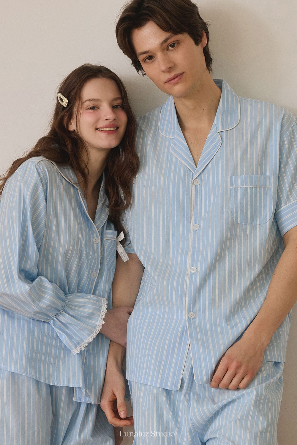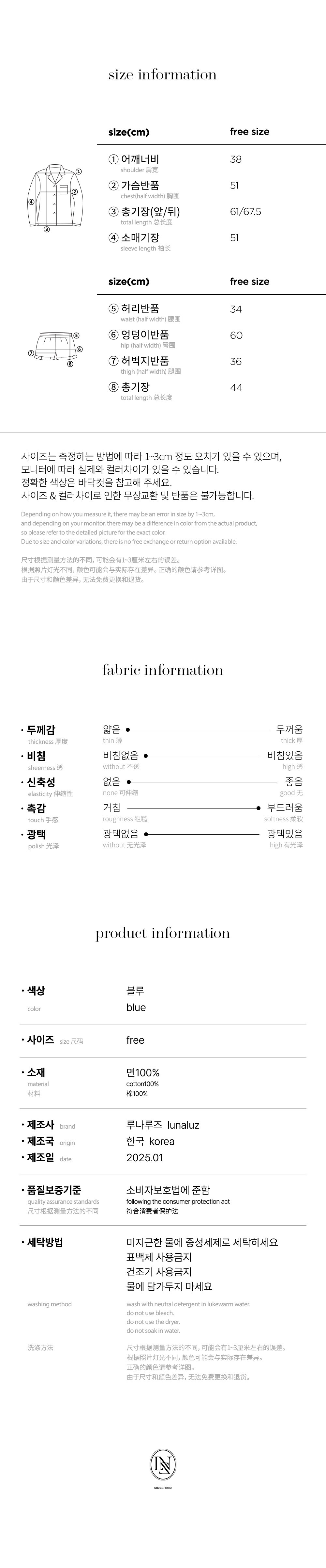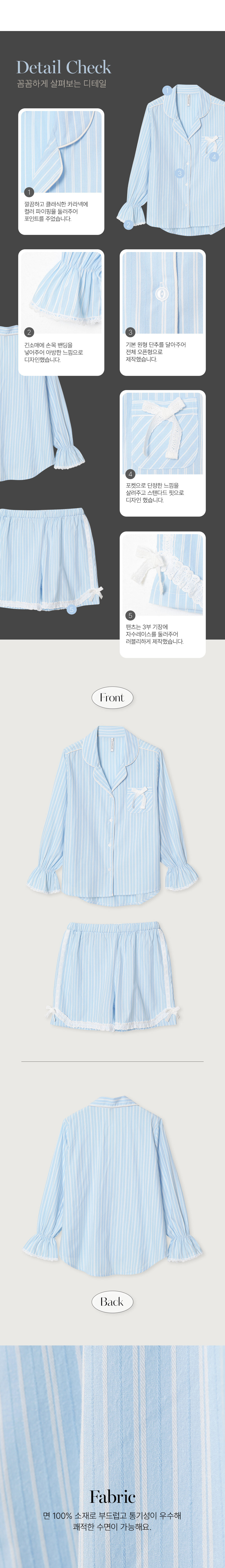 깔끔하고 클래식한 카라넥에 컬러 파이핑을 둘러주어 포인트를 주었습니다. 긴소매에 손목 밴딩을 넣어주어 아방한 느낌으로 디자인했습니다. 기본 원형 단추를 달아주어 전체 오픈형으로 제작했습니다. 포켓으로 단정한 느낌을 살려주고 스탠다드 핏으로 디자인 했습니다. 팬츠는 3부 기장에 자수레이스를 둘러주어 러블리하게 제작했습니다. 뒷 부분에는 앞의 디자인이 조화롭게 이어지도록 디테일을 살려 디자인 했습니다. 100% 국내 제작이라 소재, 디자인, 봉제의 퀄리티가 높습니다.